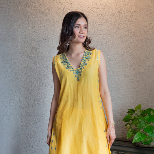 Yellow Chanderi Mirrorwork embroidered Kurta set