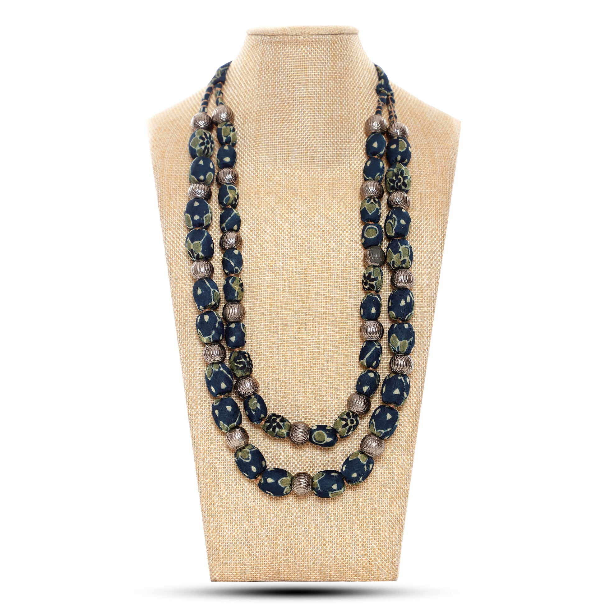 2 layer handmade fabric beaded necklace in ajrakh silk highlighted with metal beads with an adjustable clasp. This zero-waste neckpiece is light and comfortable to wear and blends well with indian and western wear. Comes packed in a fabric pouch and is a perfect gifting option.