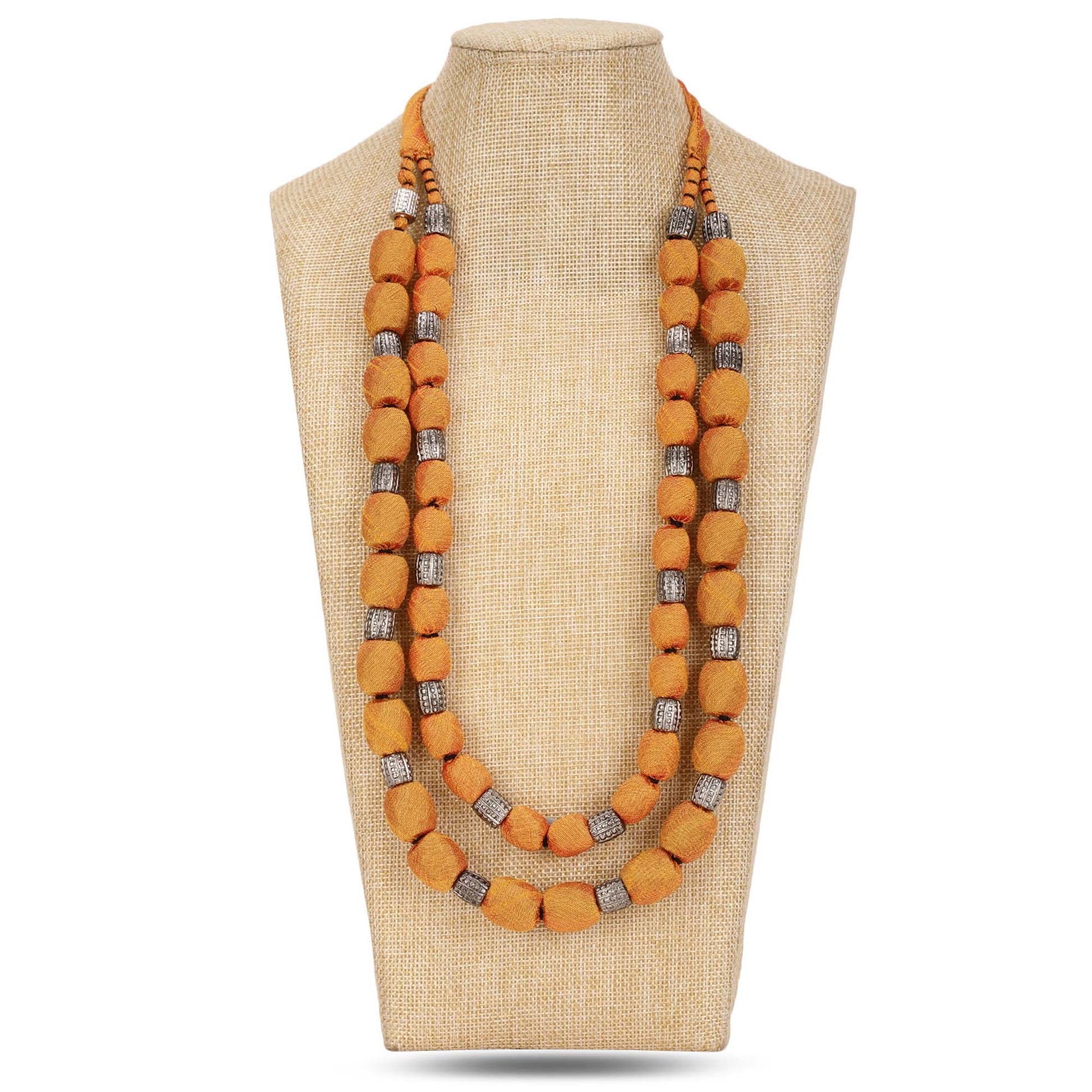 2 layer handmade fabric beaded necklace in mustard silk highlighted with metal beads with an adjustable clasp. This zero-waste neckpiece is light and comfortable to wear and blends well with indian and western wear. Comes packed in a fabric pouch and is a perfect gifting option.
