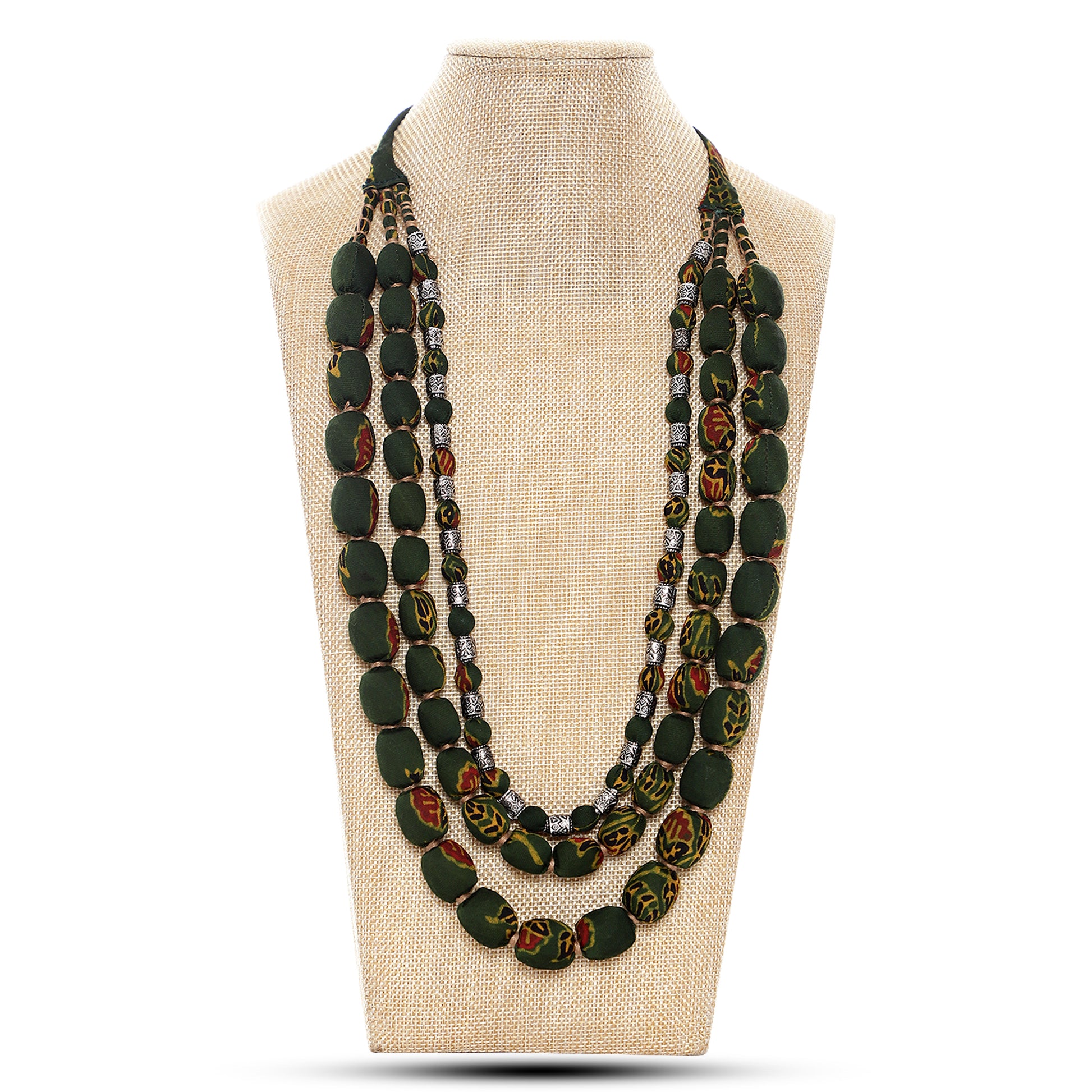 3 layer handmade fabric beaded necklace in ajrakh silk highlighted with metal beads with an adjustable clasp. This zero-waste neckpiece is light and comfortable to wear and blends well with indian and western wear. Comes packed in a fabric pouch and is a perfect gifting option.