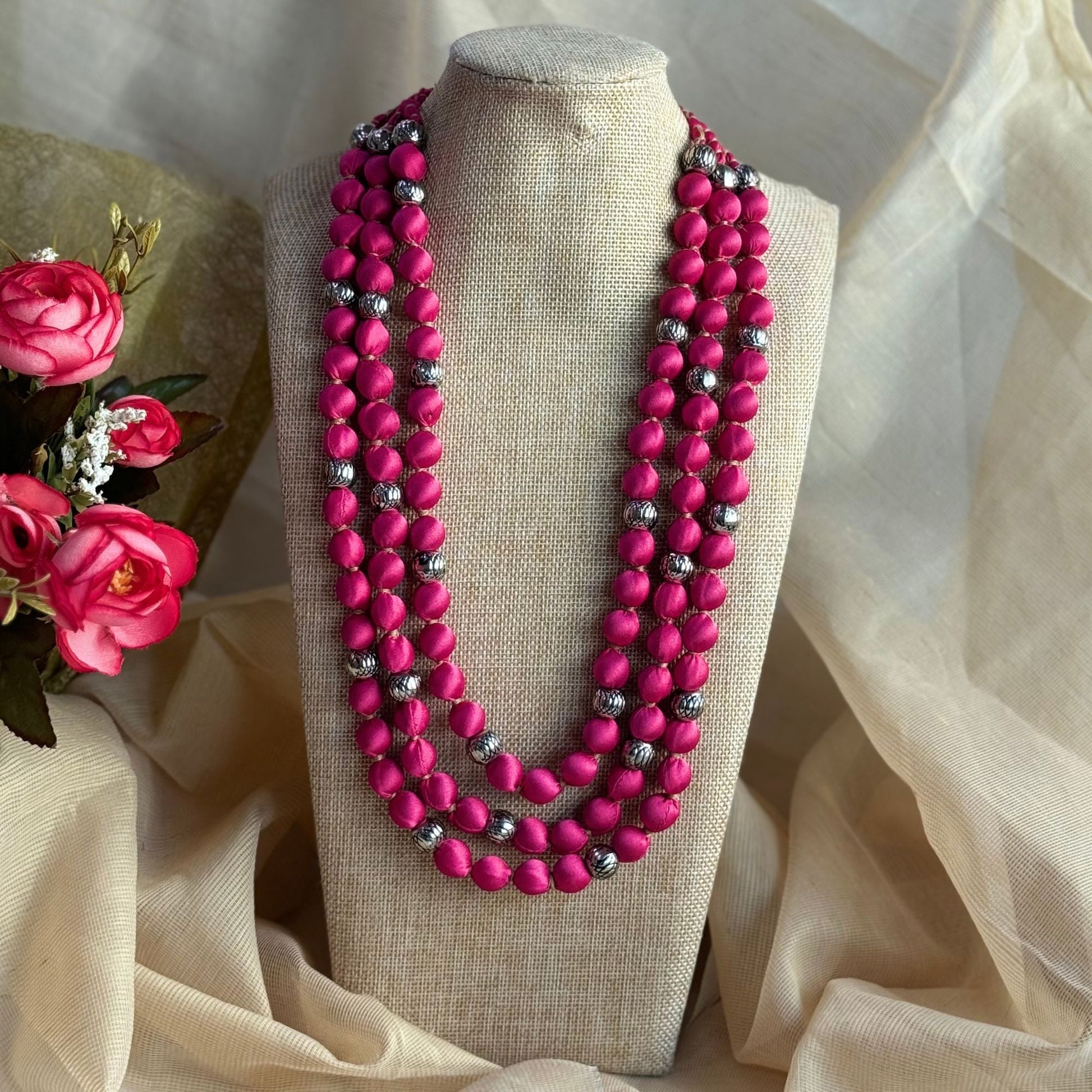 3 layer handmade fabric beaded necklace in satin highlighted with metal beads and comes with an adjustable clasp. This zero-waste neckpiece is light and comfortable to wear and blends well with indian and western wear. Comes packed in a fabric pouch and is a perfect gifting option.
