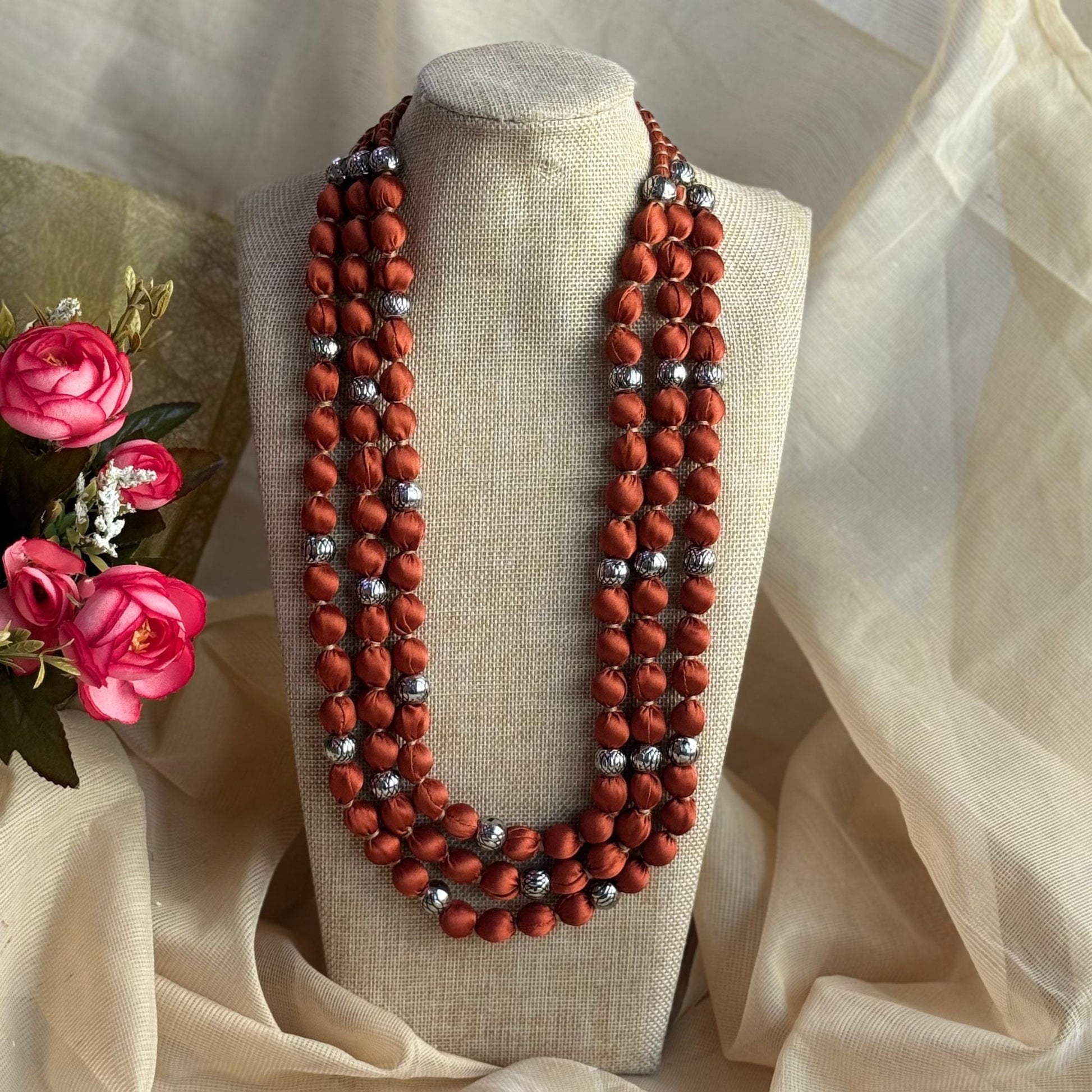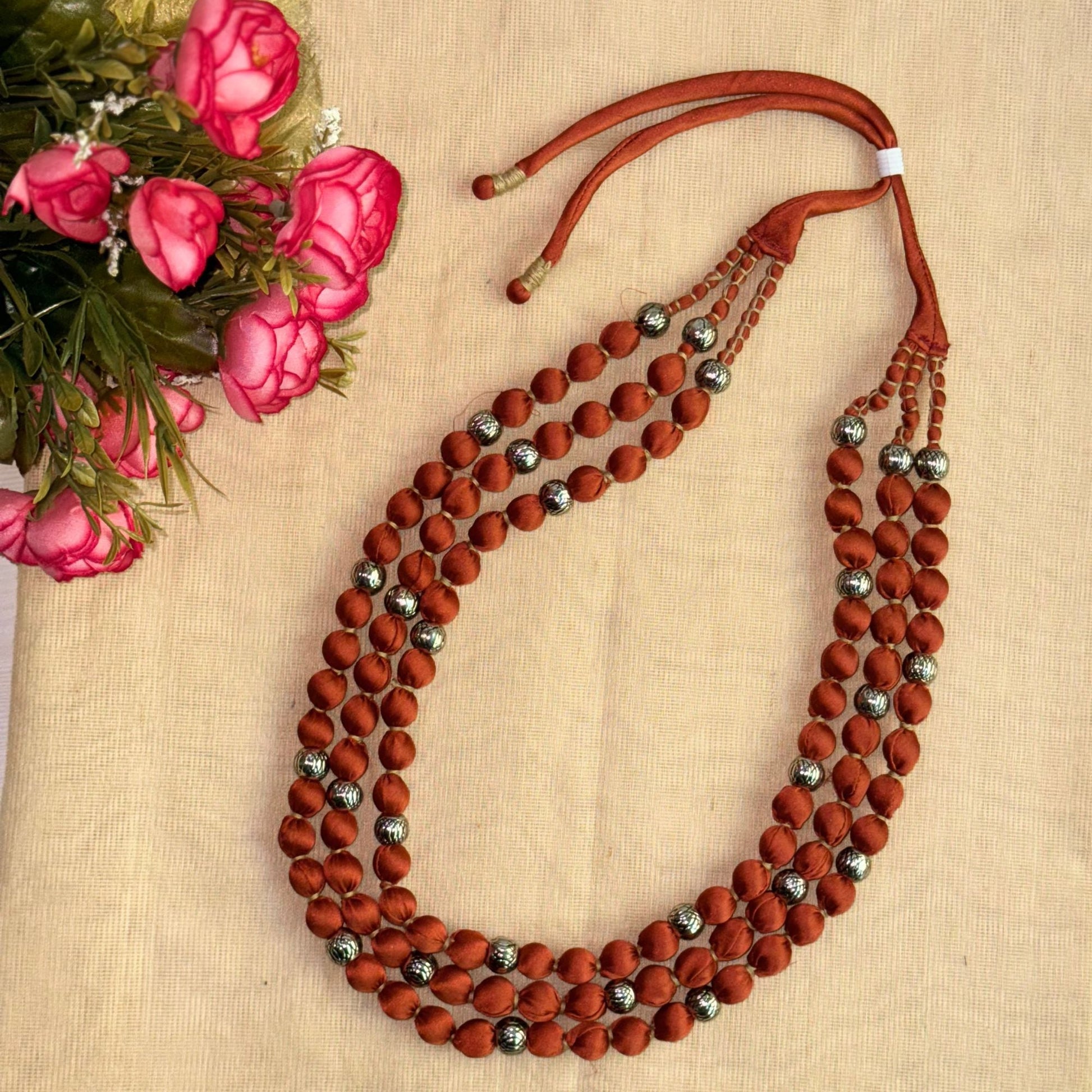 3 layer handmade fabric beaded necklace in satin highlighted with metal beads and comes with an adjustable clasp. This zero-waste neckpiece is light and comfortable to wear and blends well with indian and western wear. Comes packed in a fabric pouch and is a perfect gifting option.