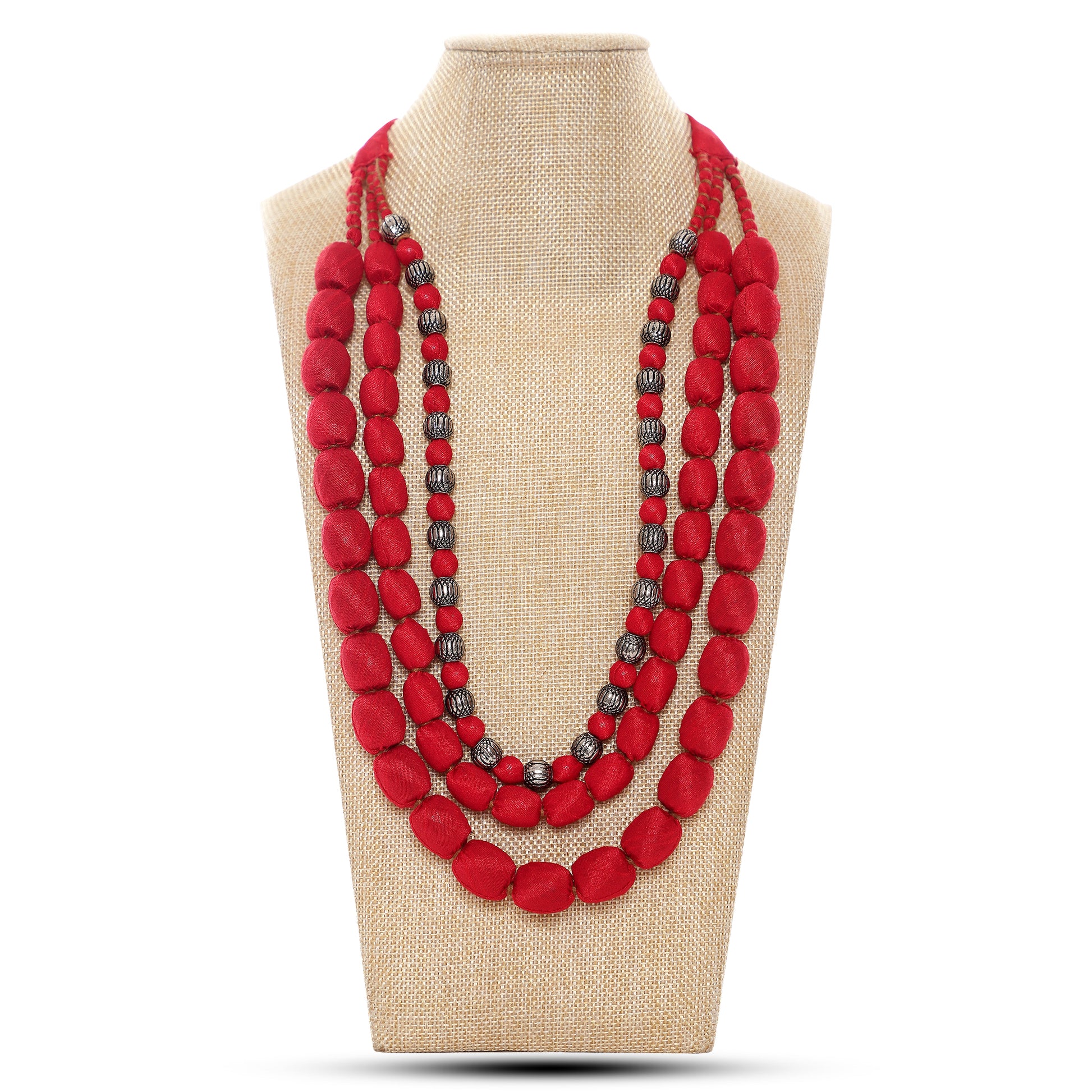 3 layer handmade fabric beaded necklace in red silk highlighted with metal beads with an adjustable clasp. This zero-waste neckpiece is light and comfortable to wear and blends well with indian and western wear. Comes packed in a fabric pouch and is a perfect gifting option.