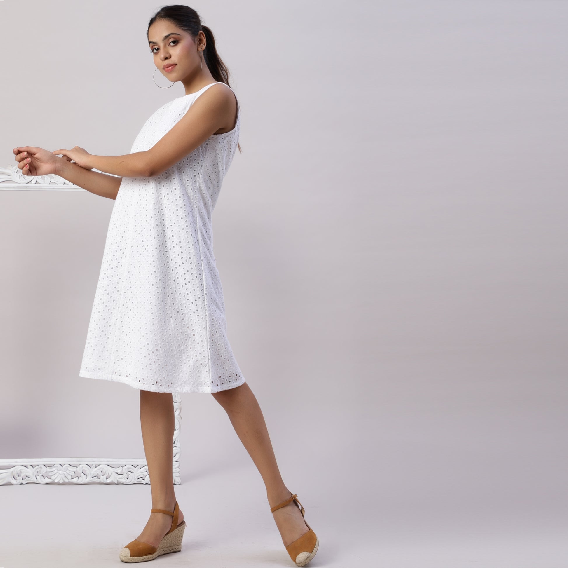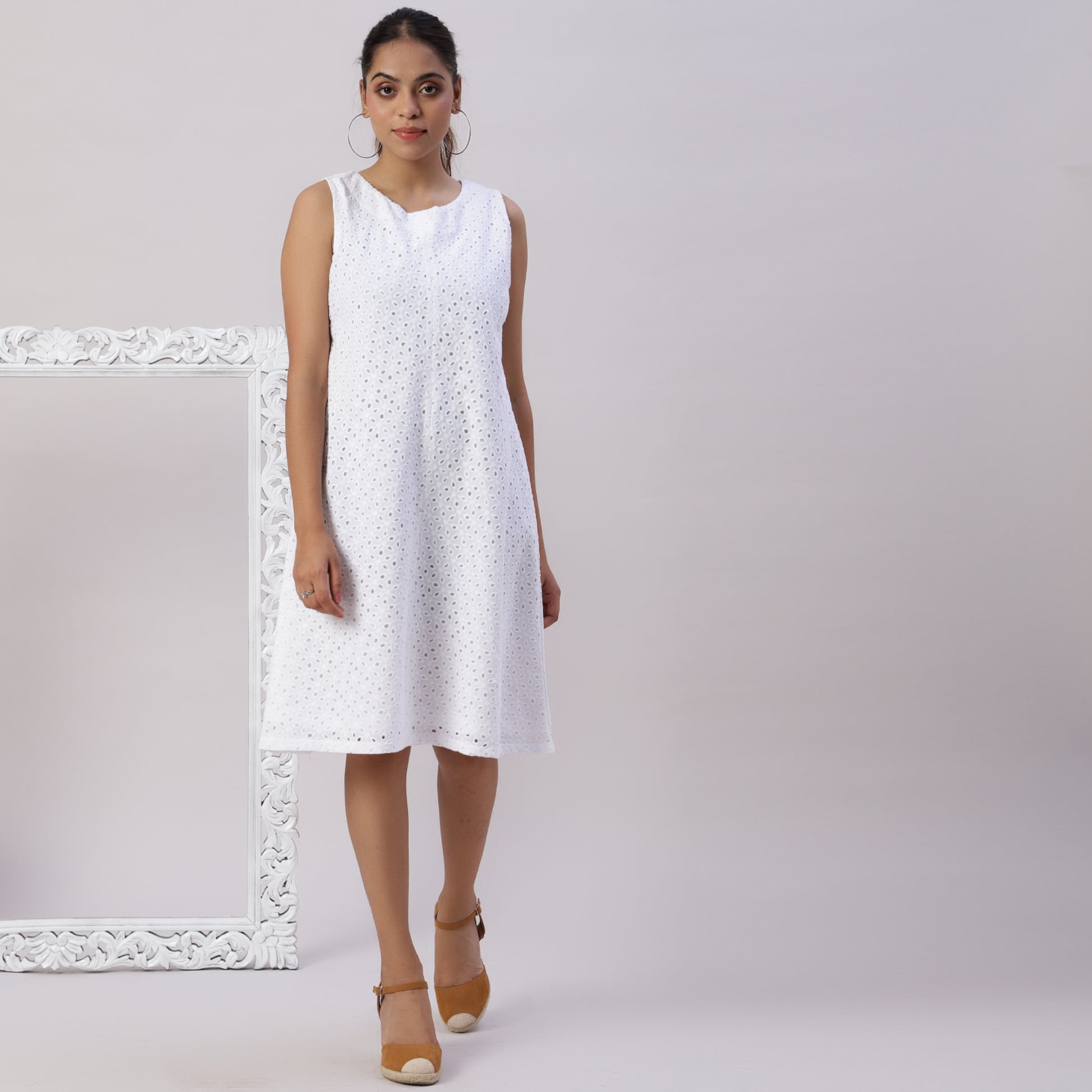 Sleeveless schifly A-line dress in a pristine shade of white. Perfect summer dress for breezy summer days. Pair it with stappy sandals or wedges for a chic look.