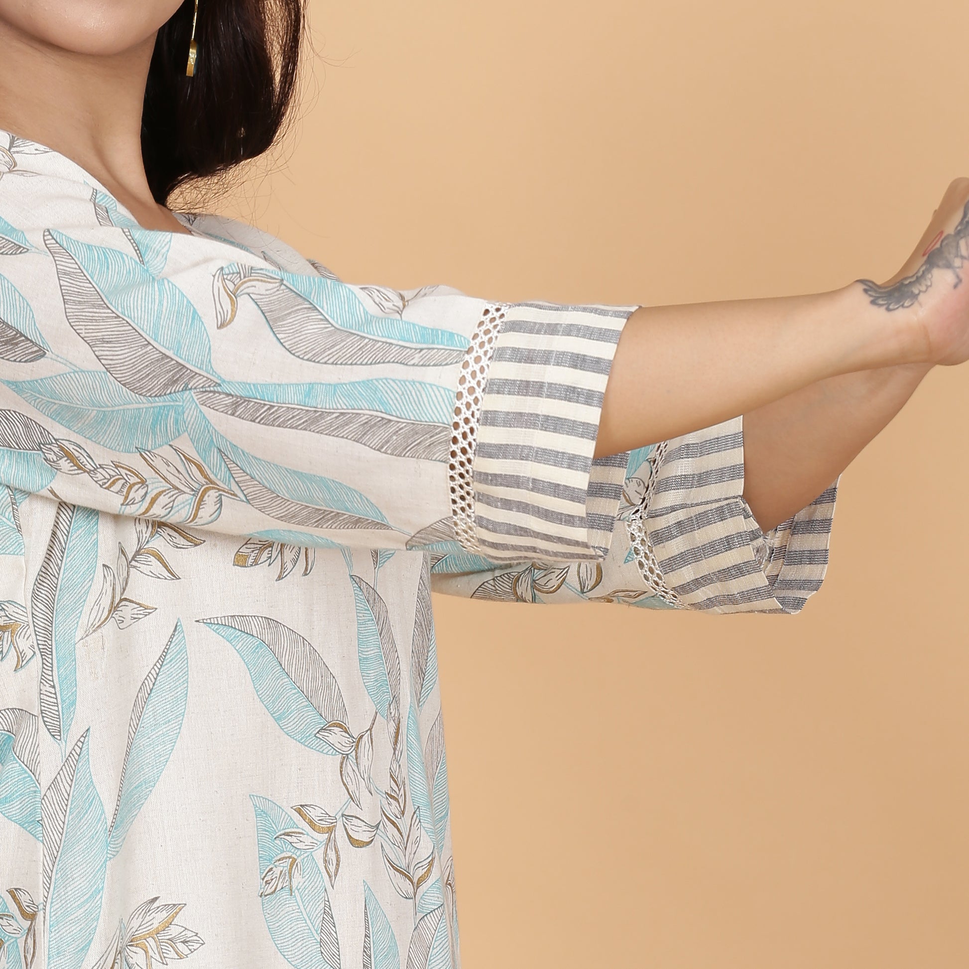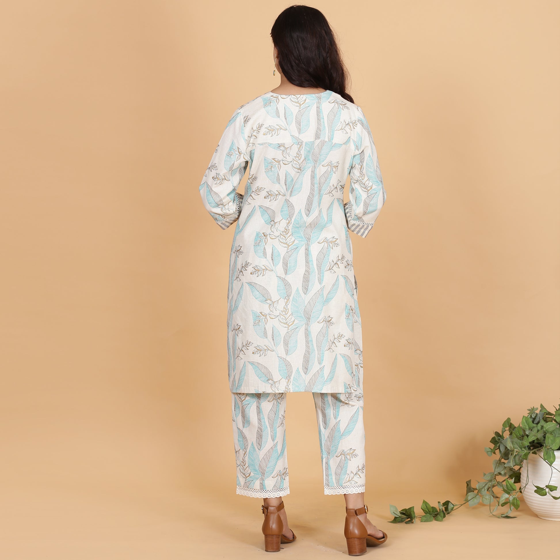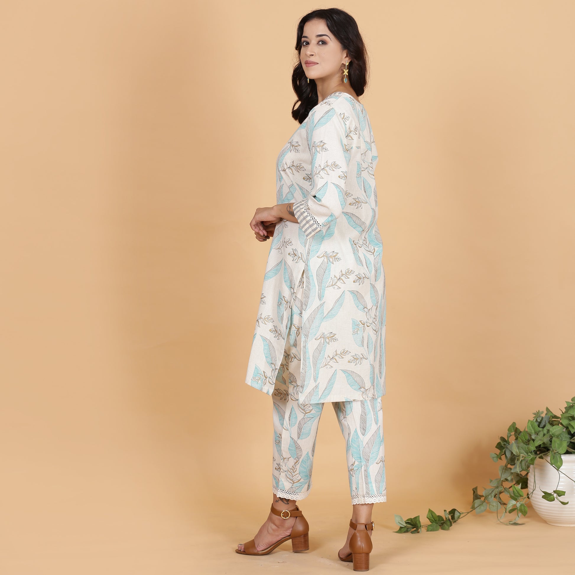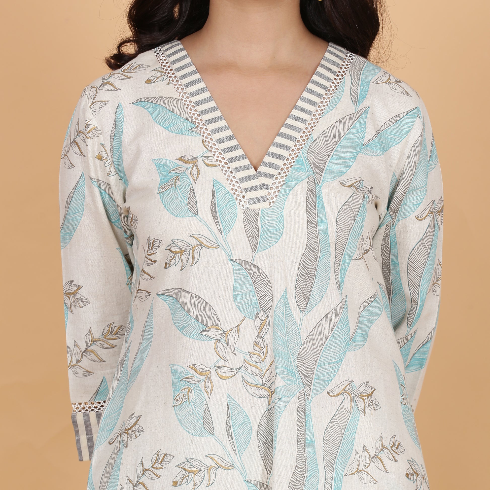 Presenting our cotton flax co-ord set featuring linear art leaves printed in aqua and black with a touch of gold. The V-shaped neckline is adorned with lace and striped fabric, with matching detailing on the sleeves. The trousers feature a curved hem adorned with lace, creating a chic and stylish look.