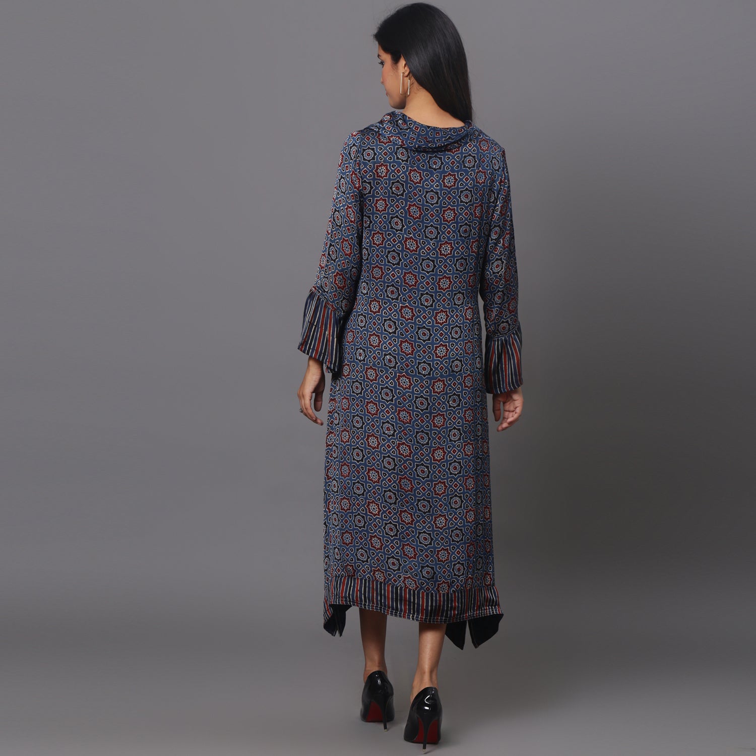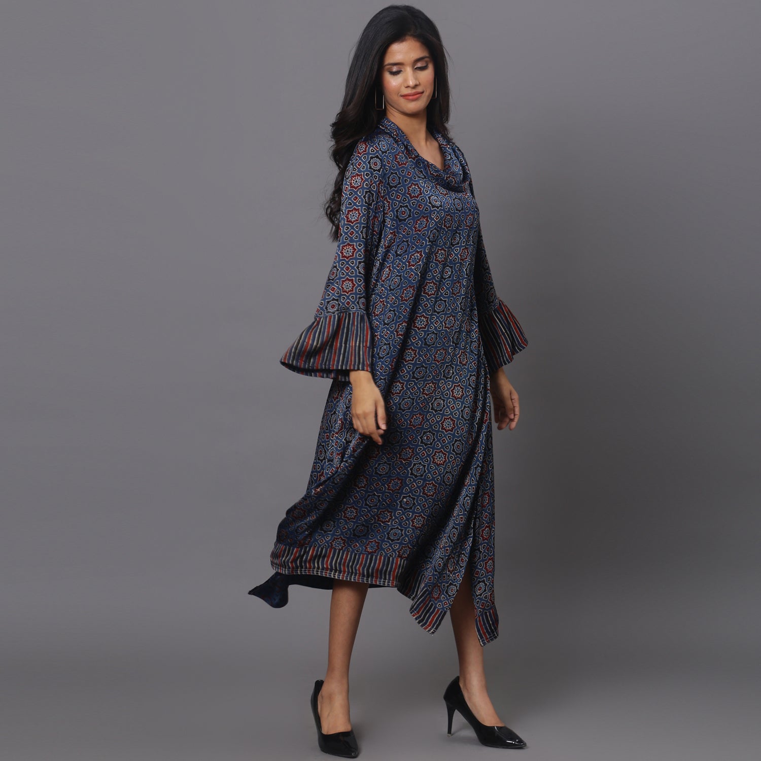 Asymetric cowl neck dress in ajrakh modal silk fabric with flared sleeves.
