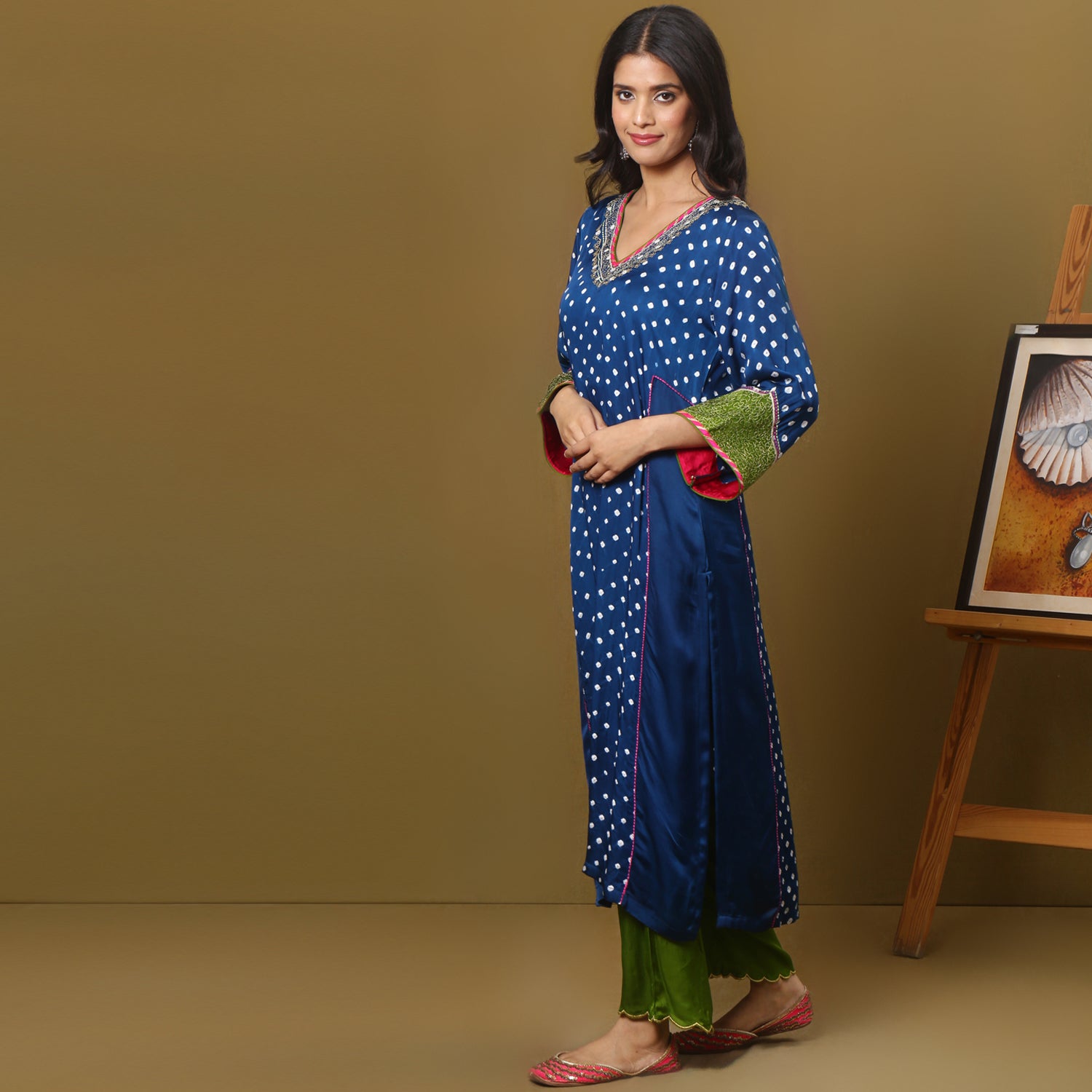 A classic rich navy blue bandhani modal silk a-line kurta with zari detailing on neck and sleeves. It is paired with contrasting silk pants. It is a classic kurta set to add charm in any occasion.