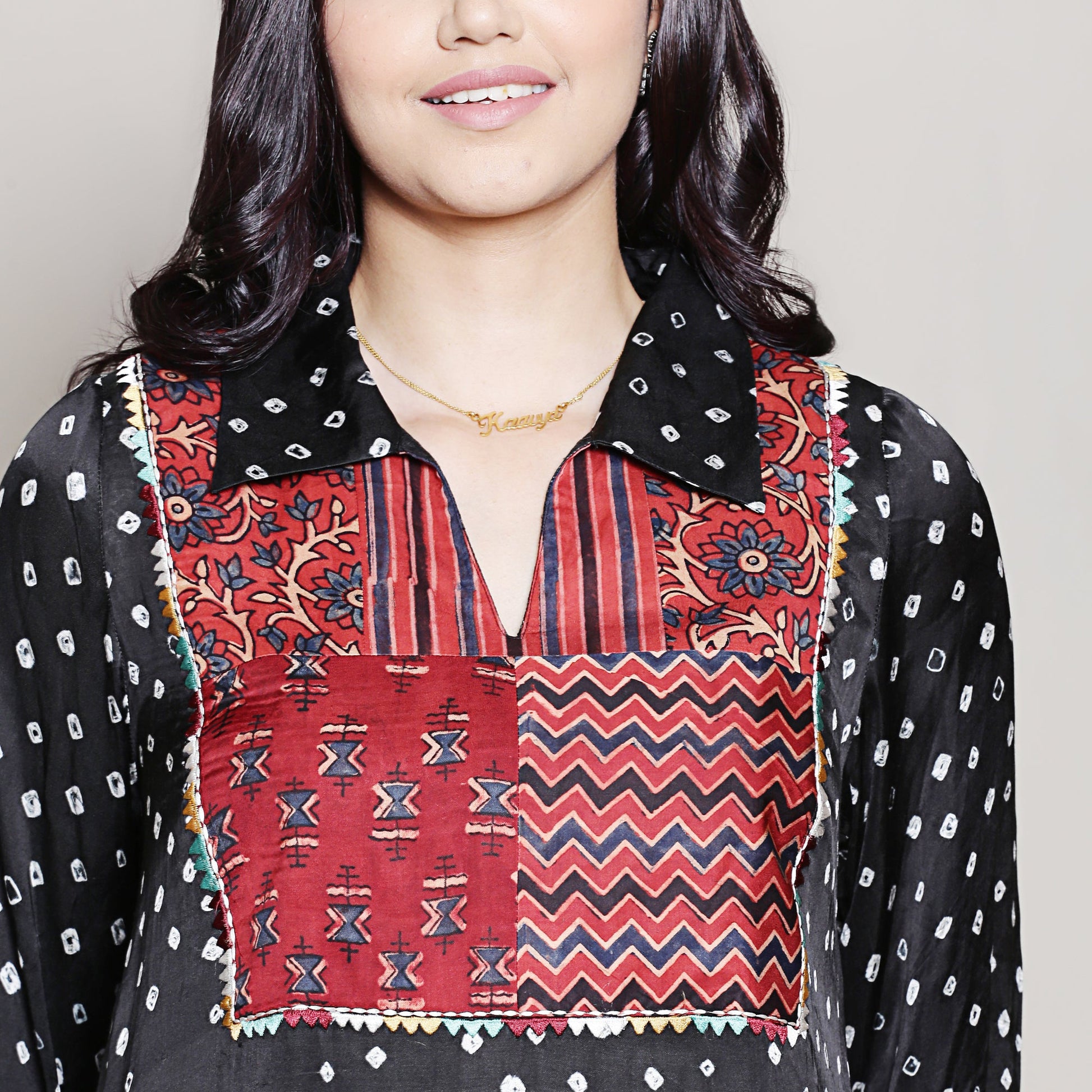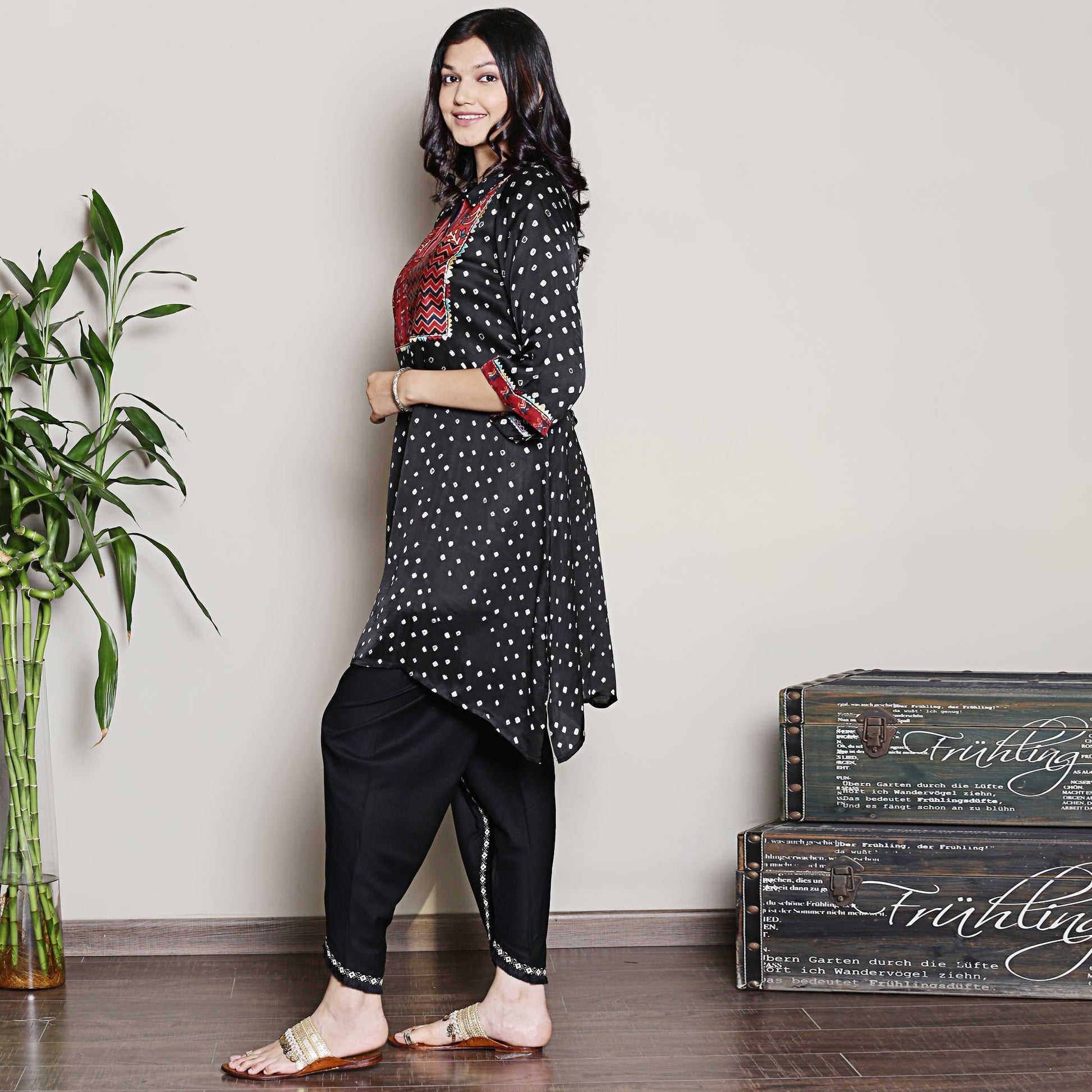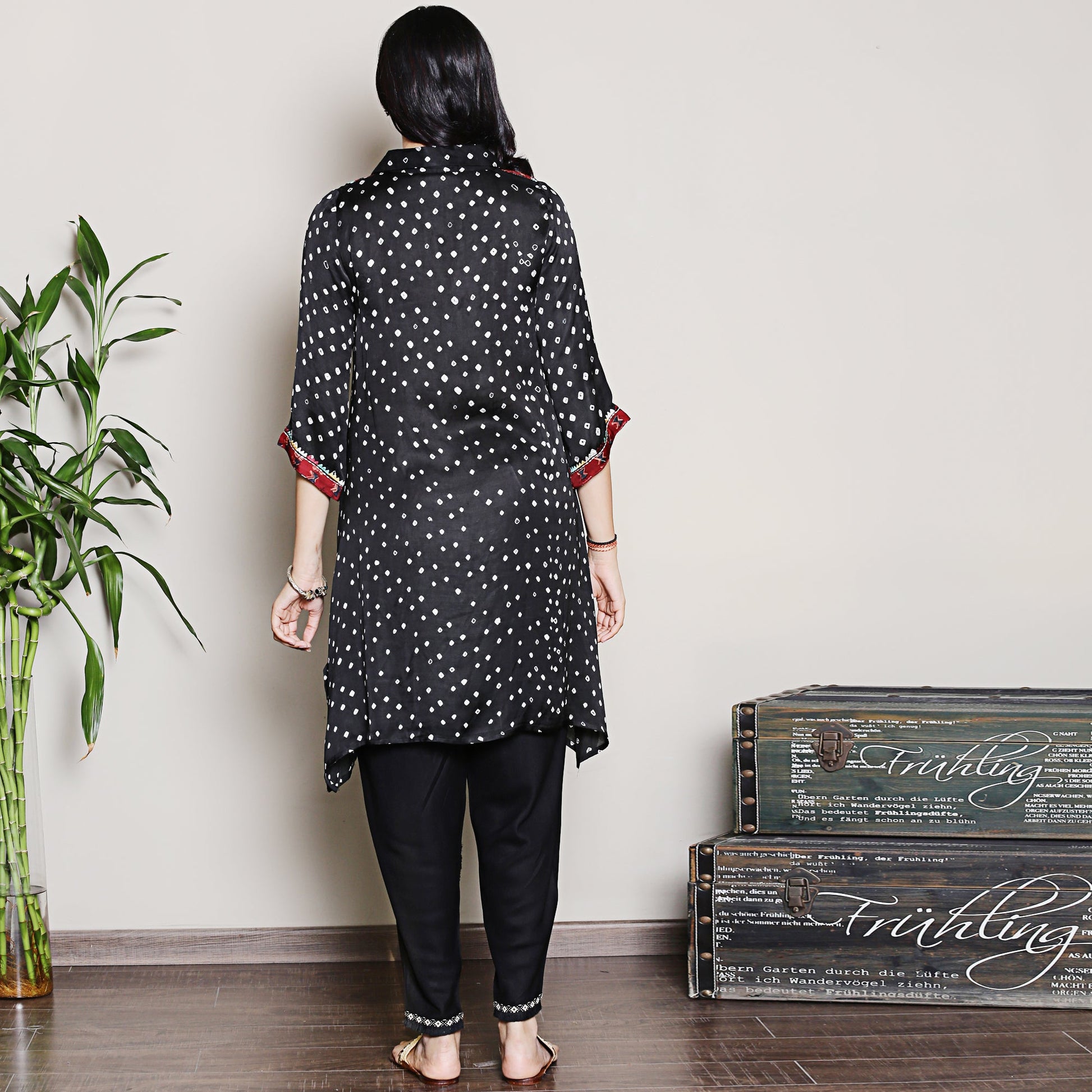 Make a vibrant statement in our bandhani printed black modal silk asymmetric kurta set adorned with patchwork yoke and collared neck. It is paired with black dhoti pants. It's the perfect ensemble for all day comfort.