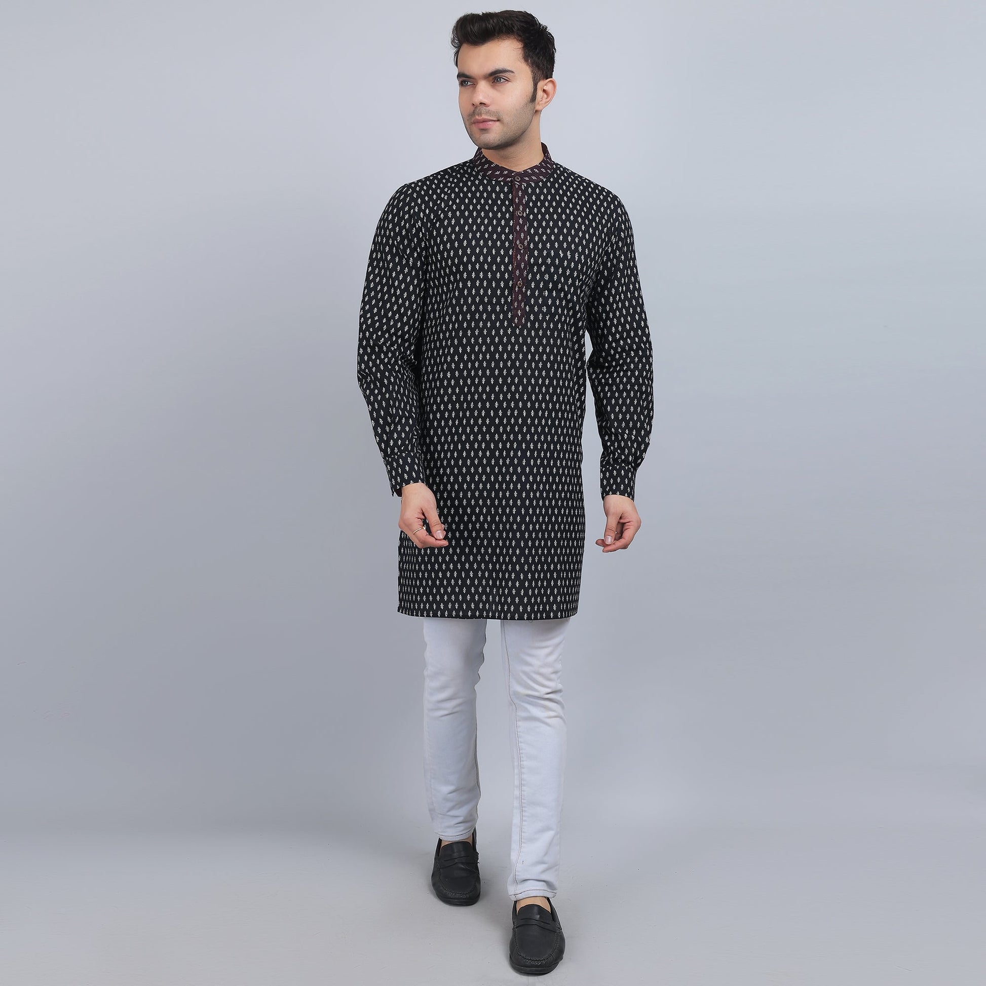 Black printed cotton full-sleeves band collar kurta with shoulder loops and pockets in comfort fit. These comfortable yet stylish kurtas are perfect for casual, festive & relaxed evenings. They can be paired with jeans or straight pyjamas.
