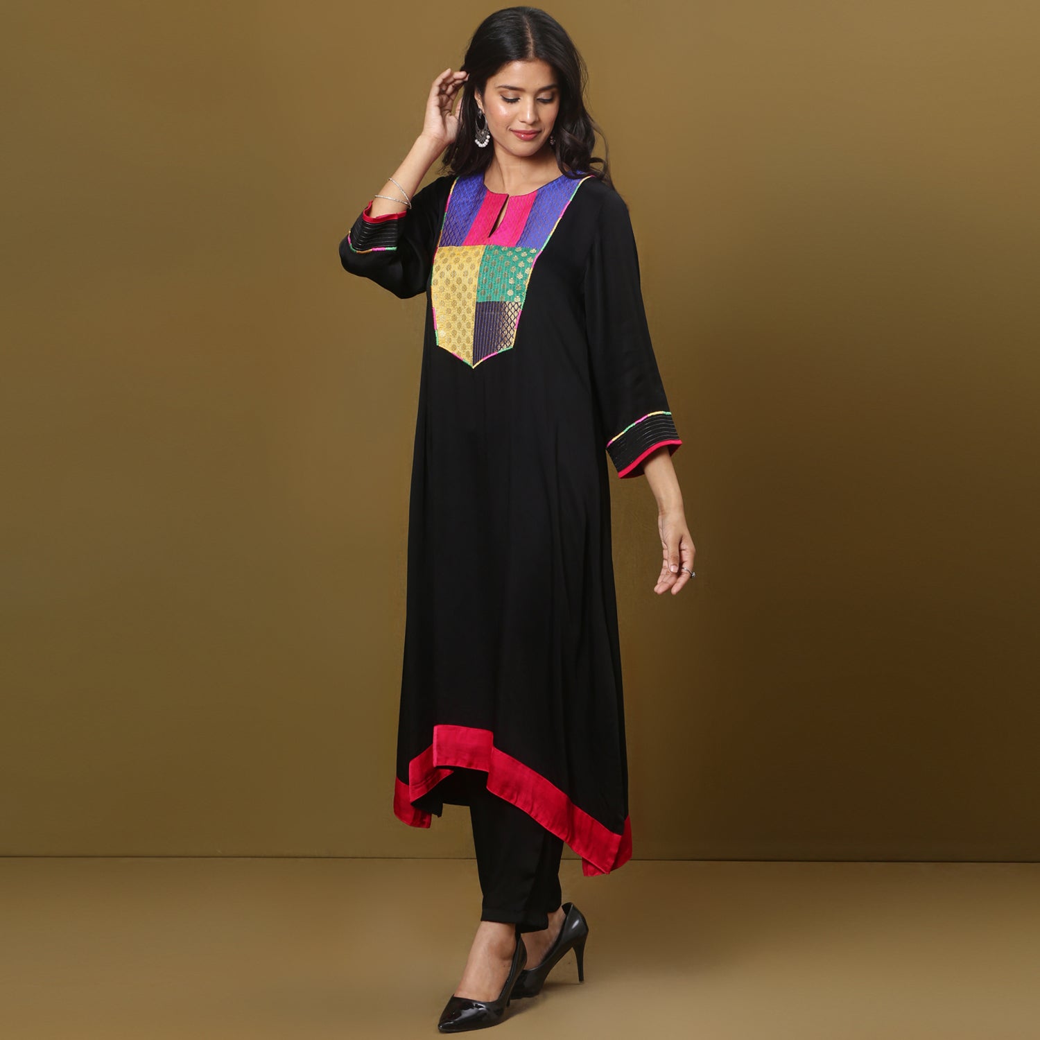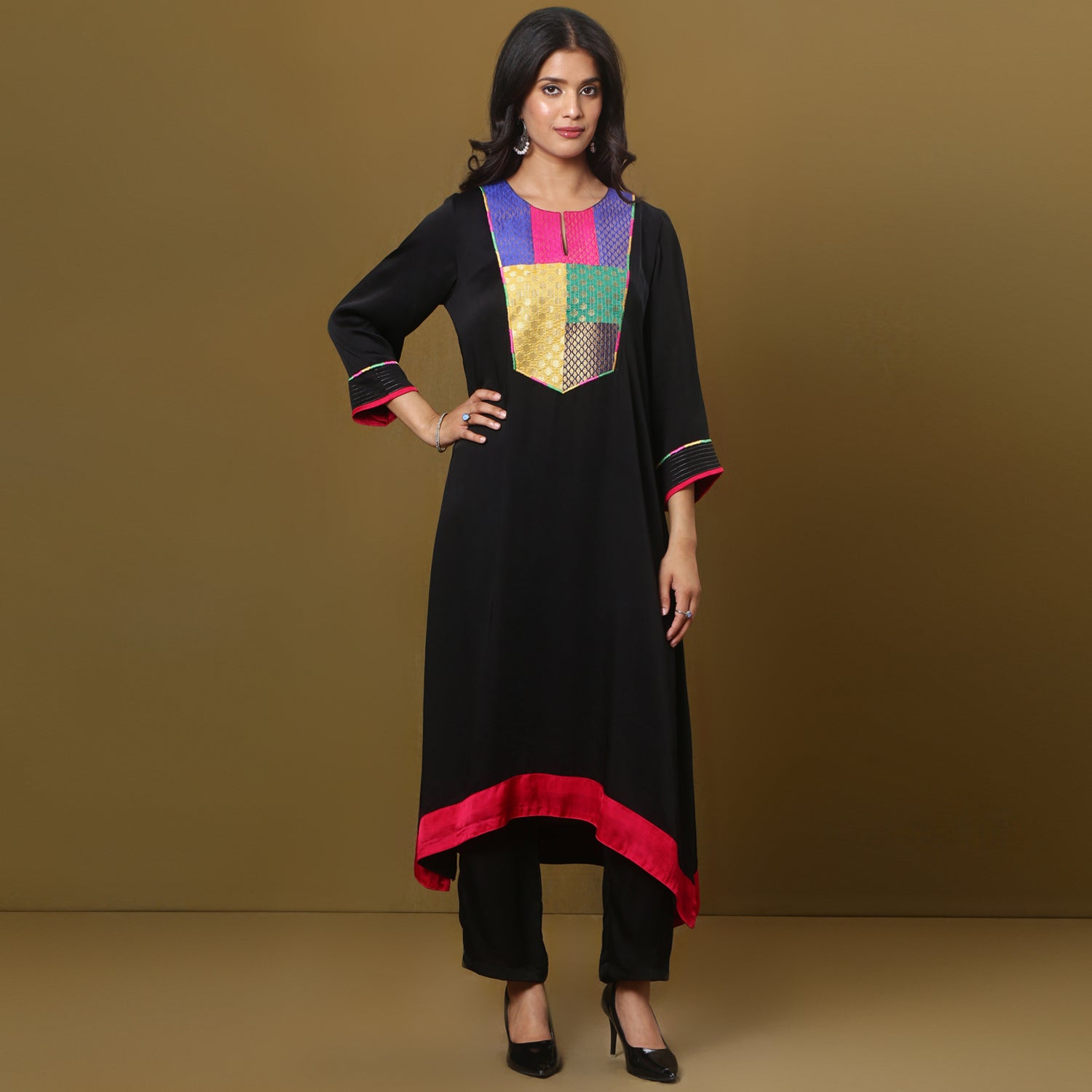 Black modal silk asymmetric kurta with multi-color brocade detailing on yoke and zari threadwork detailing on sleeves. It is paired with black pants. This trendy kurta Set is a perfect choice for casual festive.