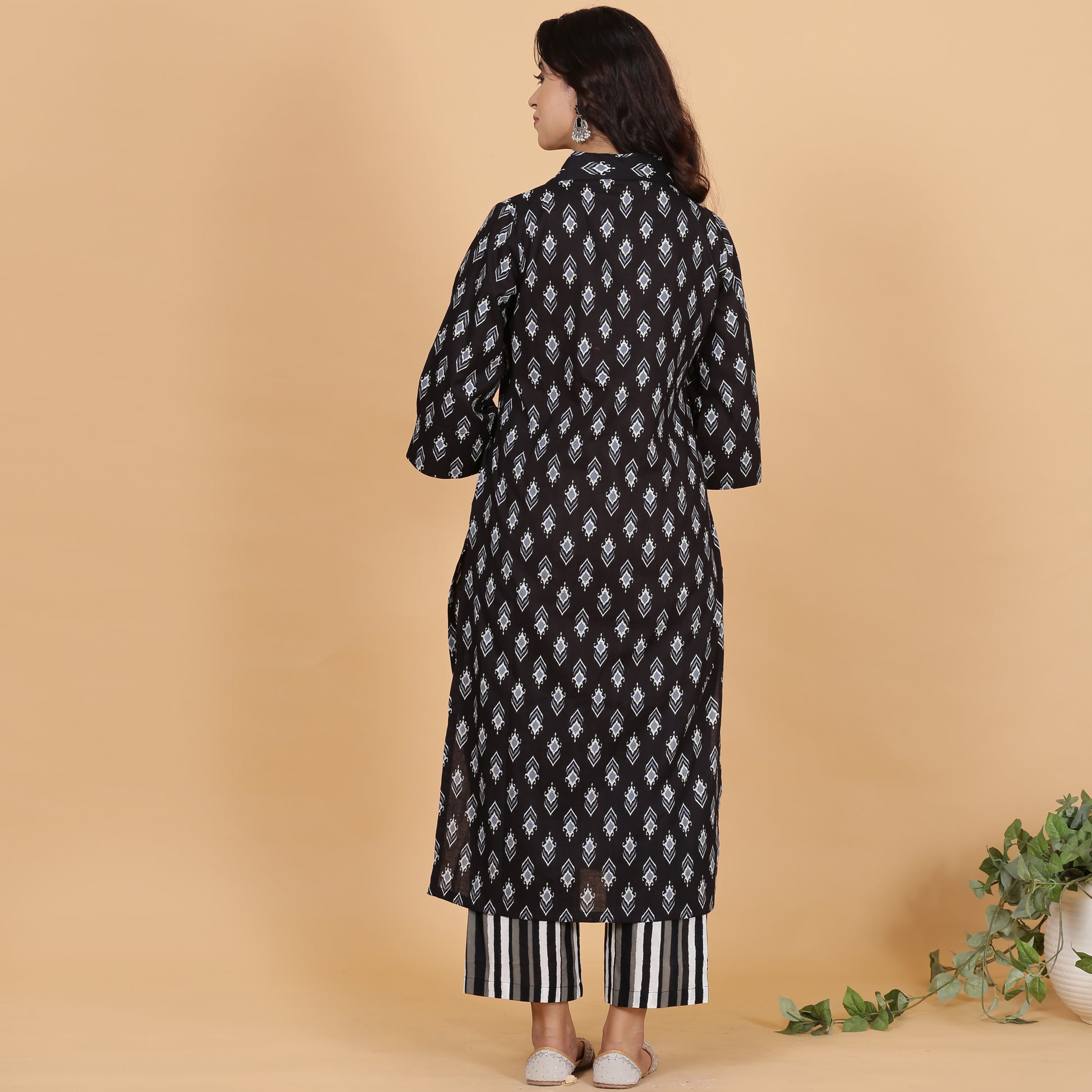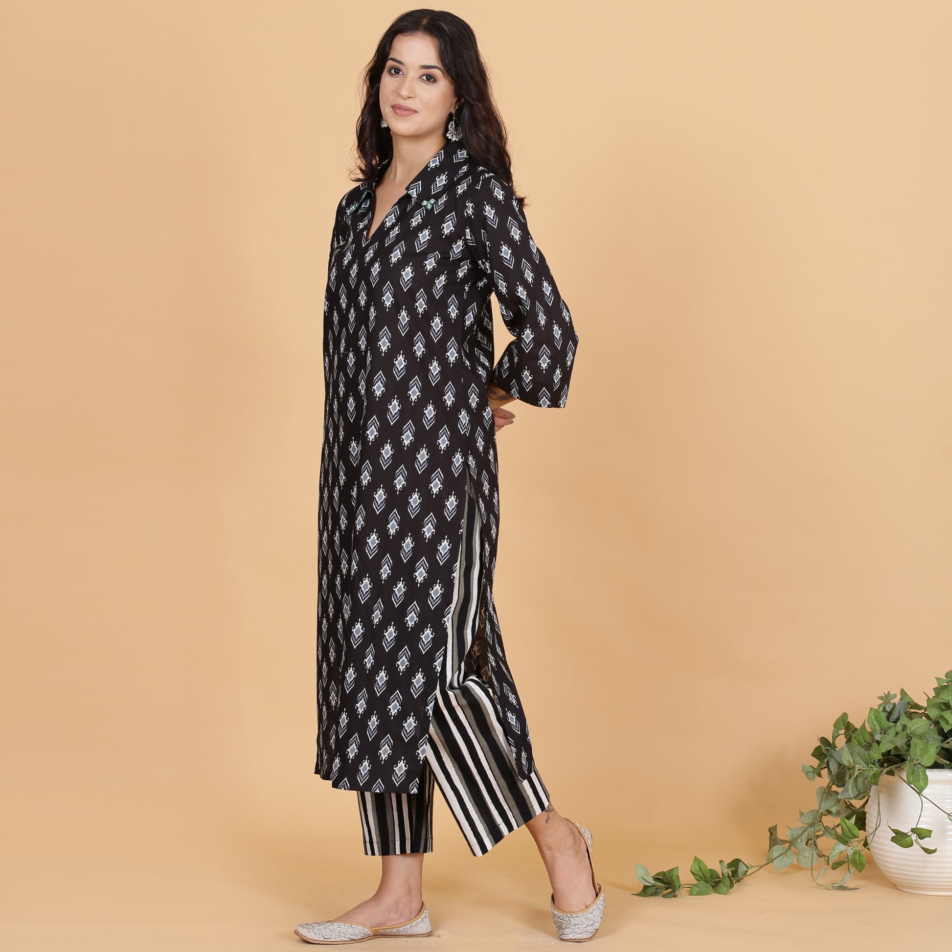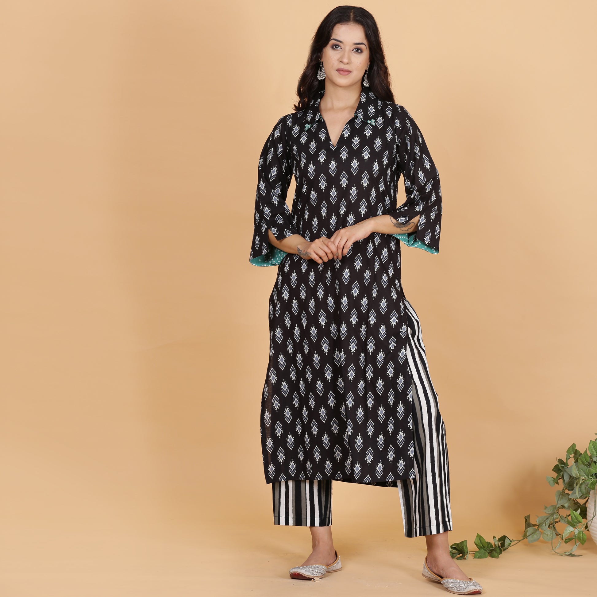 This black ikat co-ord set exudes contemporary style with its bold pattern and chic design.Mirror detailing on the collar and slit open sleeves with contrasting binding make the whole look smart. The top features a striking ikat print, while the striped pants add a modern contrast.