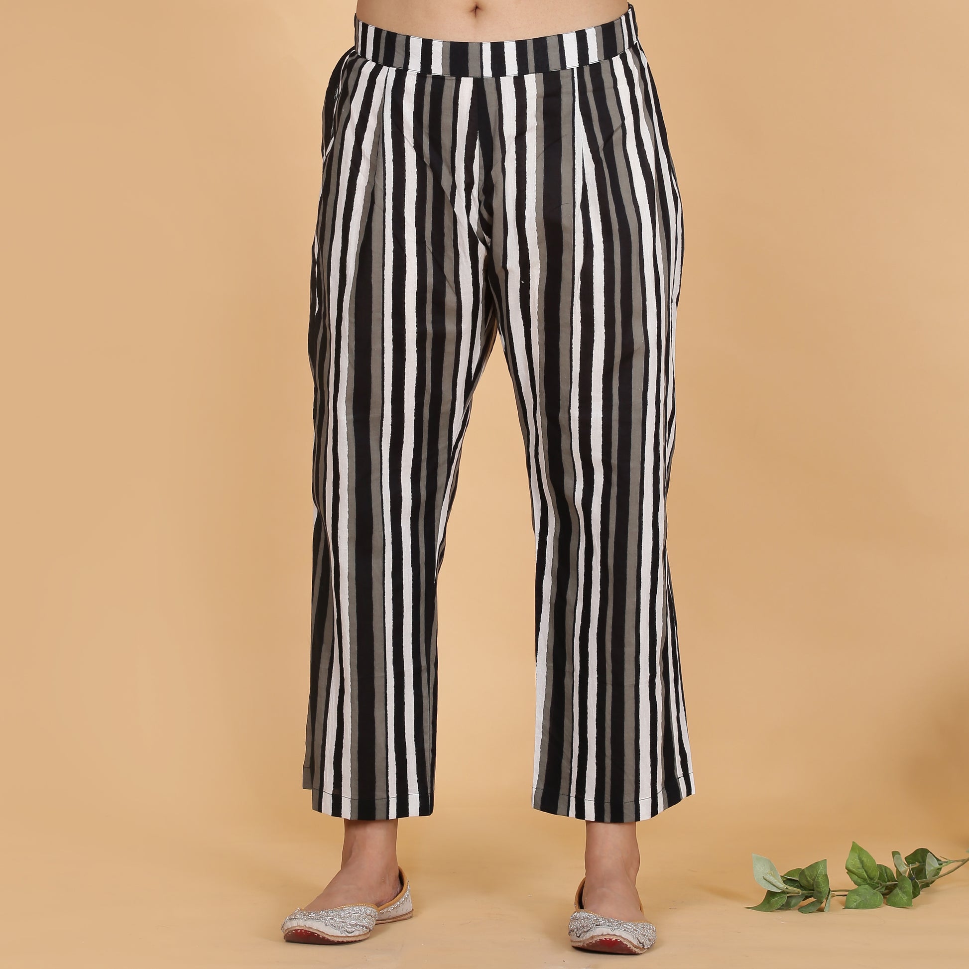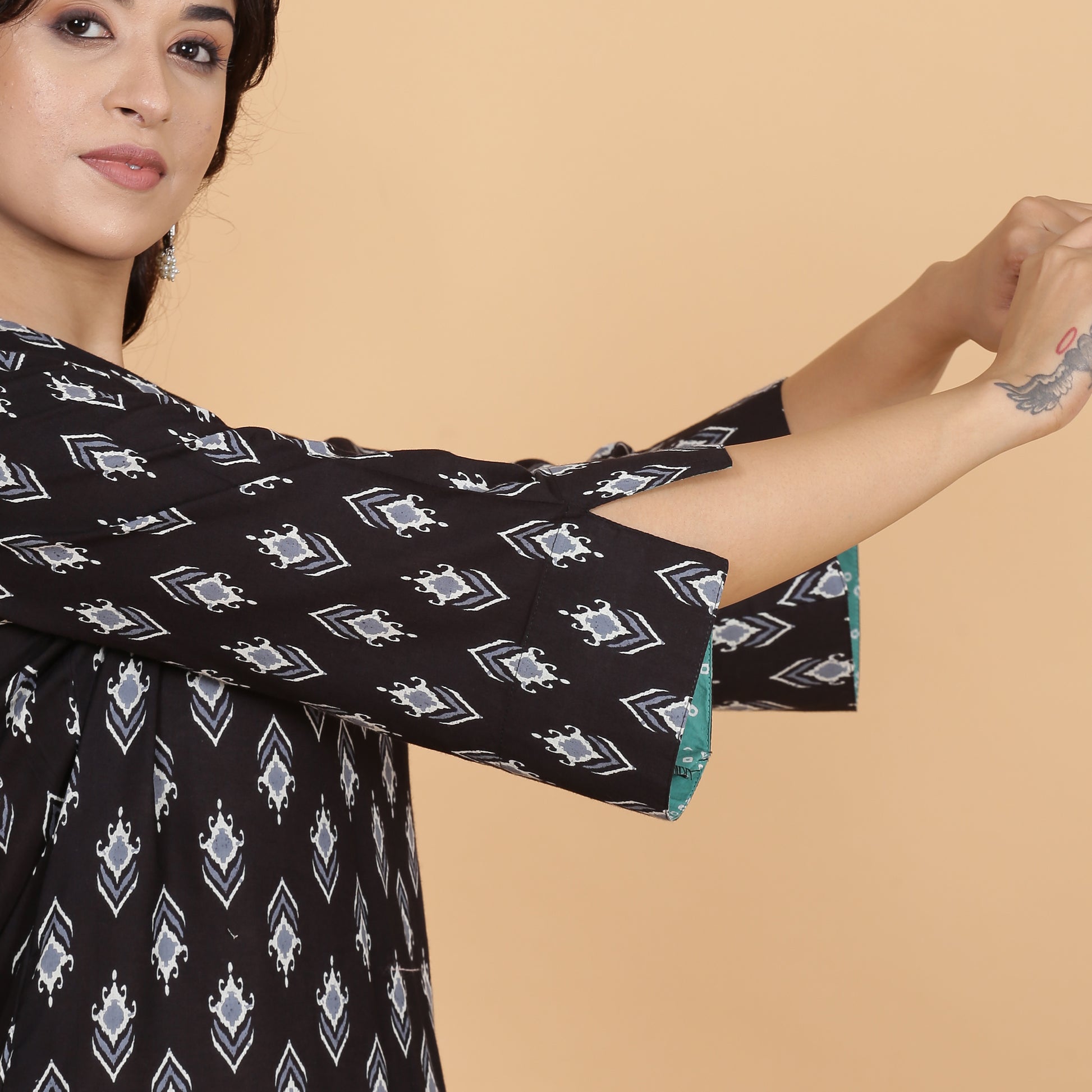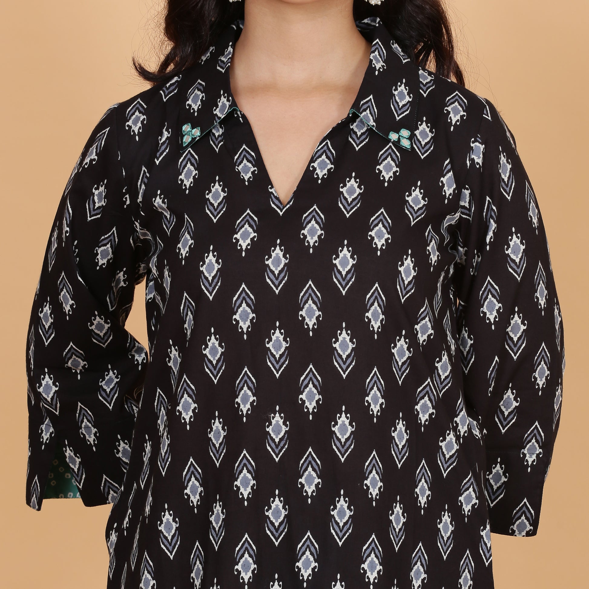 This black ikat co-ord set exudes contemporary style with its bold pattern and chic design.Mirror detailing on the collar and slit open sleeves with contrasting binding make the whole look smart. The top features a striking ikat print, while the striped pants add a modern contrast.