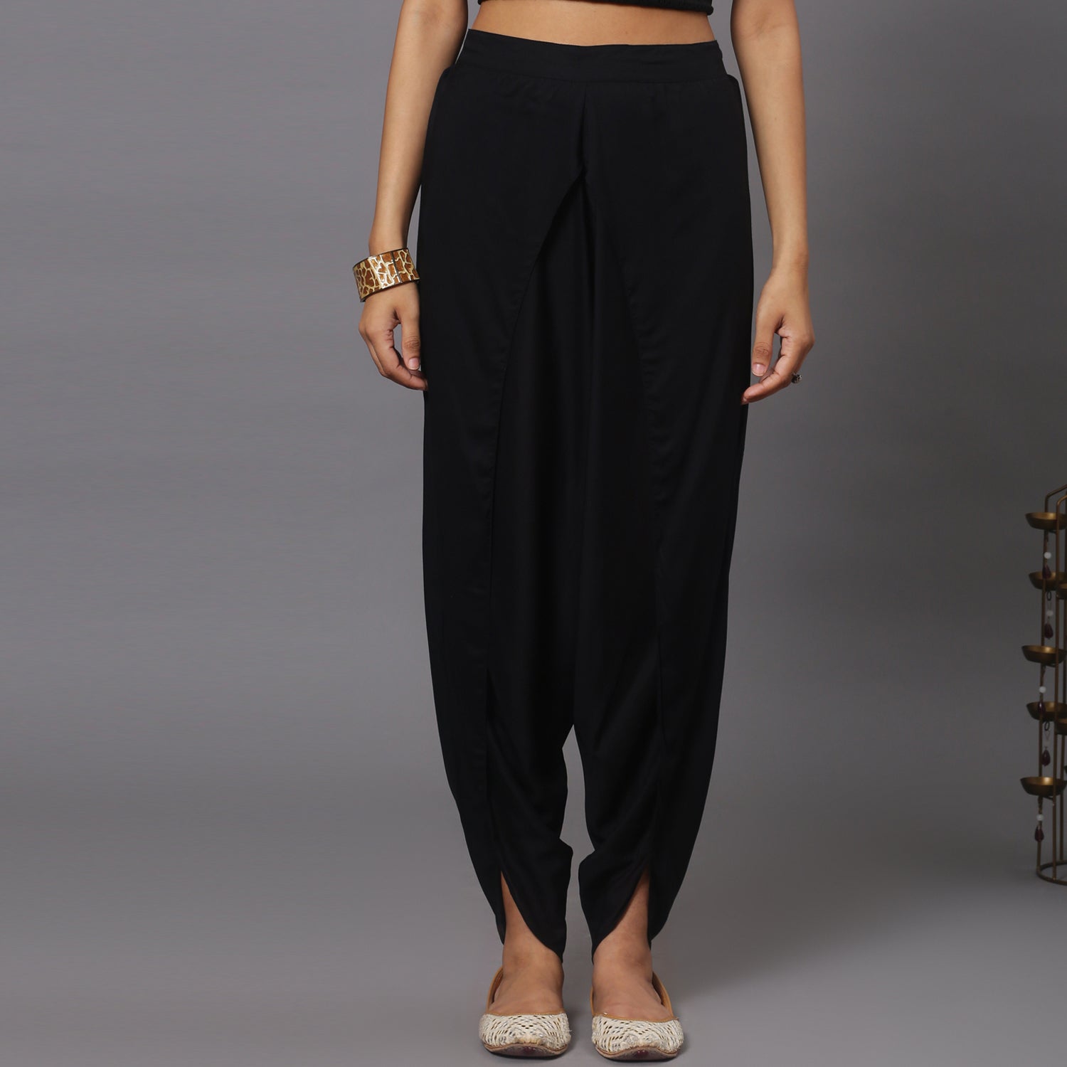 Black asymmetric sequinced cotton modal kurta with detailings all over the panel and at the bottom. It is paired with black dhoti pants. A classic kurta set to bring in festive vibes.