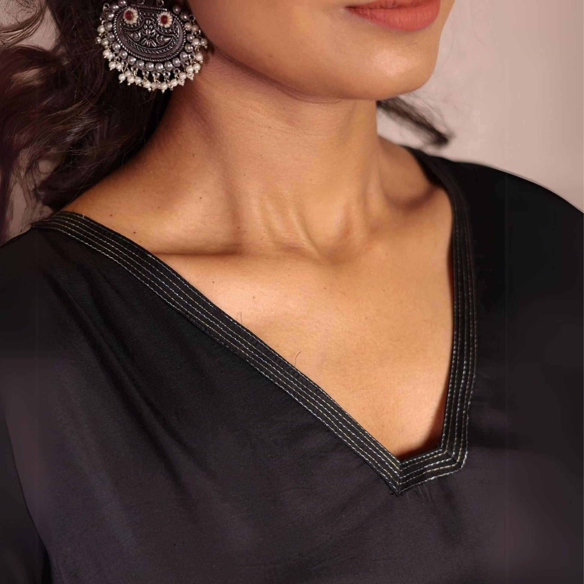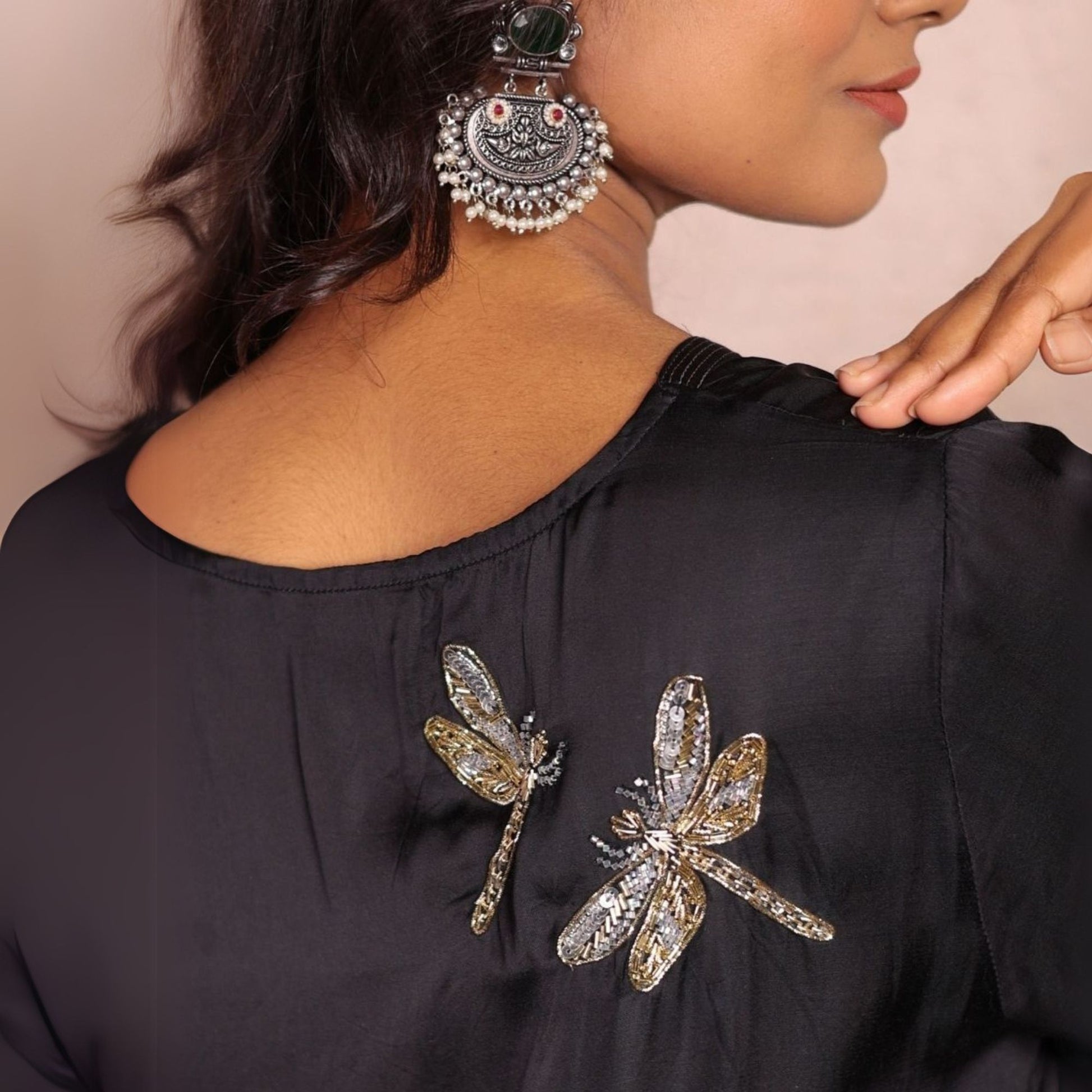 Elevate your style with our Black Sheer Dragonfly Modal Co-ord Set, featuring a V-neck modal kurta adorned with delicate zari lines on the neck and sleeves. The playful hand-embroidered dragonfly on the back adds a charming touch, while the modal pants stand out with quirky hand-embroidered organza patches at the hem. Perfect for a modern and comtenporary look