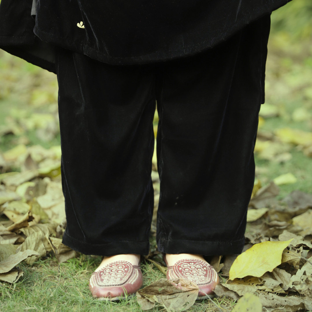 Your velvet favorite returns in dramatic Black. This opulent suit showcases intricate Zari and Dori work meticulously crafted across the kurta's neckline and sleeves, with subtle maroon threadwork highlights. This luxurious two-piece set is completed with perfectly matching velvet pants, ensuring unparalleled richness and warmth for your most elegant occasions.