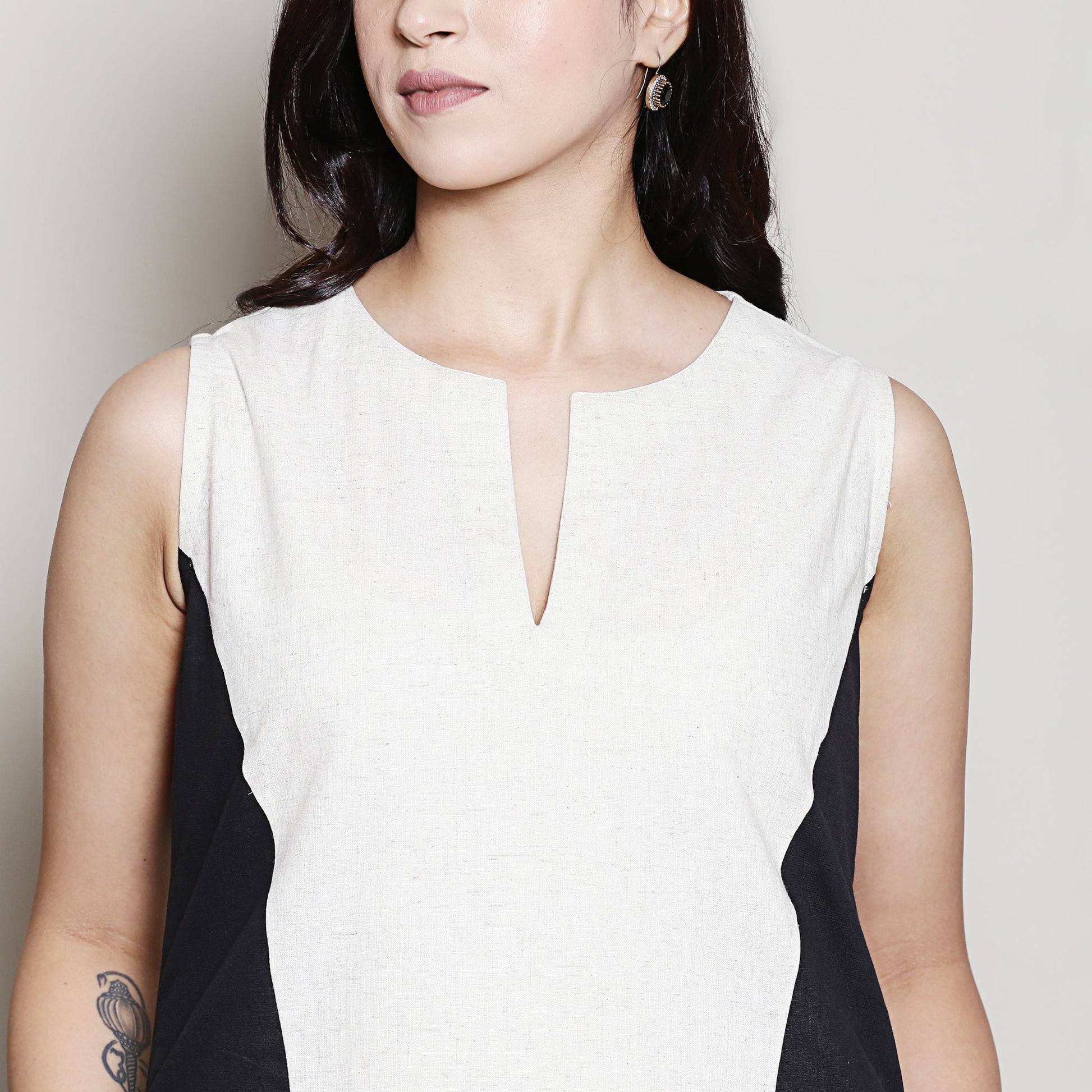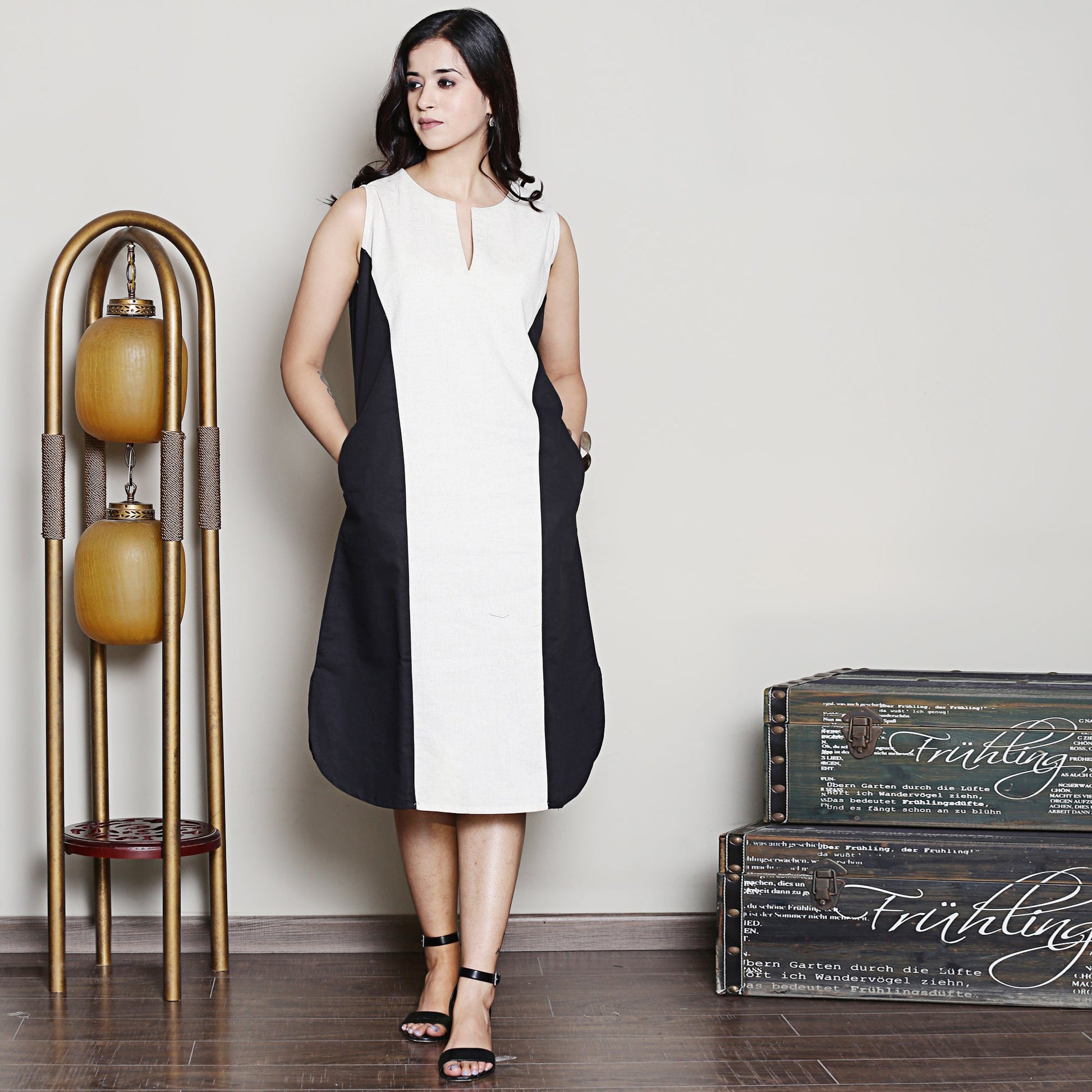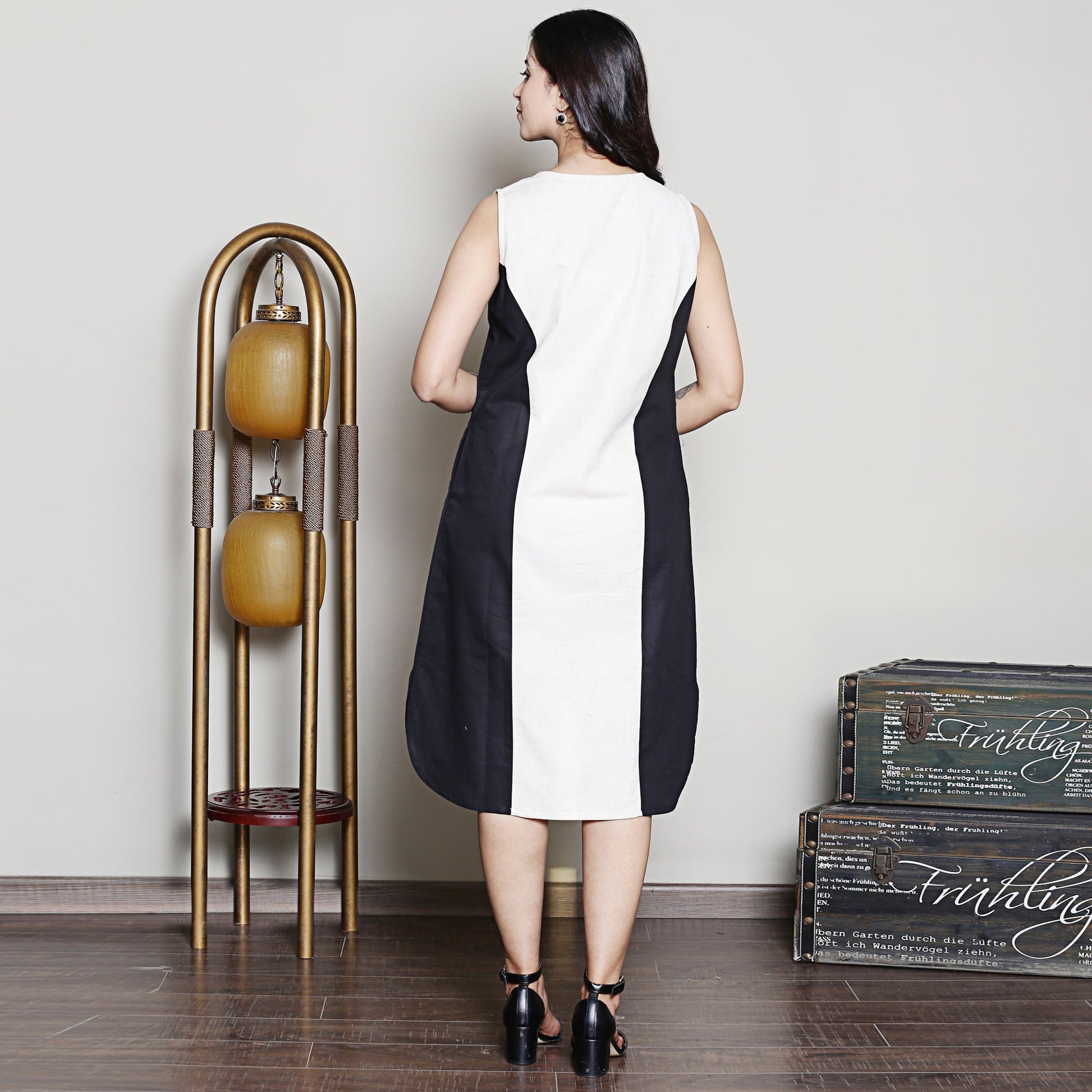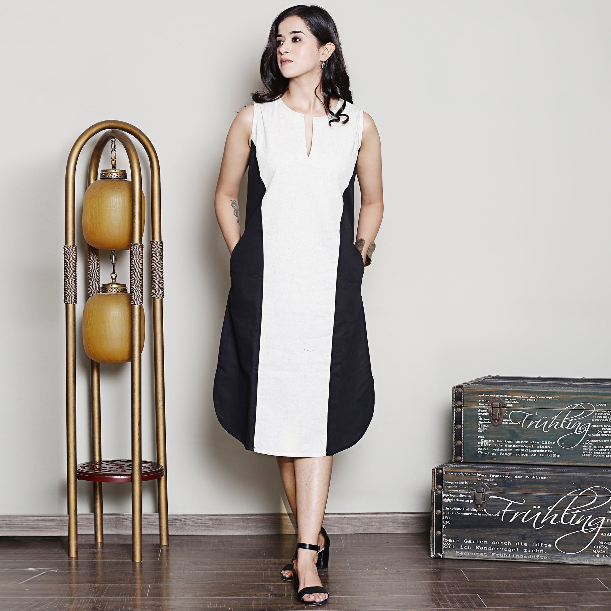Introducing our black and white colour block knee-length linen dress featuring side slits Embrace the modern sophistication and make a statement wherever you go with this style.