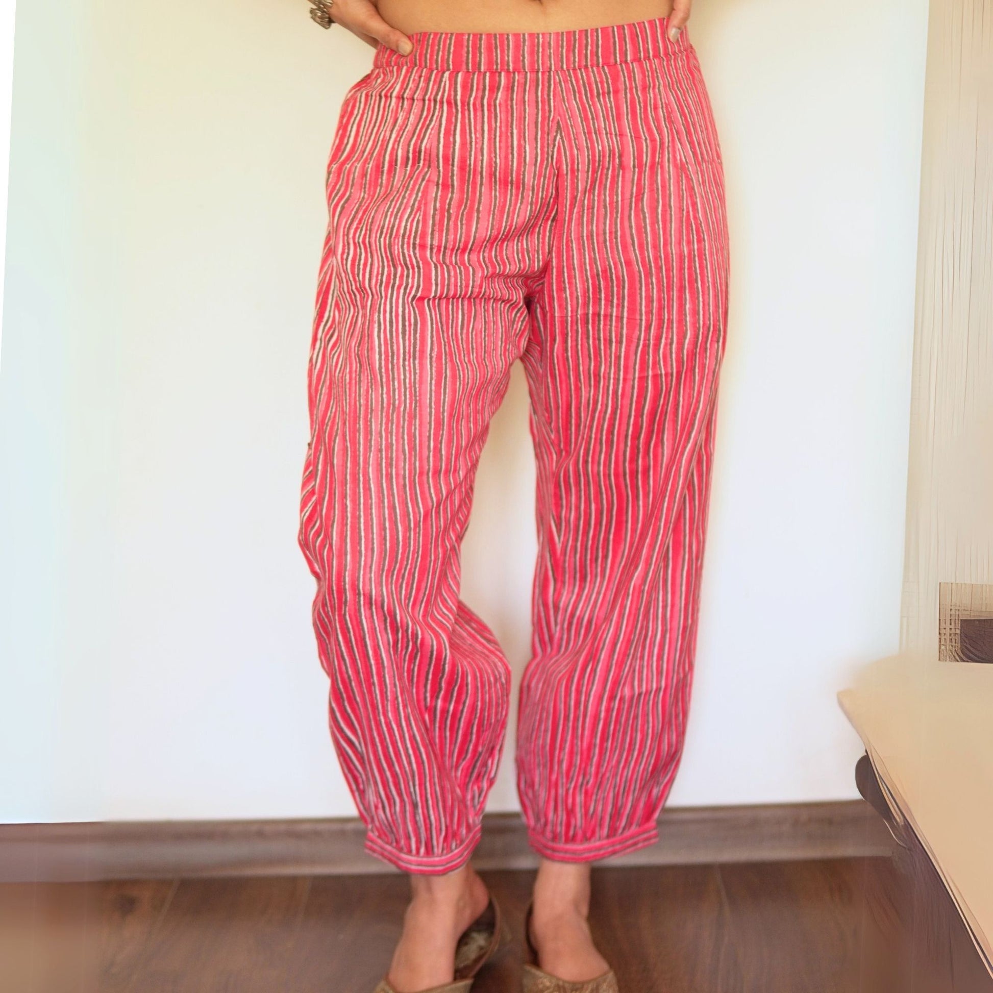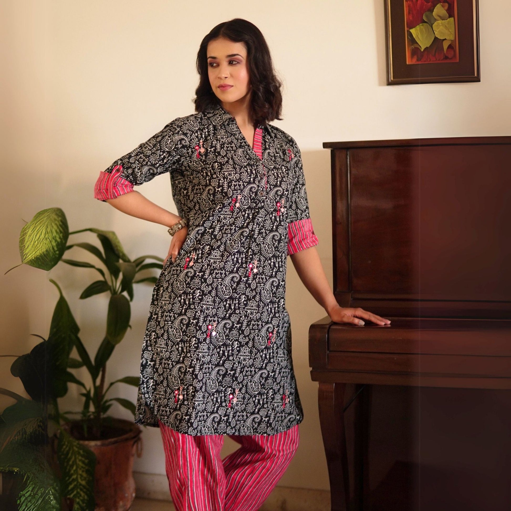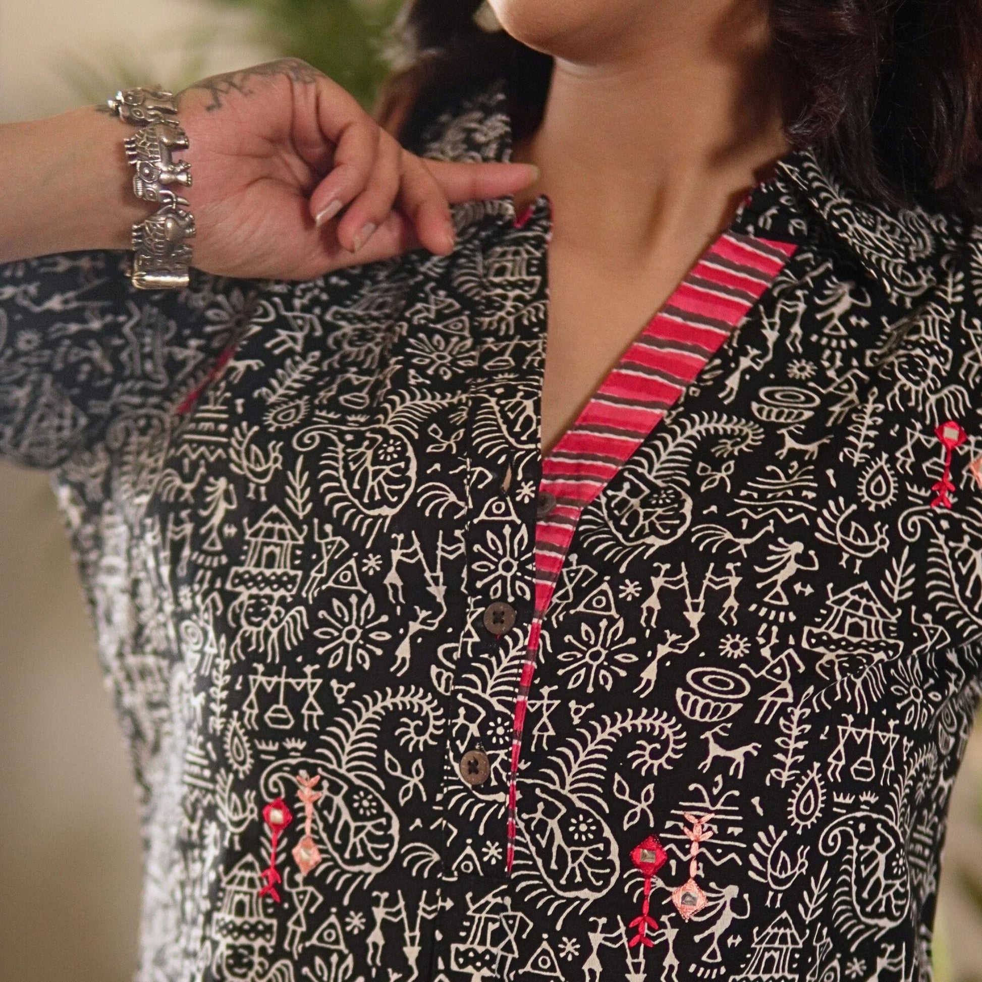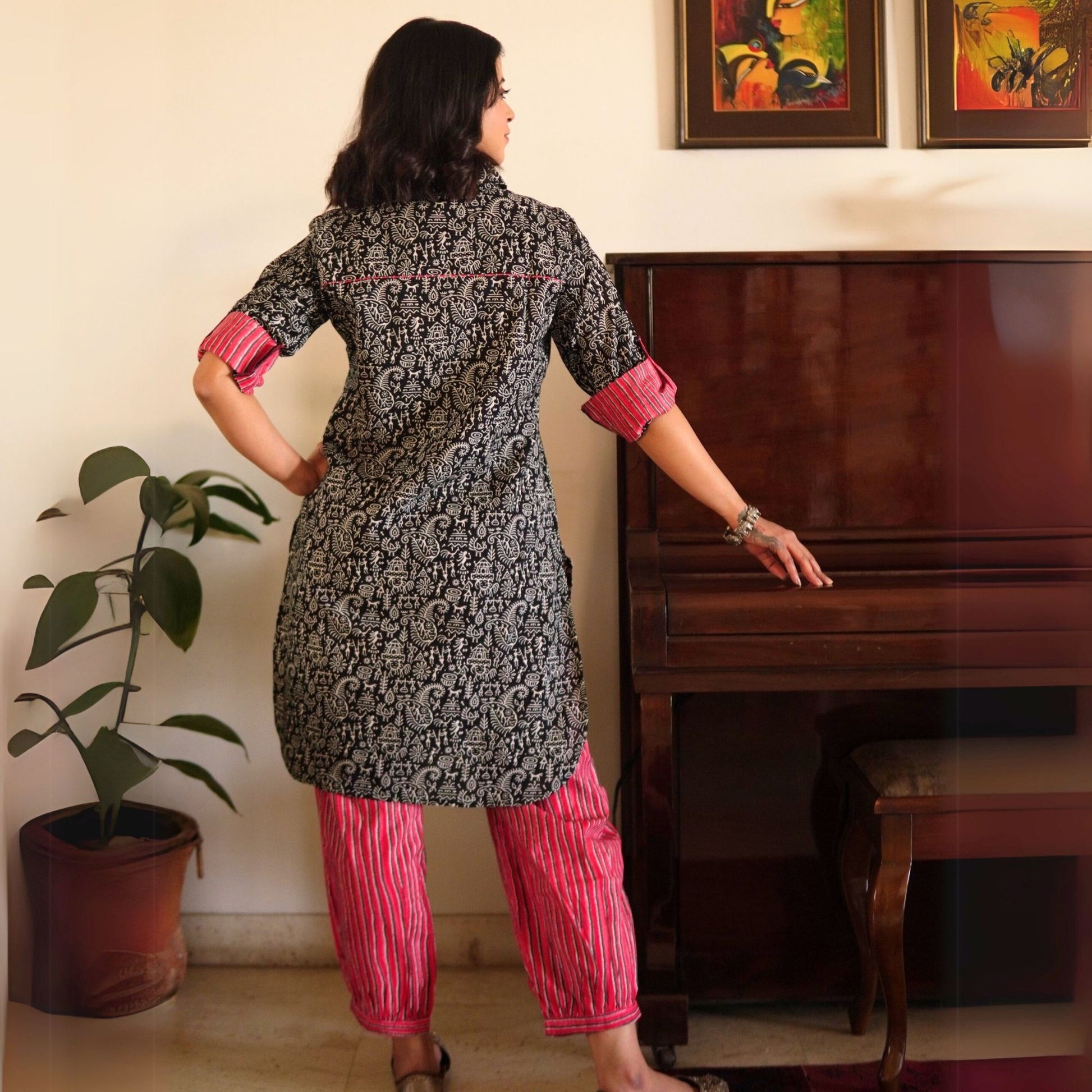 Black Worli printed cotton embroidered co-ord set with collared neck and turn up sleeves. It is paired with red striped harem pants. Perfect for all day comfort.