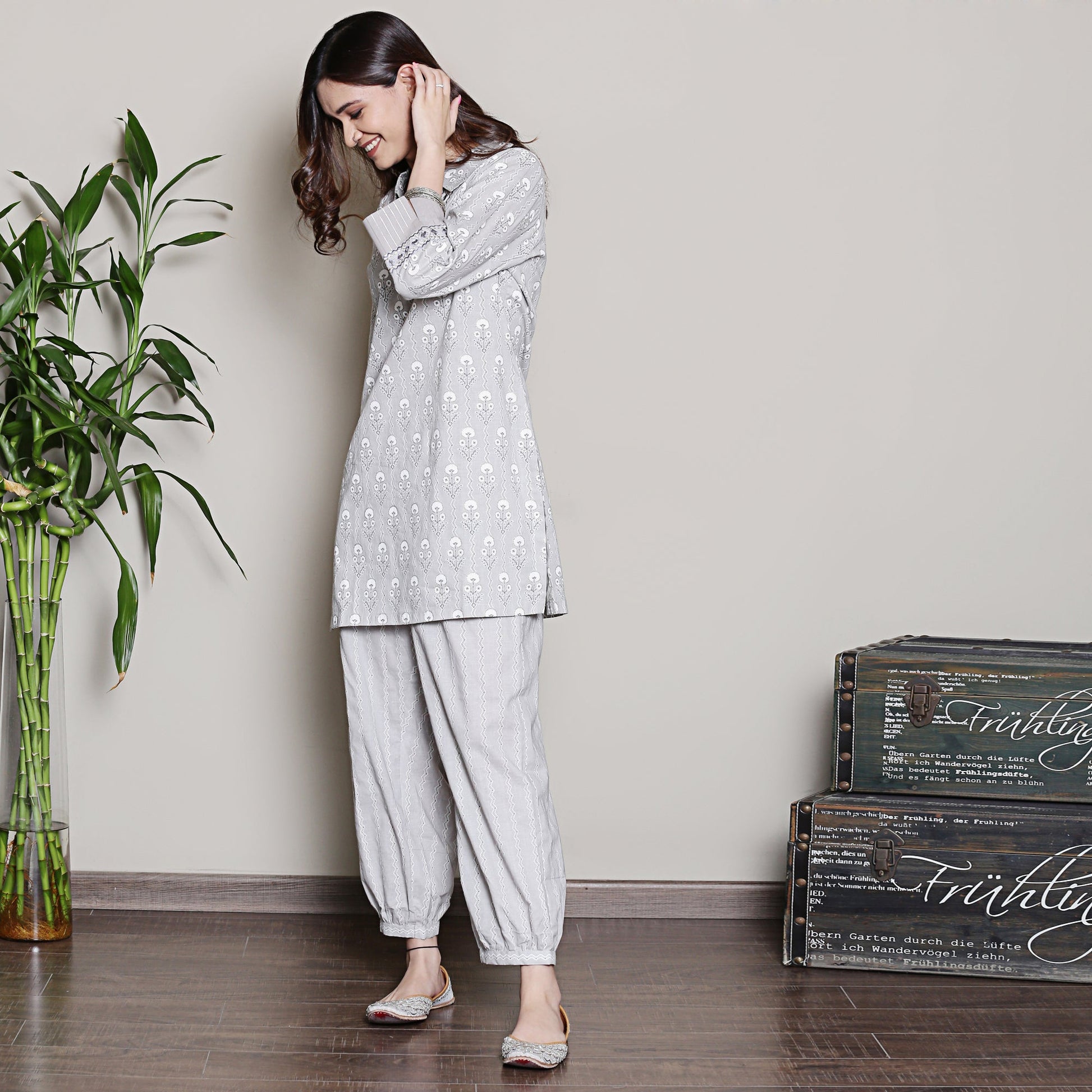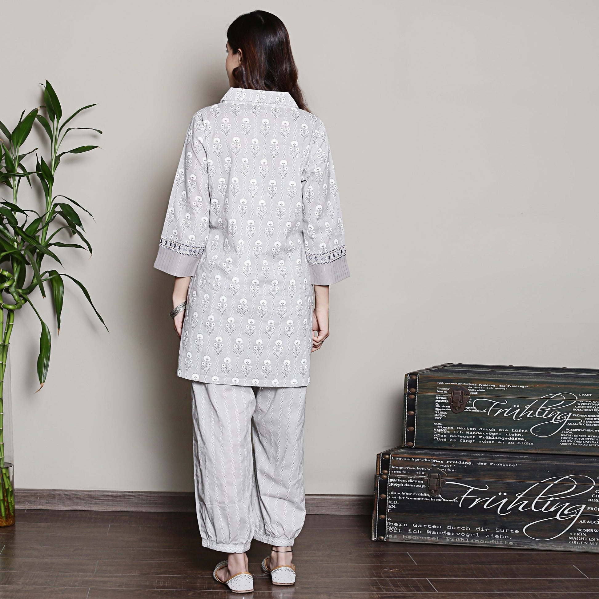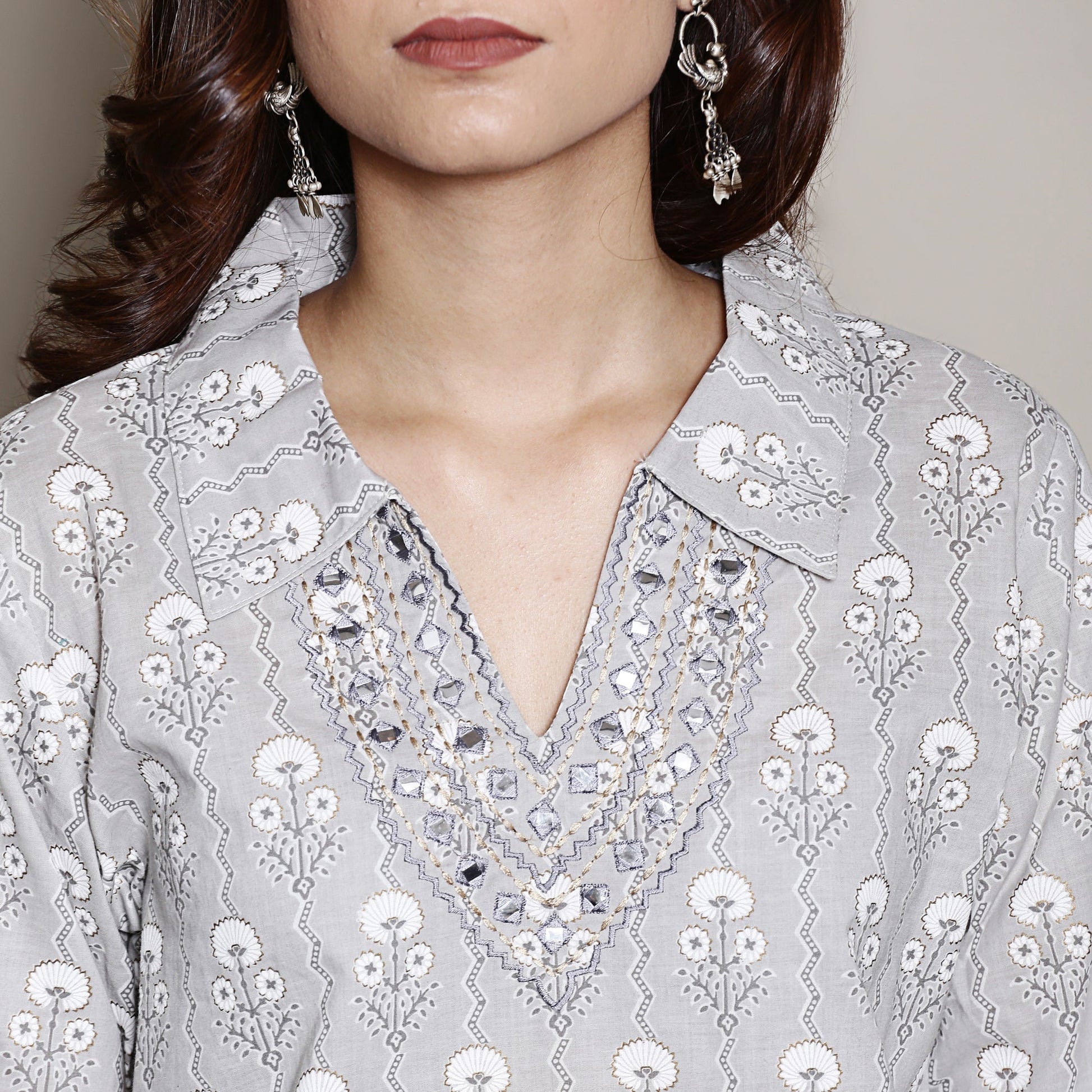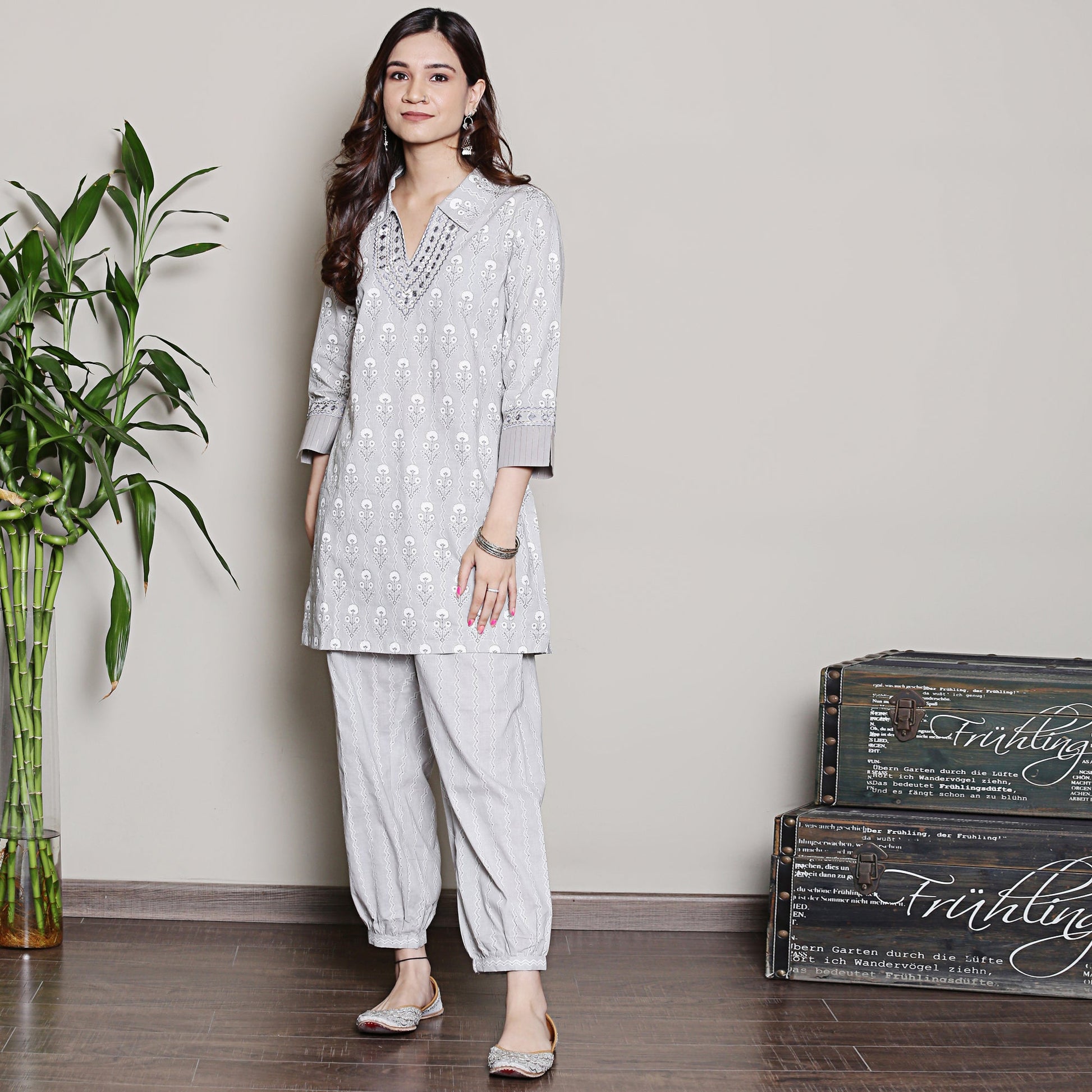 Block printed grey co-ord set with neck embroidery
