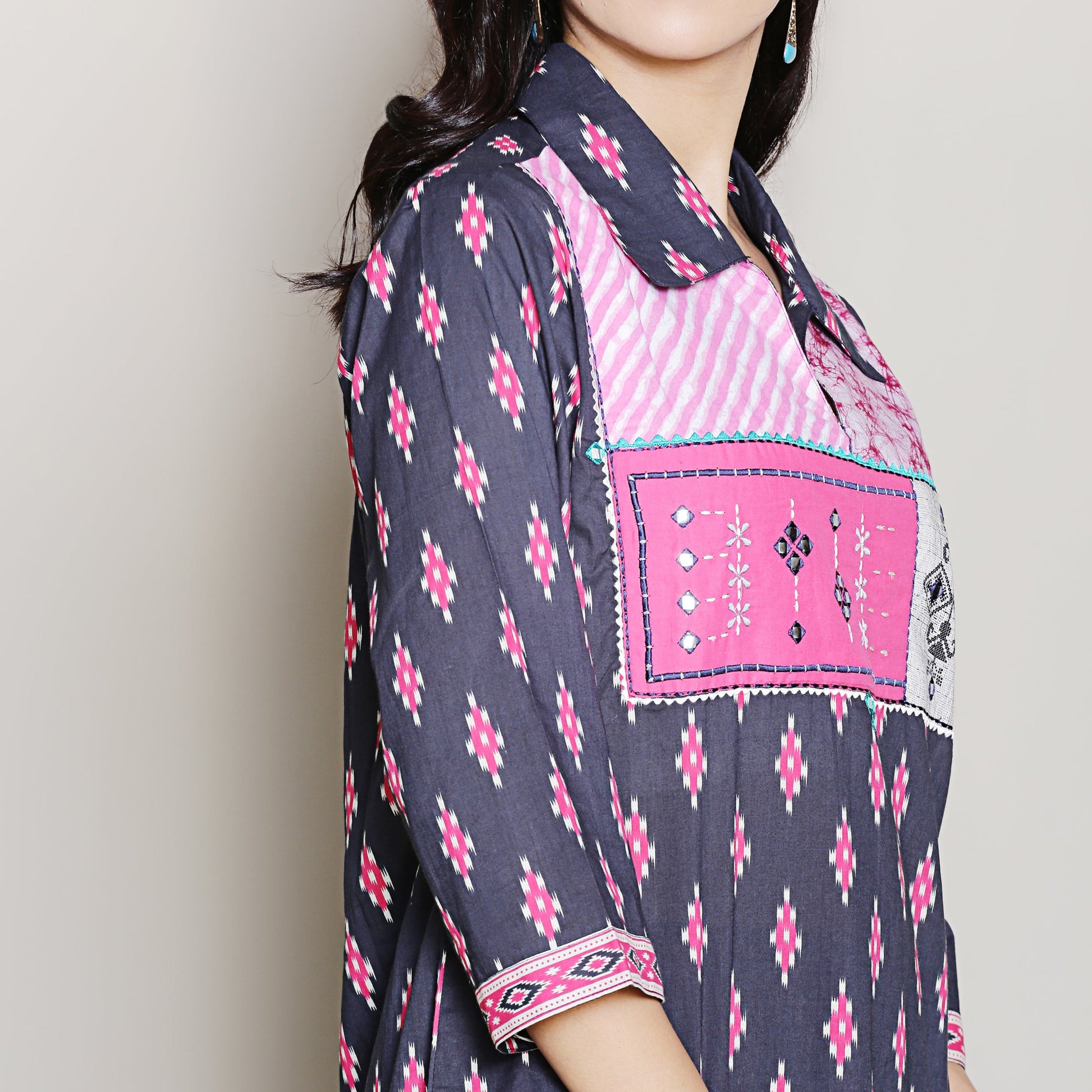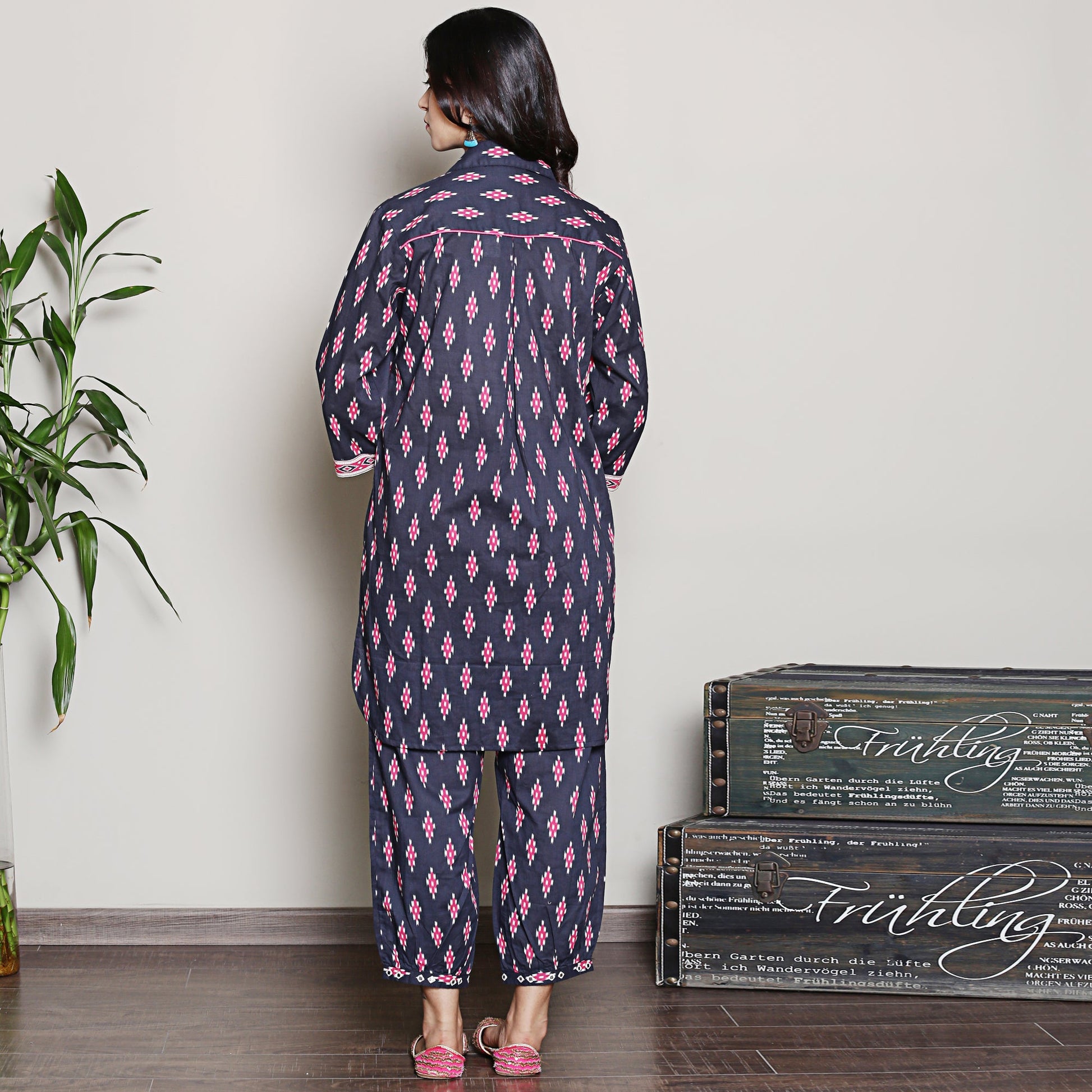 Make a vibrant statement in our block printed navy blue cotton kurta set adorned with hot pink ikat motifs and patchwork yoke. It is paired with matching harem pants. It's the perfect ensemble for all day comfort.