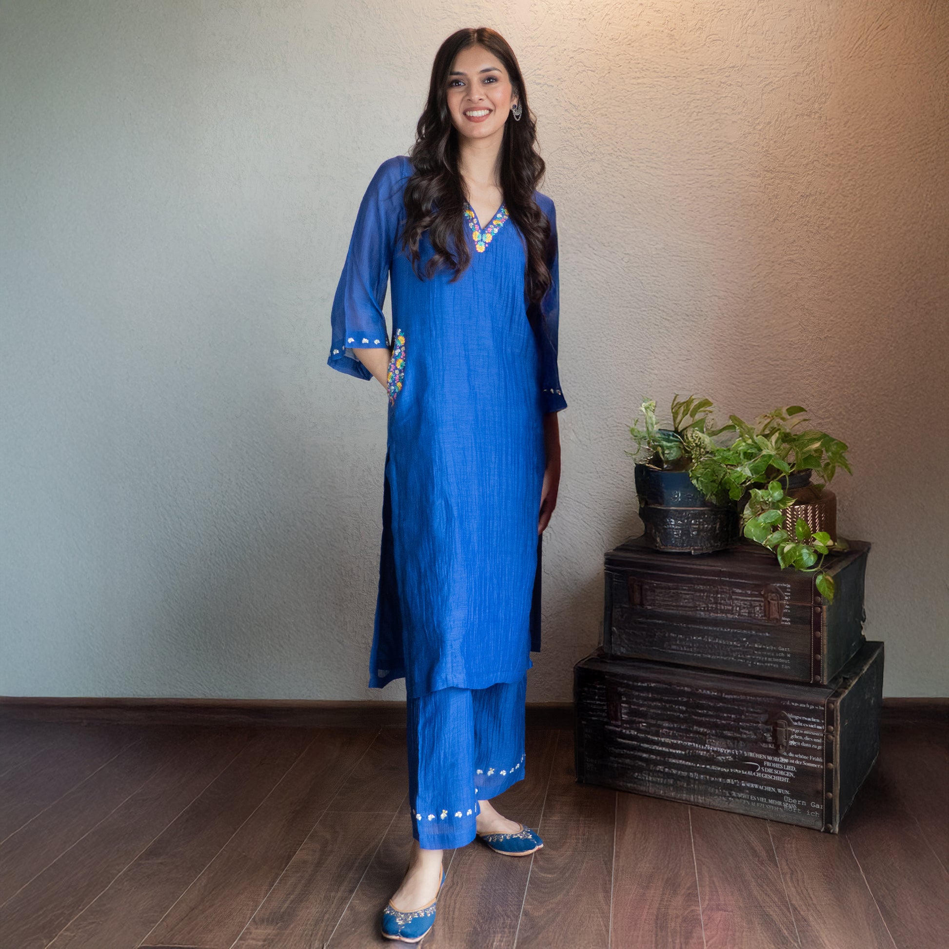 This vibrant blue Chanderi kurta set features lively colorful embroidery on the neckline and sleeves. The pockets are beautifully embroidered, adding an extra touch of charm. It's paired with tonal pants featuring small floral embroidery at the hem. Light and easygoing, it’s perfect for cheerful, playful style all day long.