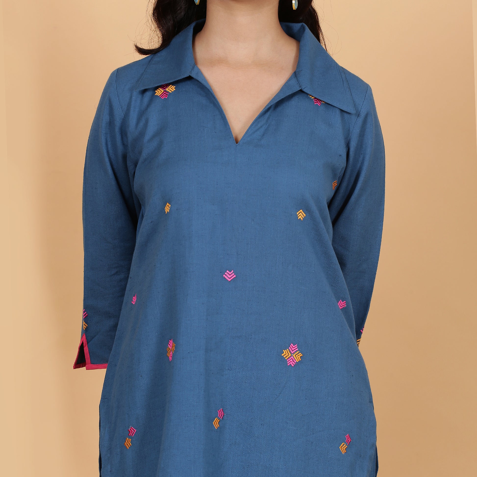 Introducing our blue cotton flax co-ord set. This ensemble features a one-piece collar with a V-shaped keyhole, geometric motif embroidery on the front panel, and slit sleeves with contrast color binding and embroidery. The straight pants have a wide 9” opening, offering a smart look to brighten your day.