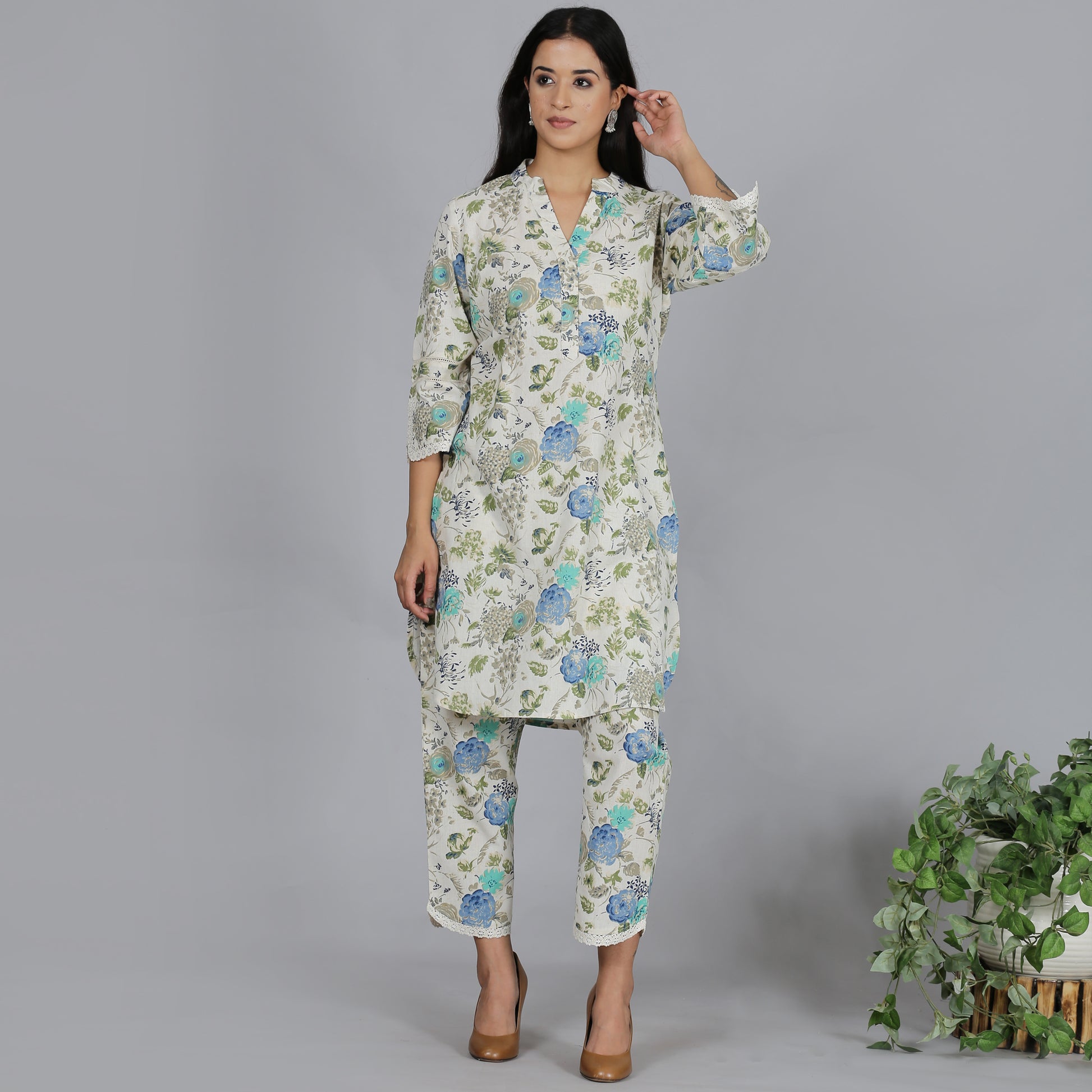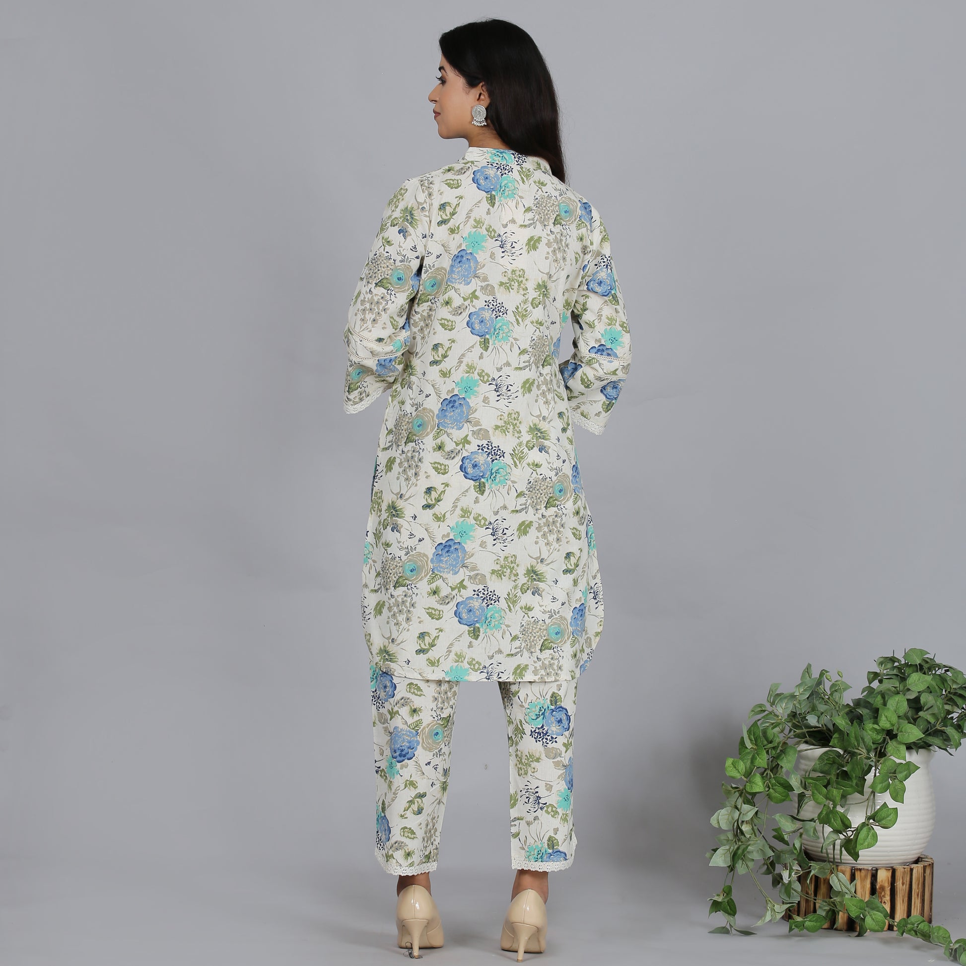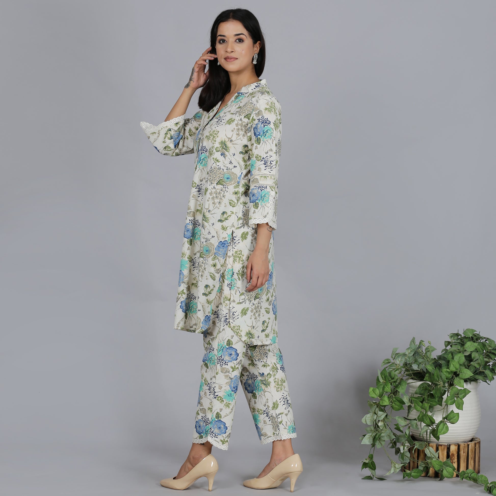 Introducing our blue floral printed cotton flax co-ord set. It features a band collar with hooks on the placket and open slit sleeves with lace detailing. Designed for comfort and style, this set is perfect for a day out.