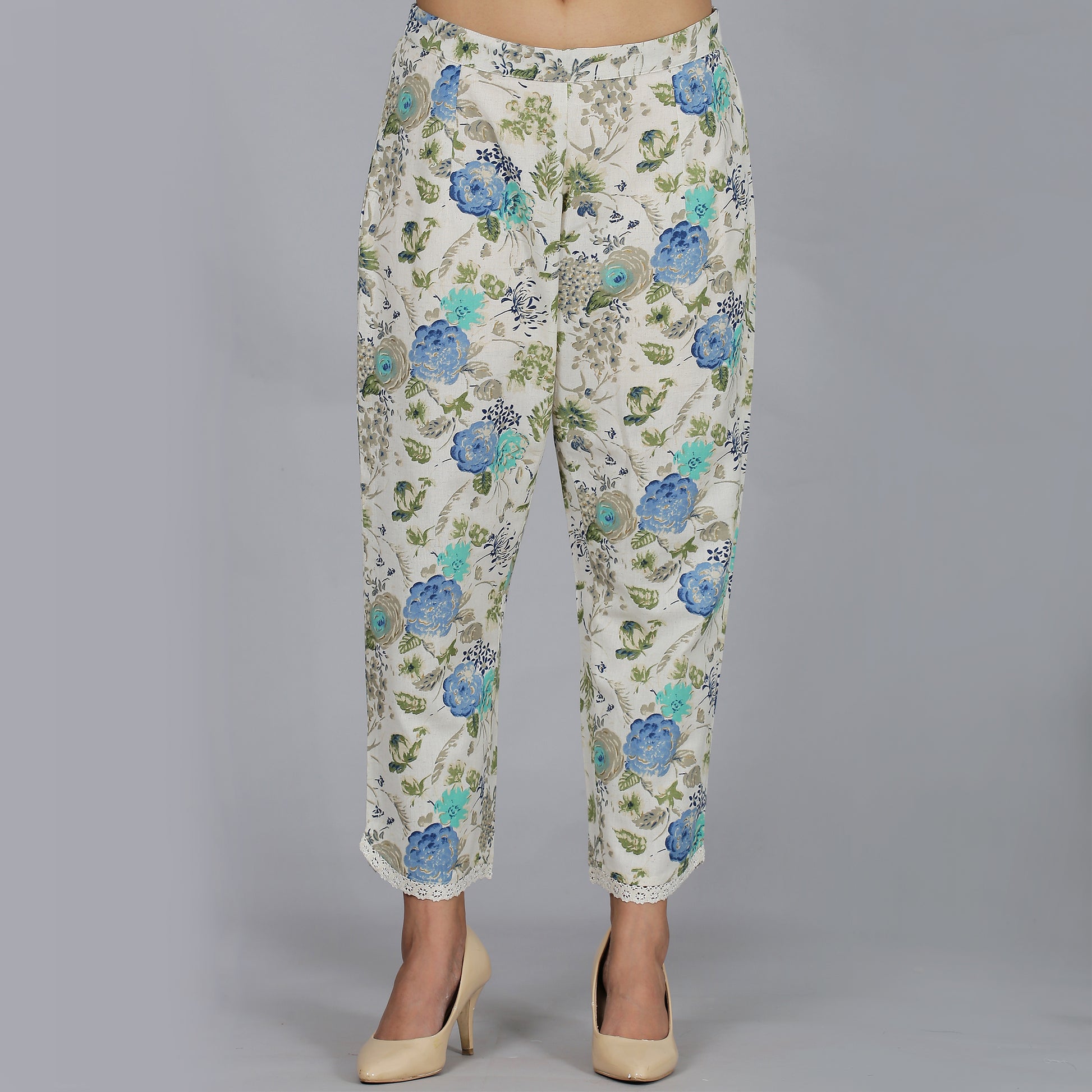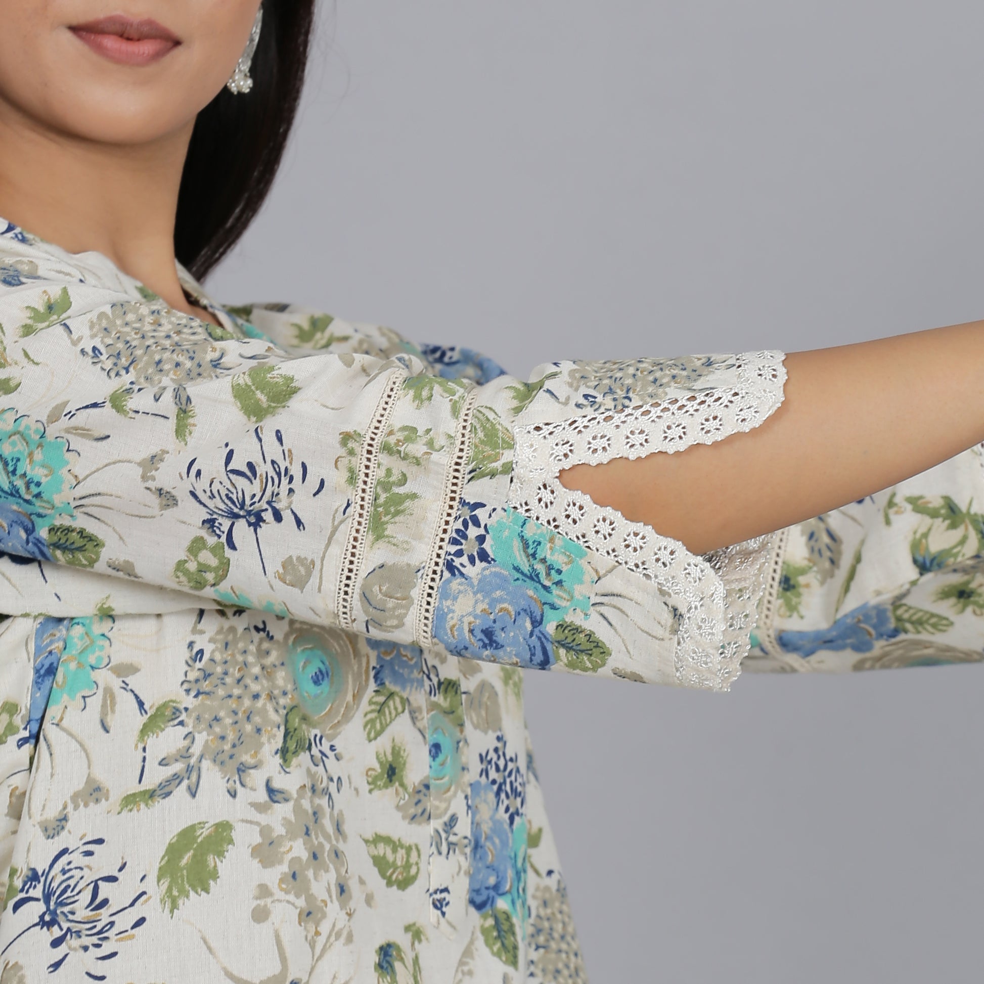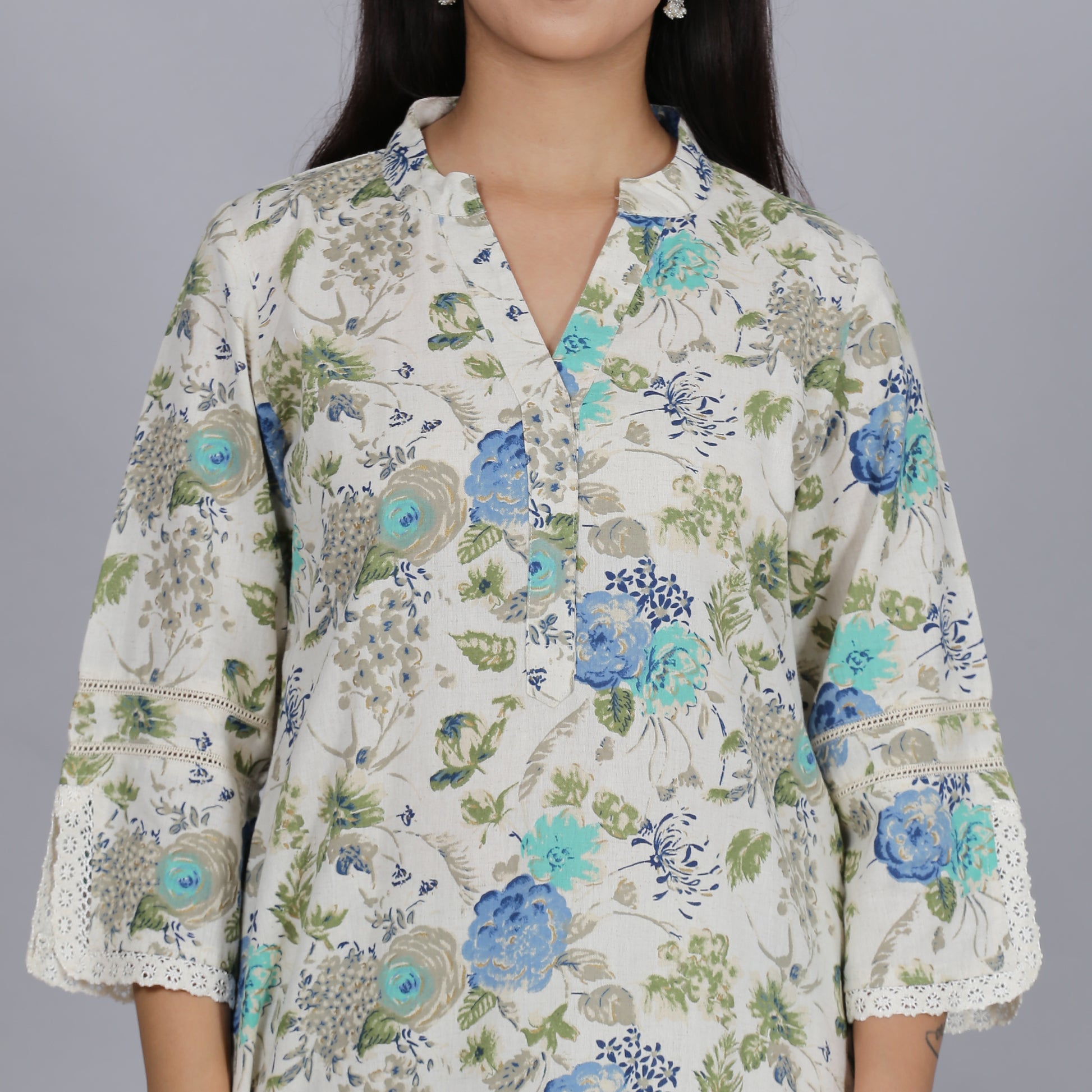 Introducing our blue floral printed cotton flax co-ord set. It features a band collar with hooks on the placket and open slit sleeves with lace detailing. Designed for comfort and style, this set is perfect for a day out.