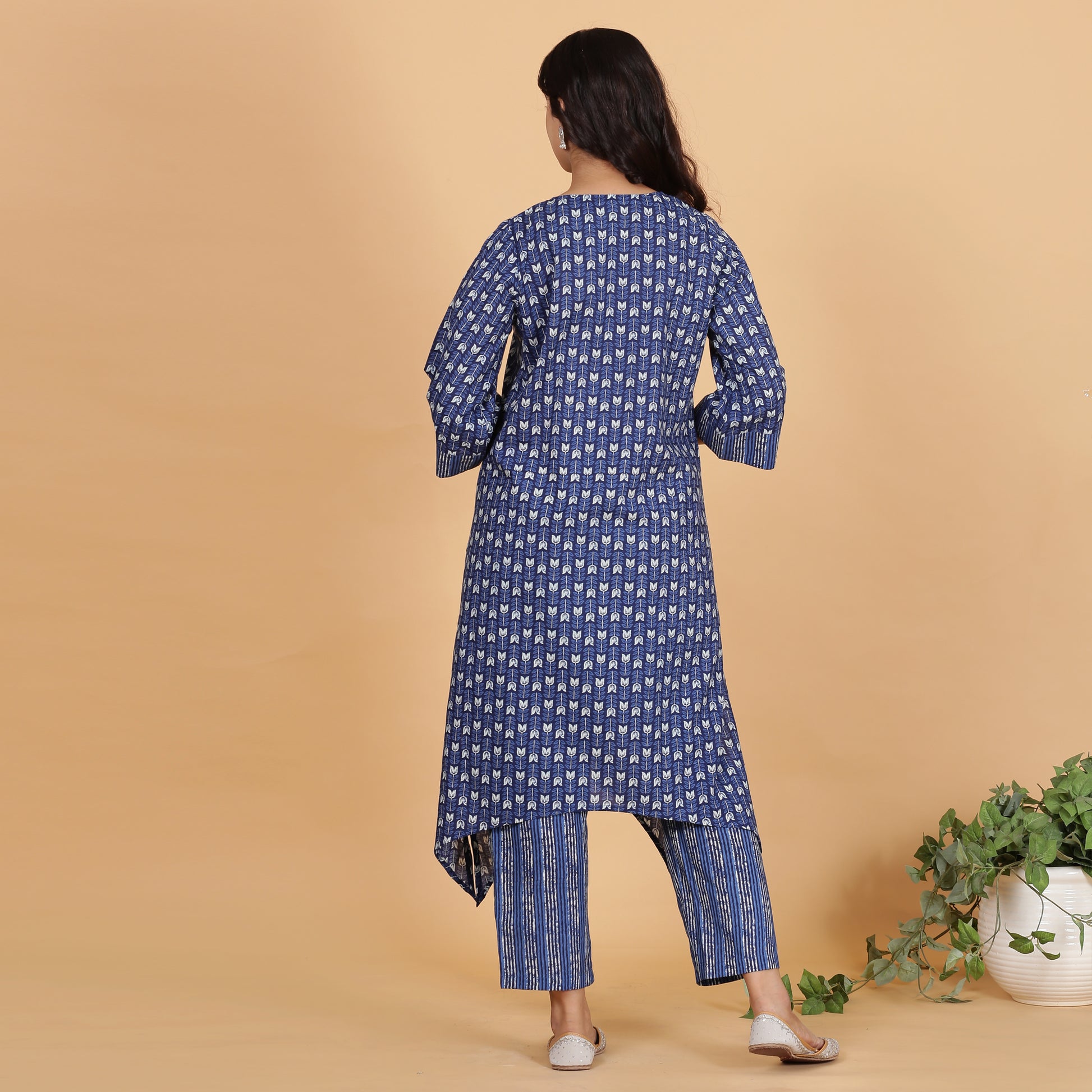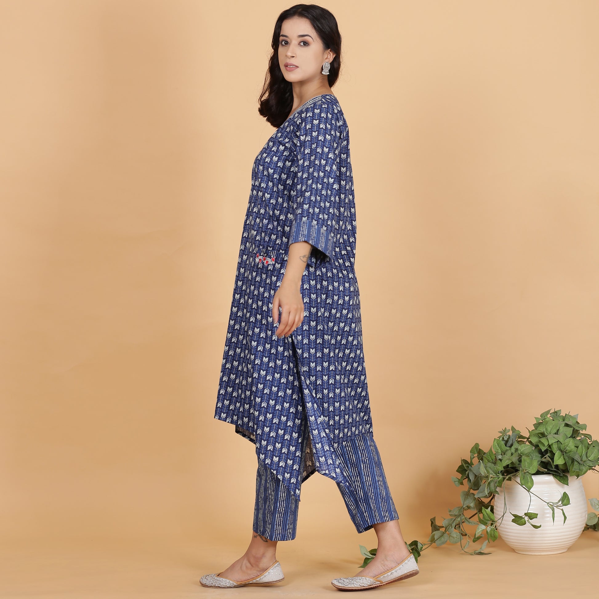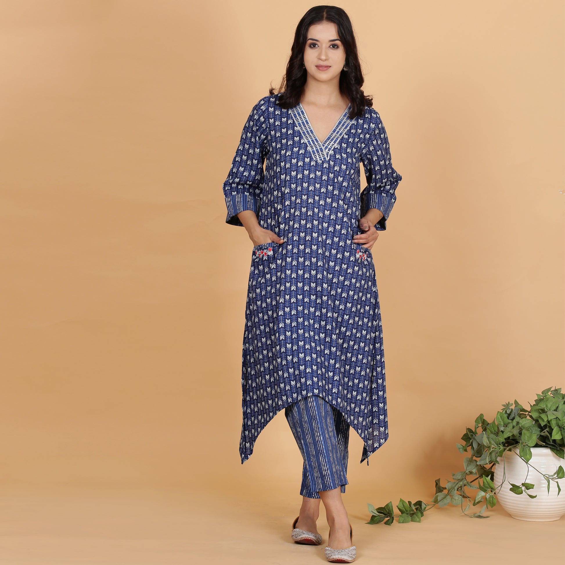 This blue pocket kurta set exudes contemporary charm with its embroidered details and striped pants. The kurta features elegant embroidery and practical pockets, combining style with functionality. Paired with striped pants for a modern twist, this set is perfect for casual outings or semi-formal events.
