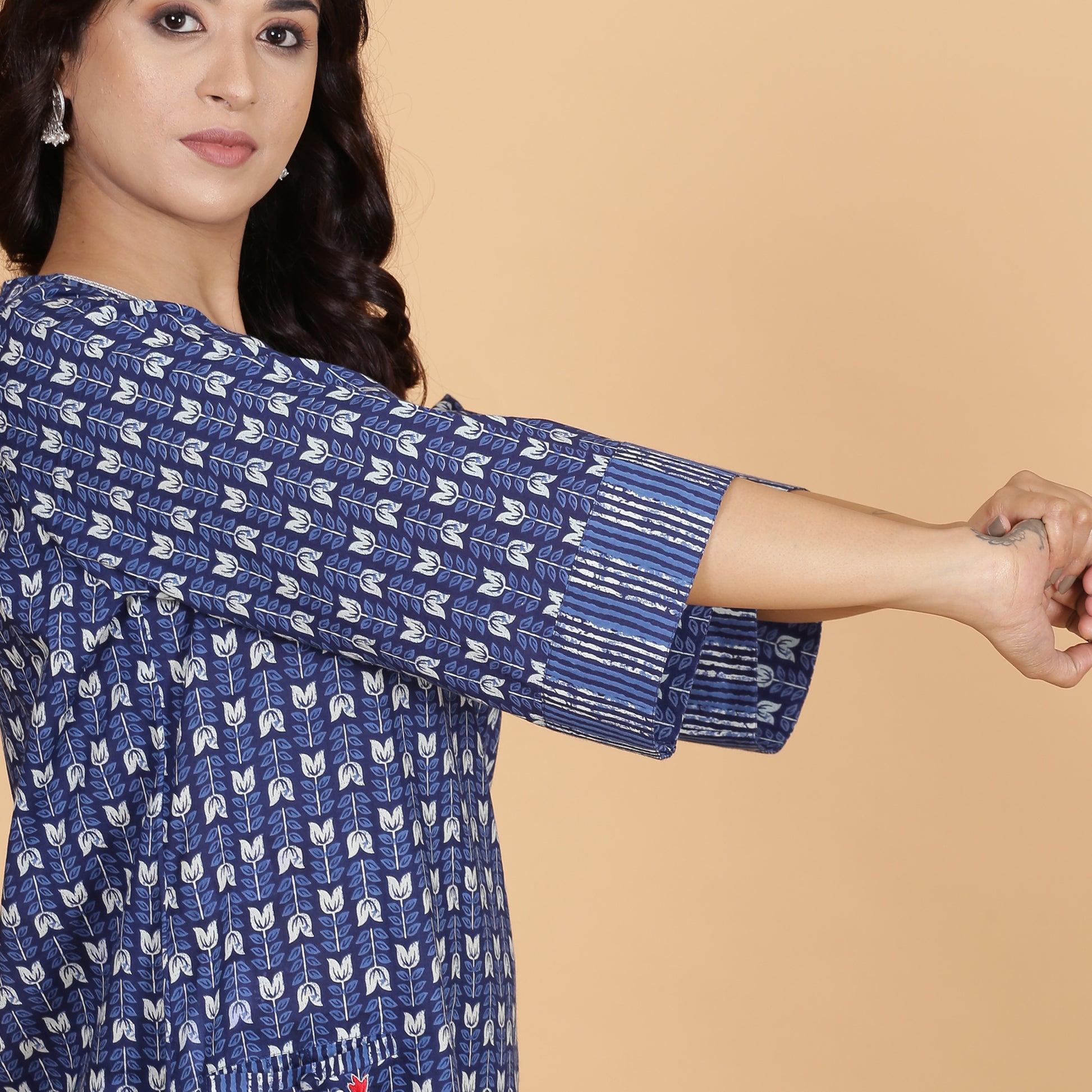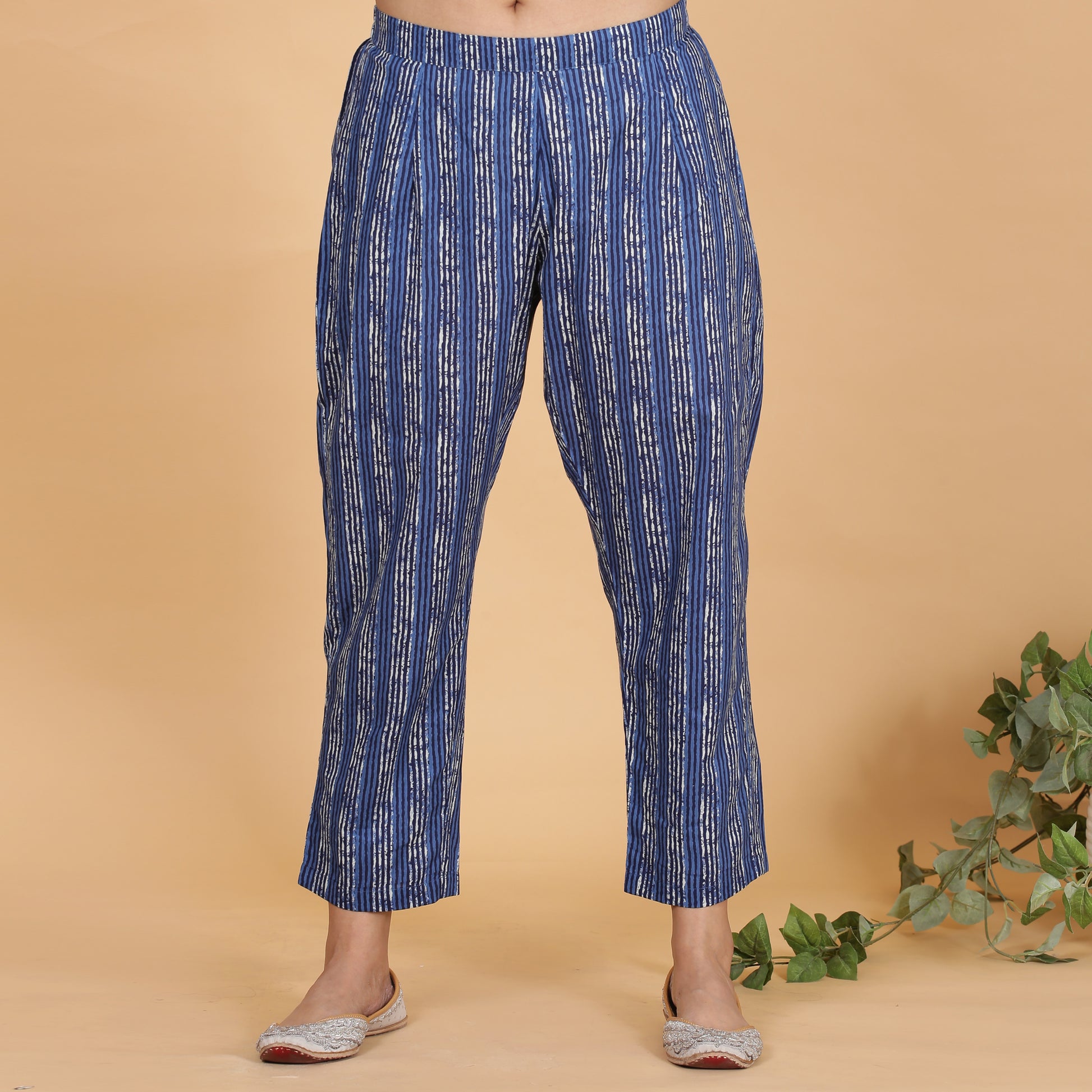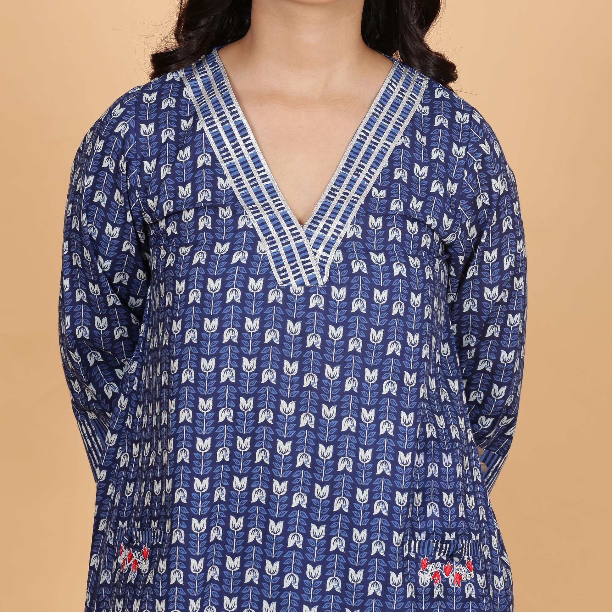 This blue pocket kurta set exudes contemporary charm with its embroidered details and striped pants. The kurta features elegant embroidery and practical pockets, combining style with functionality. Paired with striped pants for a modern twist, this set is perfect for casual outings or semi-formal events.