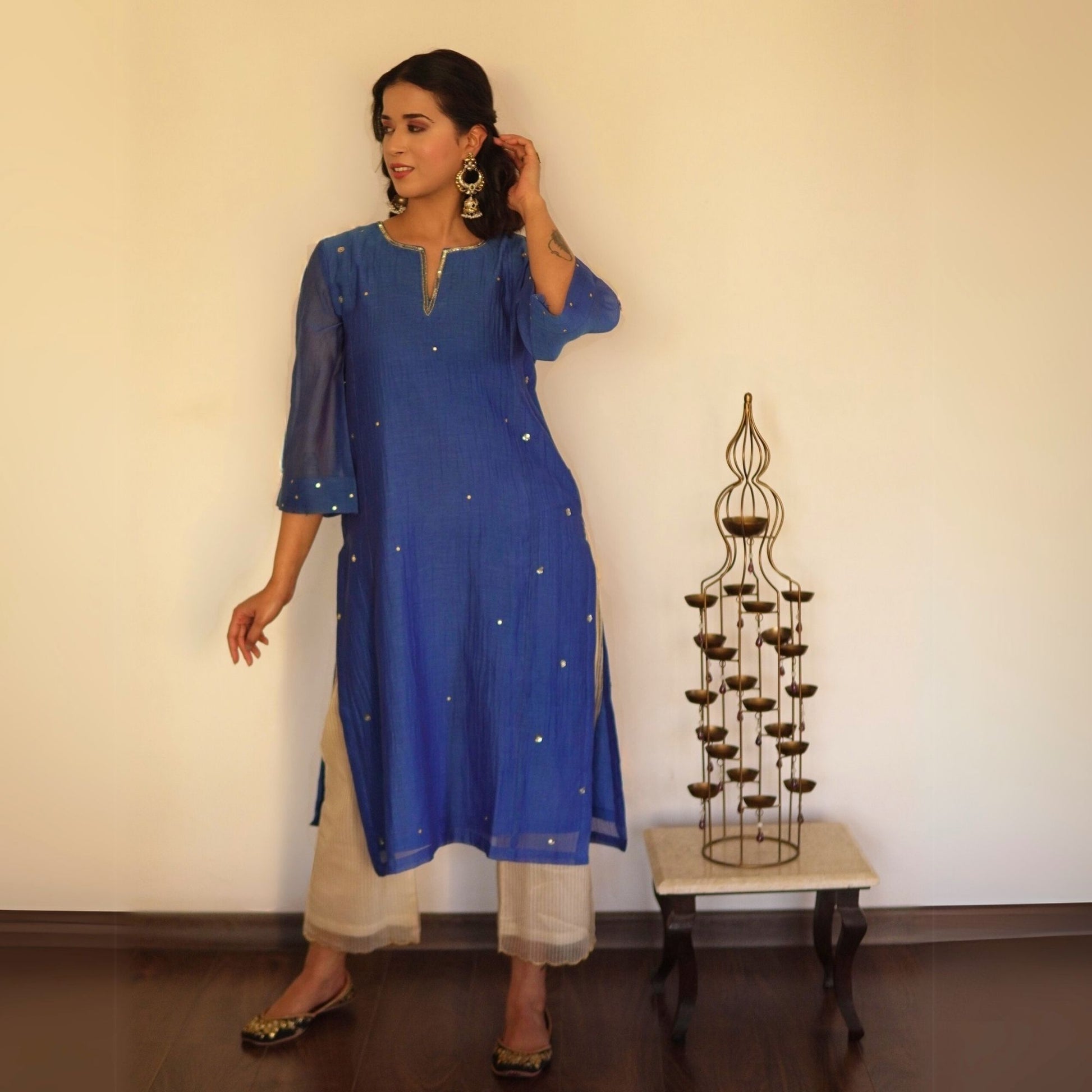 Turn heads in our royal blue chanderi kurta set, featuring hand embroidered sequin spray all over along with detailing on the neckline and sleeves. Designed with a soft cotton lining inside for all-day ease, this semi-formal piece is perfectly paired with lace matching chanderi bottoms for a graceful, elevated look.