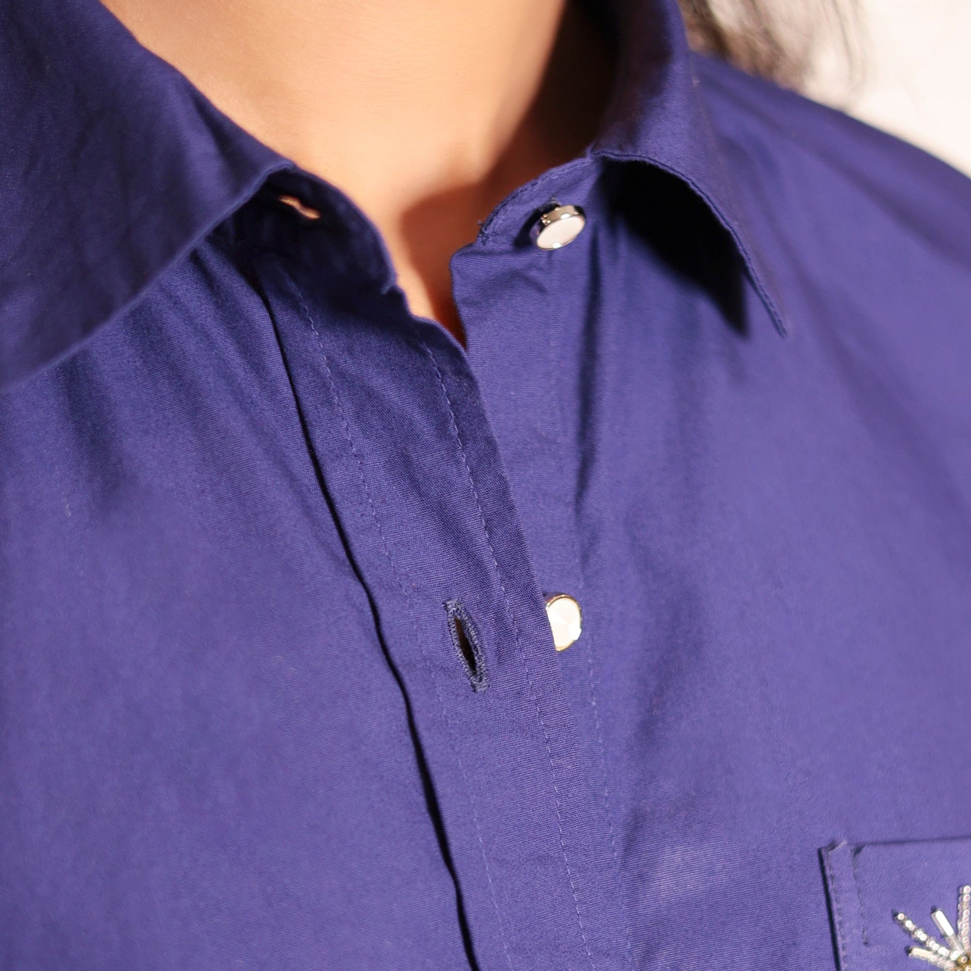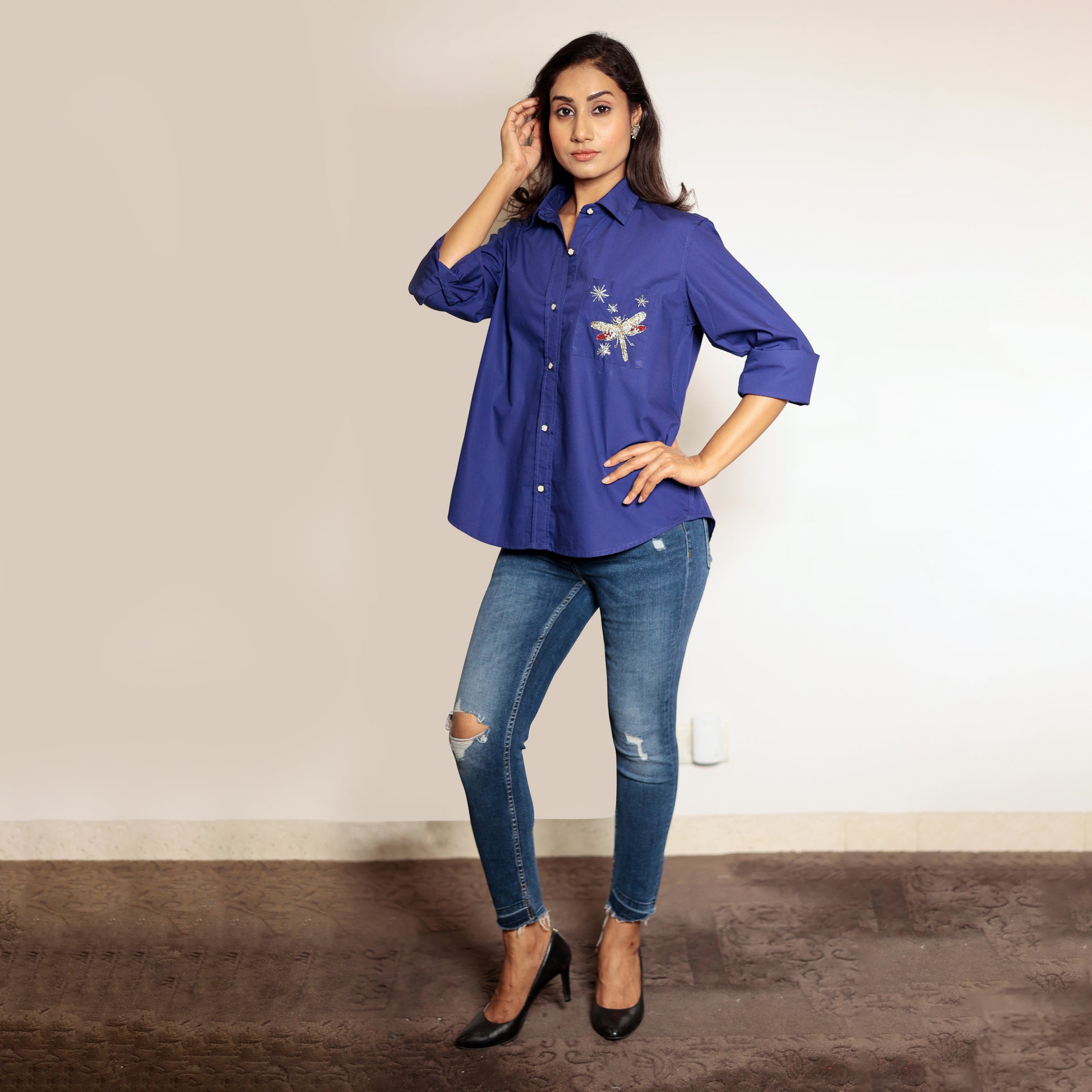 This classic blue shirt is elevated with a touch of whimsy. A delicate dragonfly is embroidered on the pocket that adds a unique and eye-catching detail.