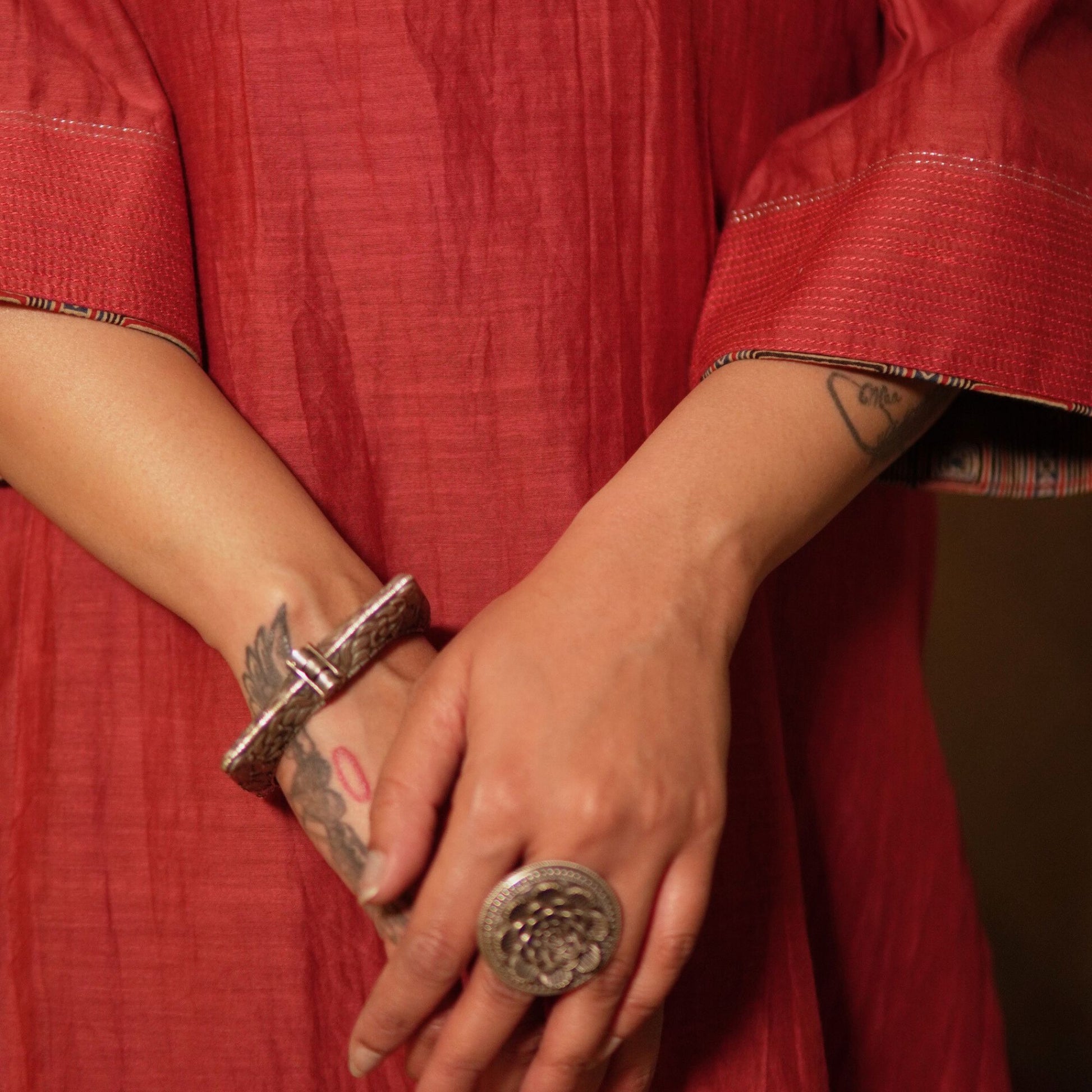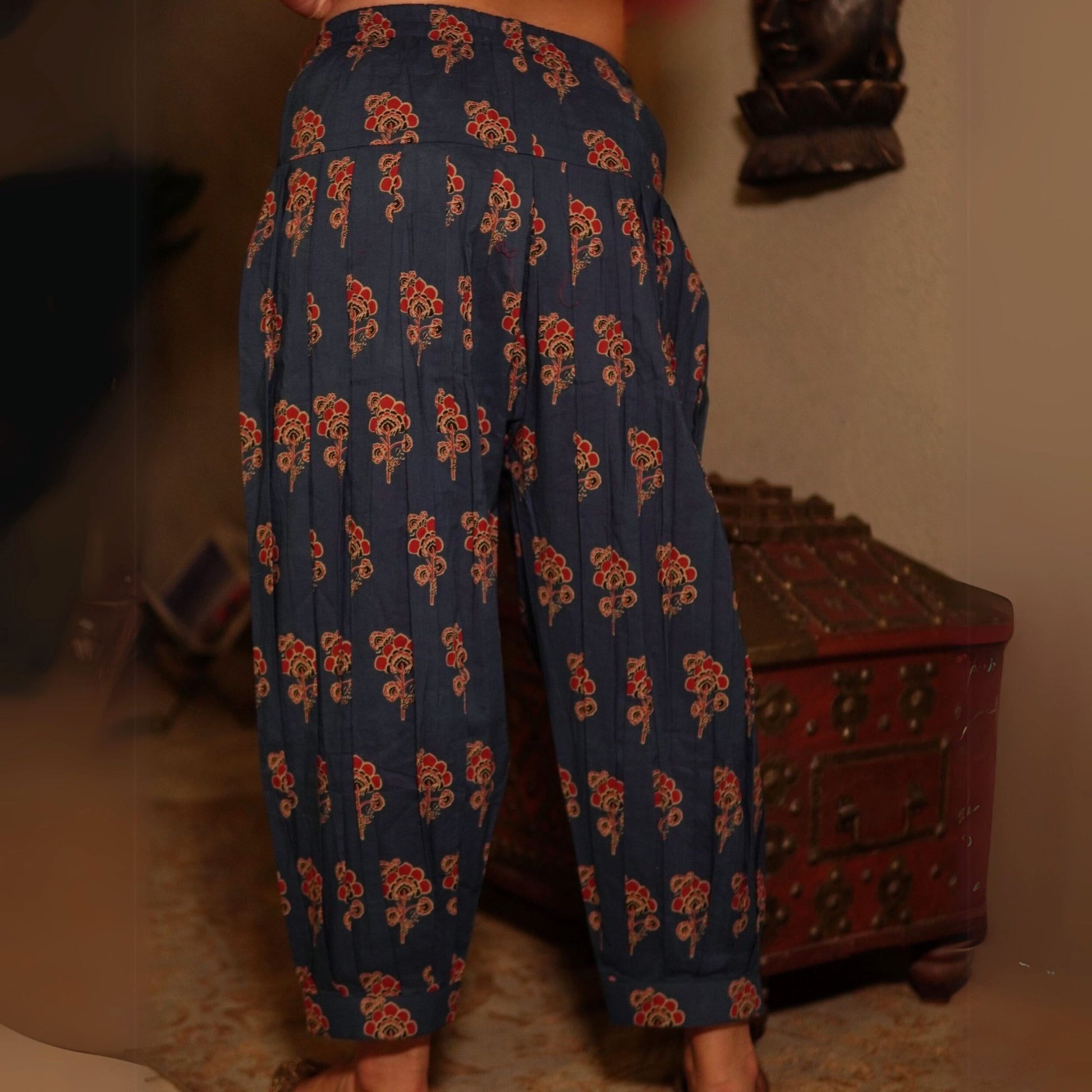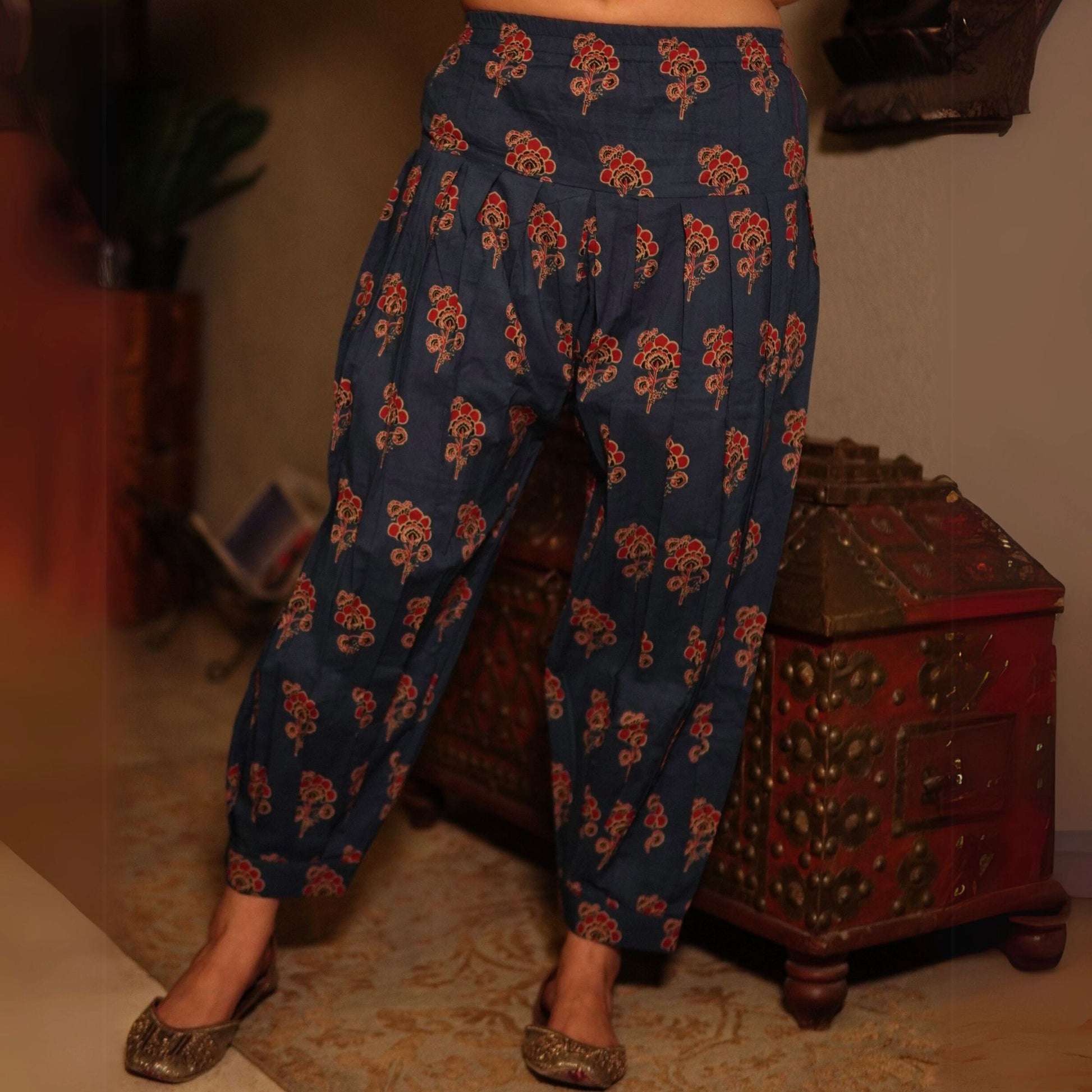This brick red Chanderi kurta features mirror work around a keyhole neckline and detailed sleeves. Paired with a contrasting indigo floral block-printed cotton salwar, it’s a refreshing blend of tradition and bold styling — ideal for casual and semi-formal settings.
