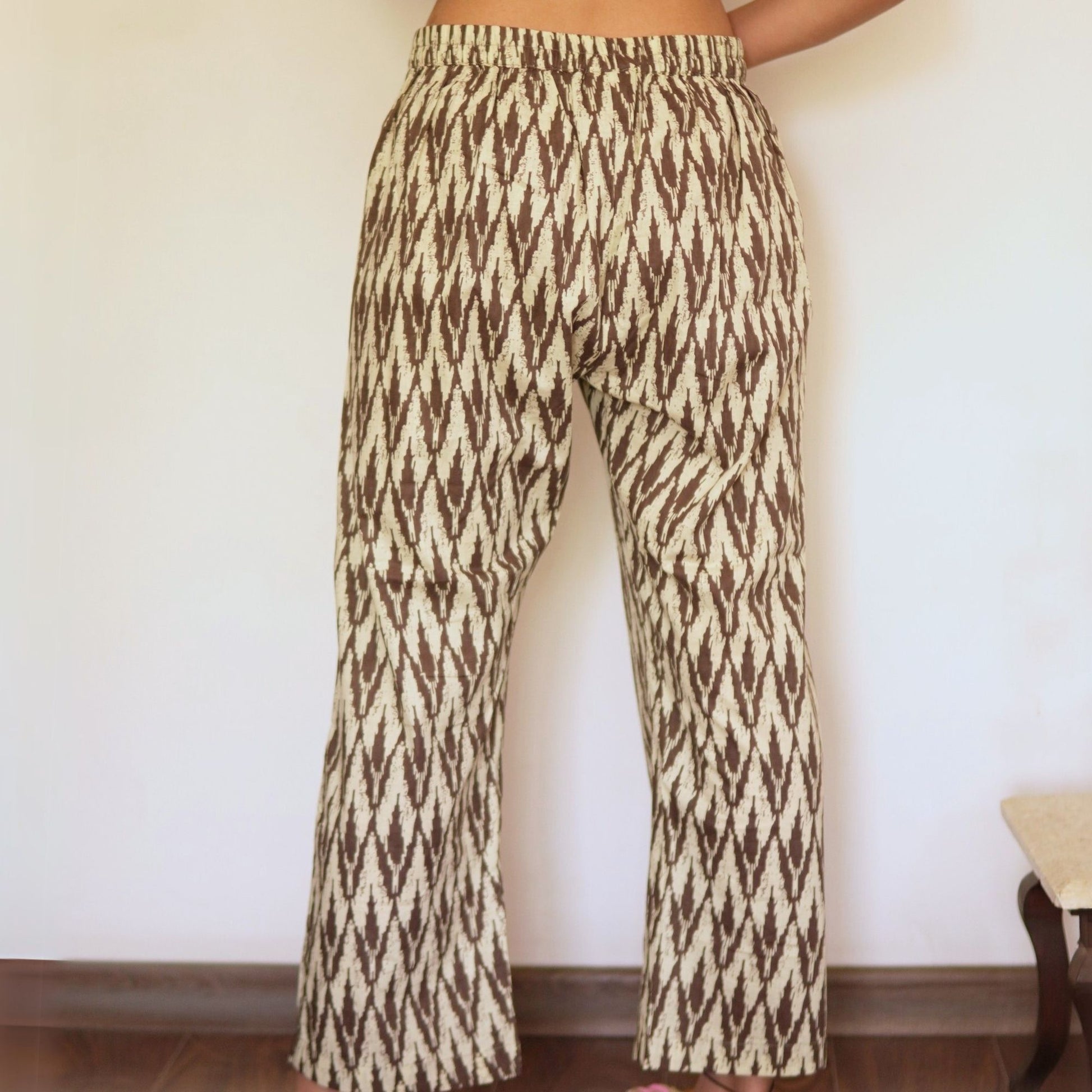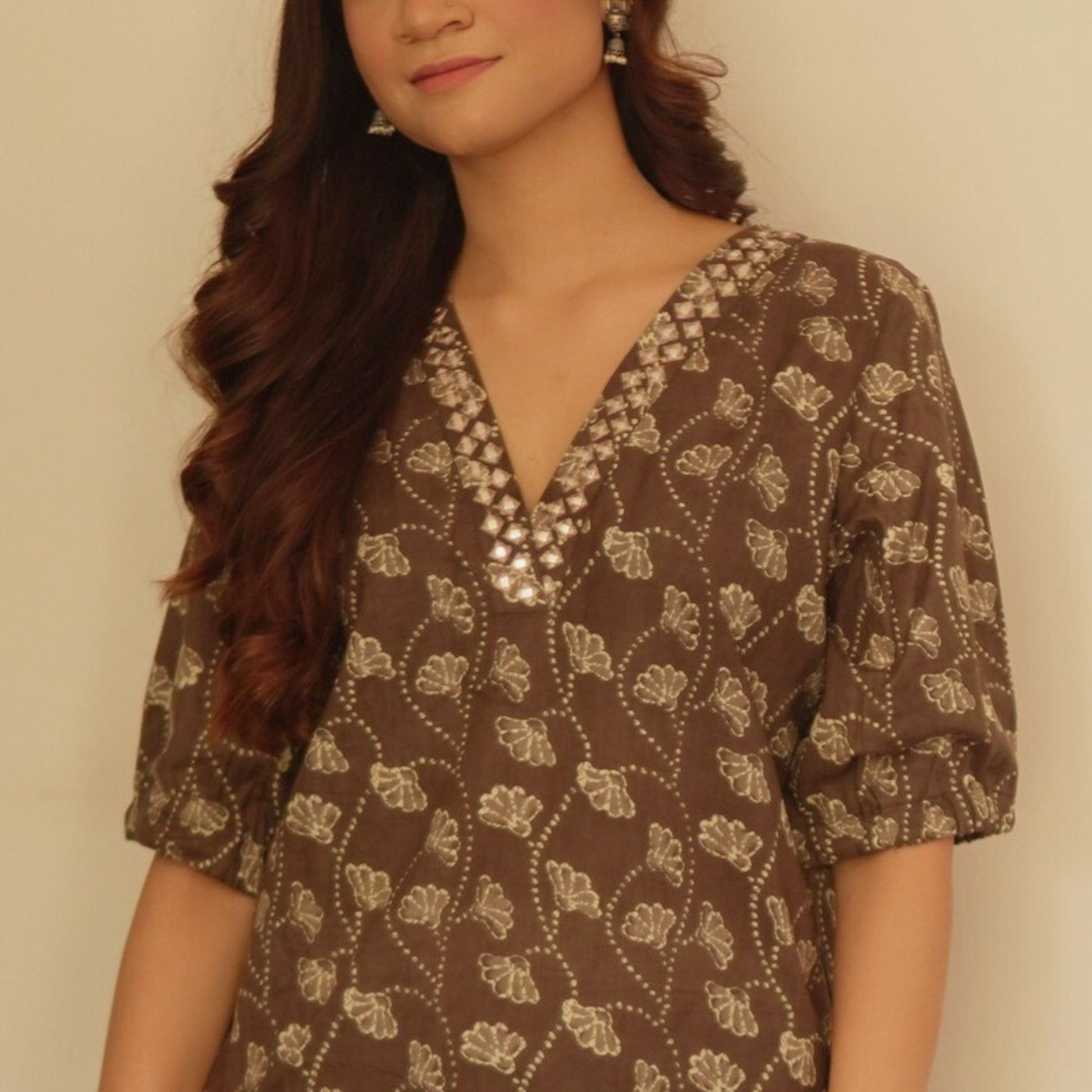 This breezy brown floral kurta features a V-neck with mirror detailing and puffed short sleeves with an elasticated band. Paired with matching cream and brown printed straight trousers, it’s a versatile pick for work or off-duty dressing.