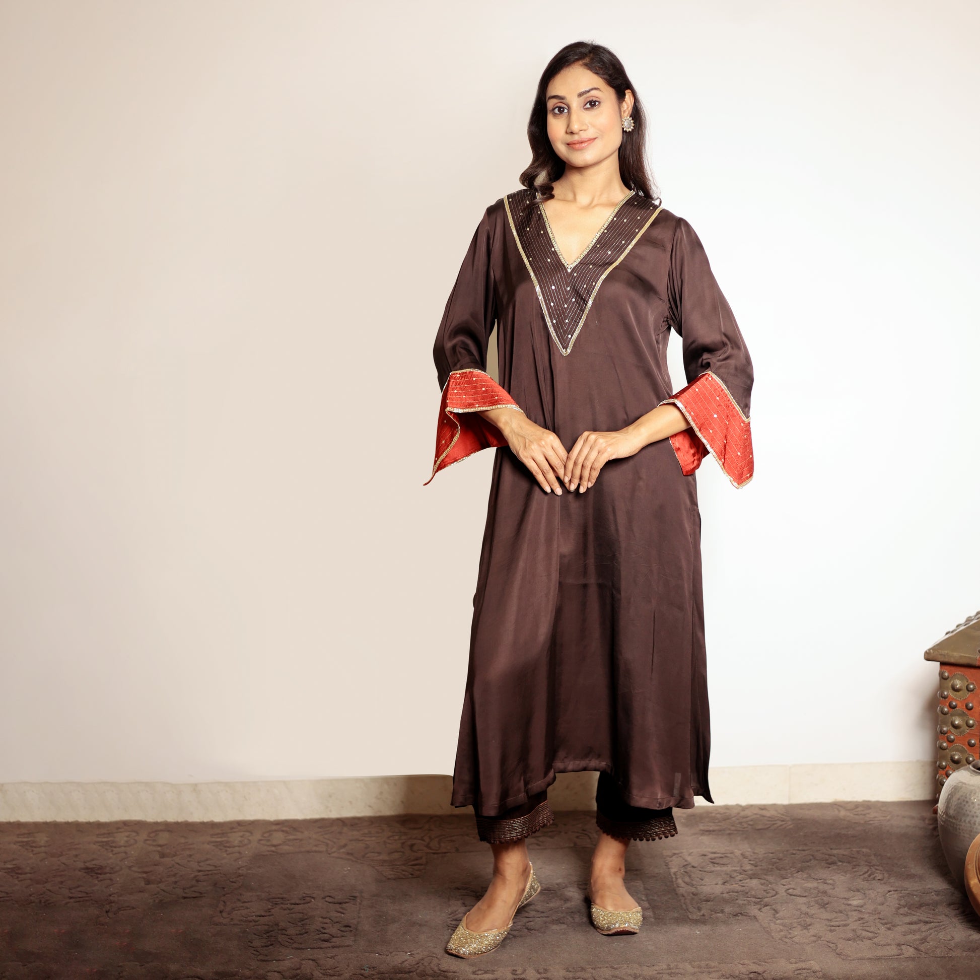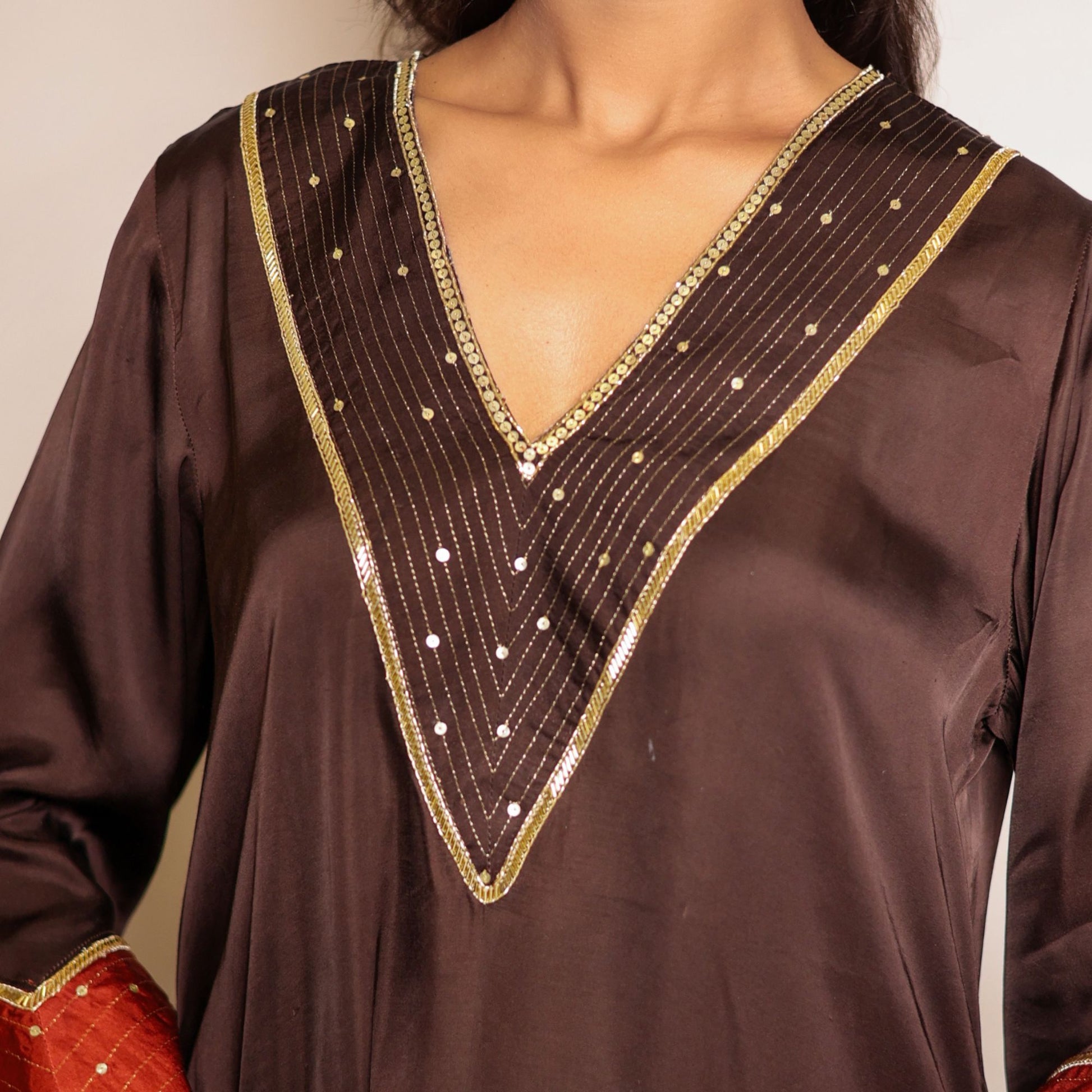 Brown hand embroidered V-neck kurta with Zari and sequin work in the sleeves. Perfect ensemble for winter celebrations