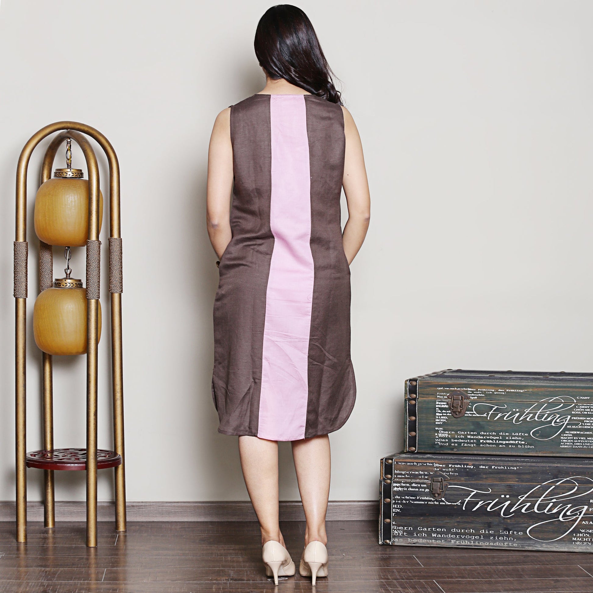 Introducing our brown and pink colour block knee-length linen dress featuring side slits Embrace the modern sophistication and make a statement wherever you go with this style.