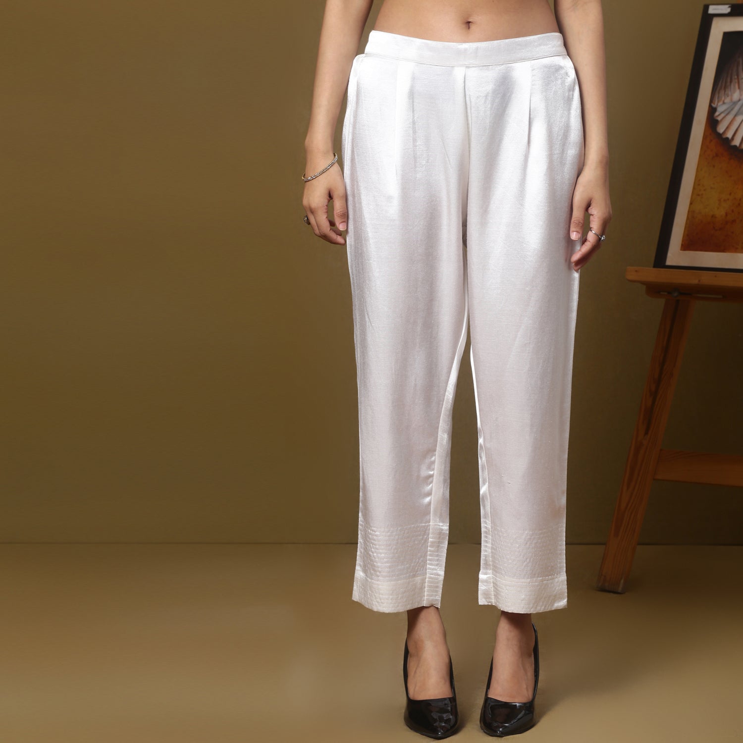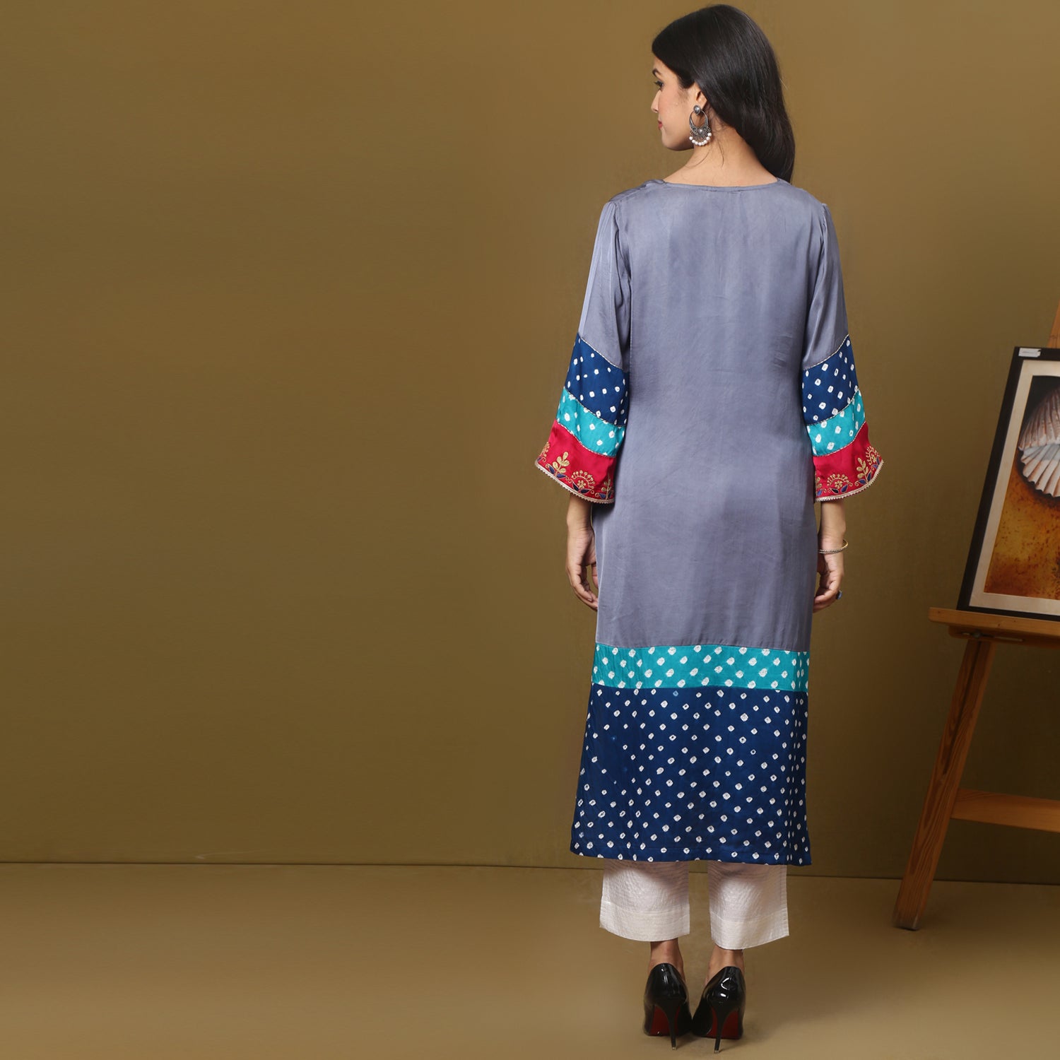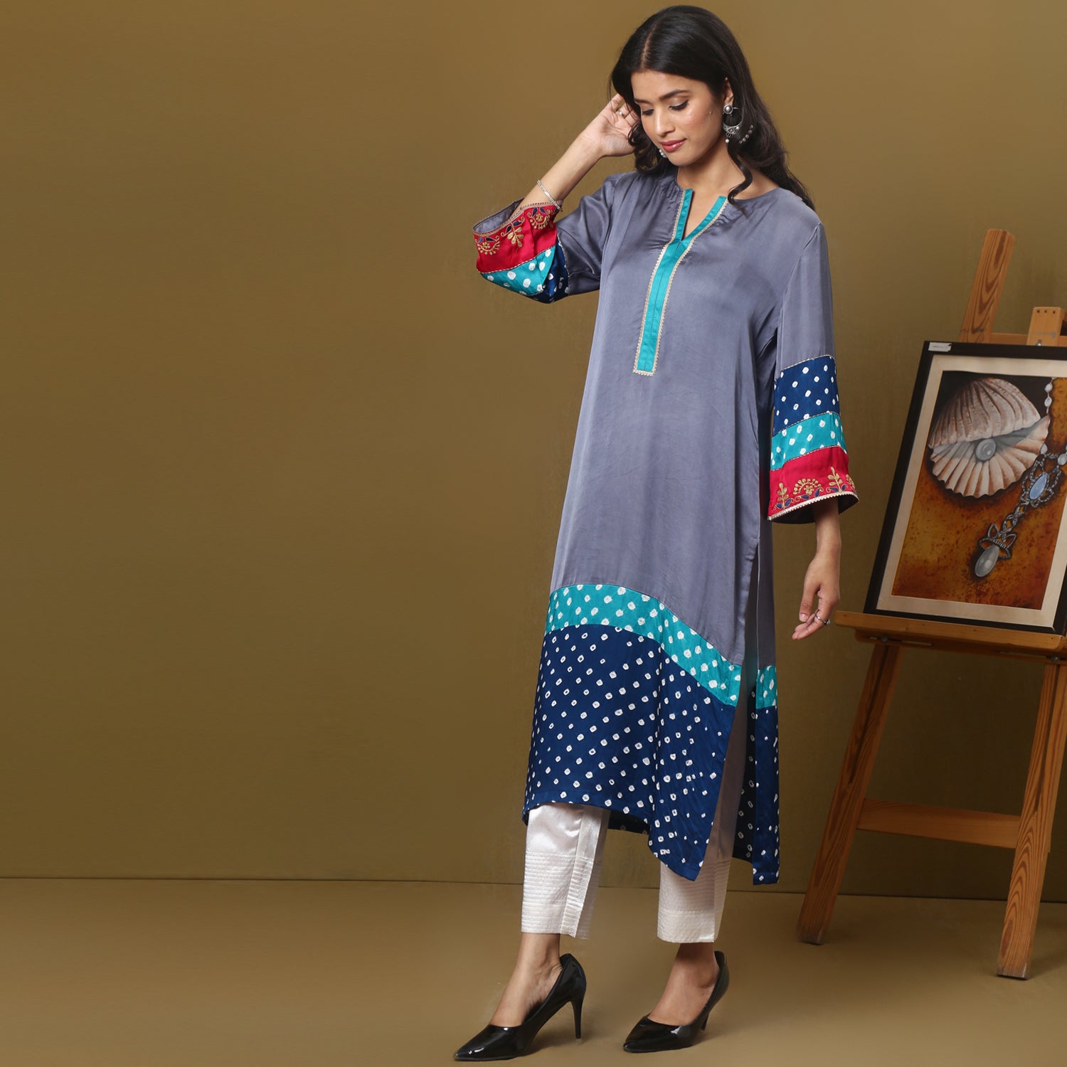 Color block blue and grey v-neck kurta with gota lace detailing on neck and embroidered sleeves. It is paired with white silk pants. A classic kurta set to add charm in any occasion.