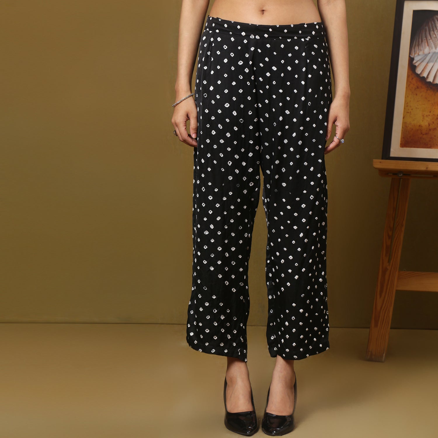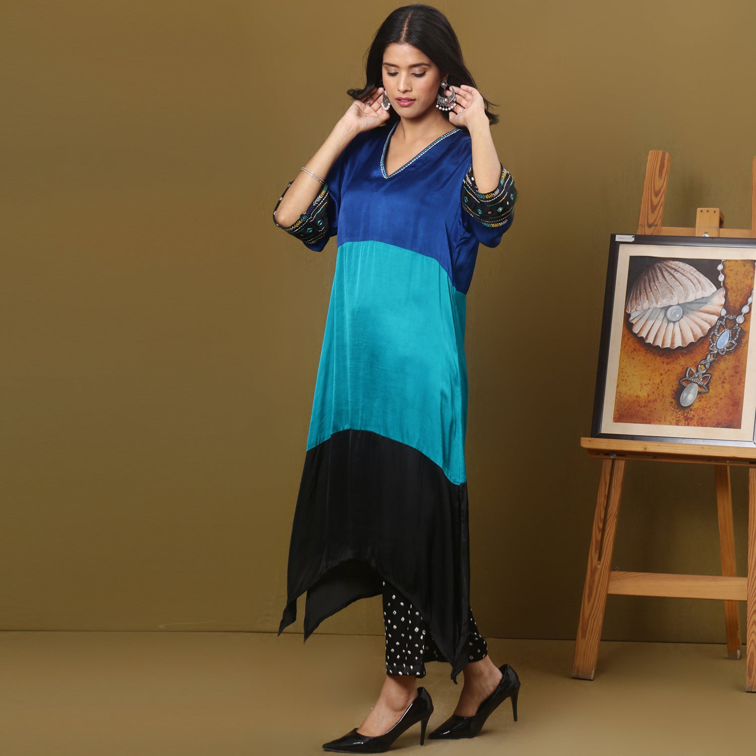 modal silk color block asymmetric V neck kurta with threadwork detailing on neck and mirrorwork detailing on sleeves . It is paired with black bandhani ankle pants. A chic kurta set to add glam to your evenings.