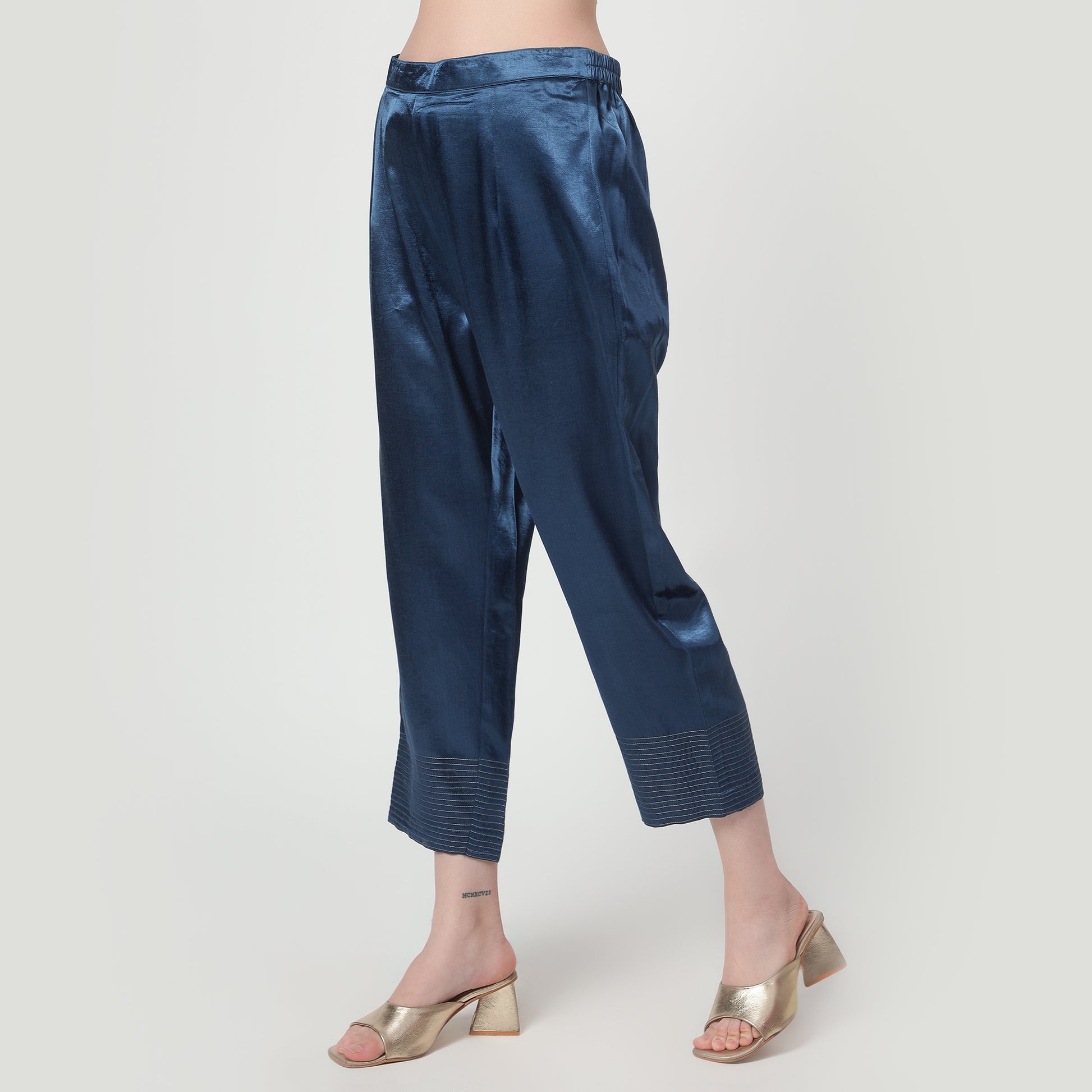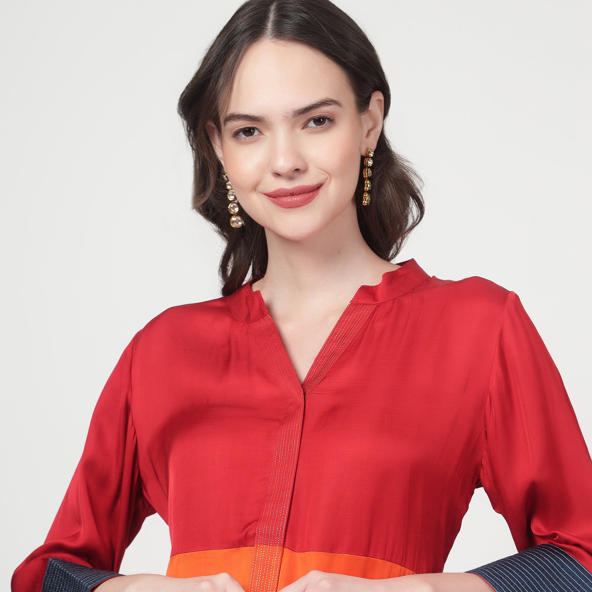 V-neck colour block modal silk high-low kurta with zari line detailing on neck and sleeves is paired with pants. It is a chic co-ord Set to add to your wardrobe.