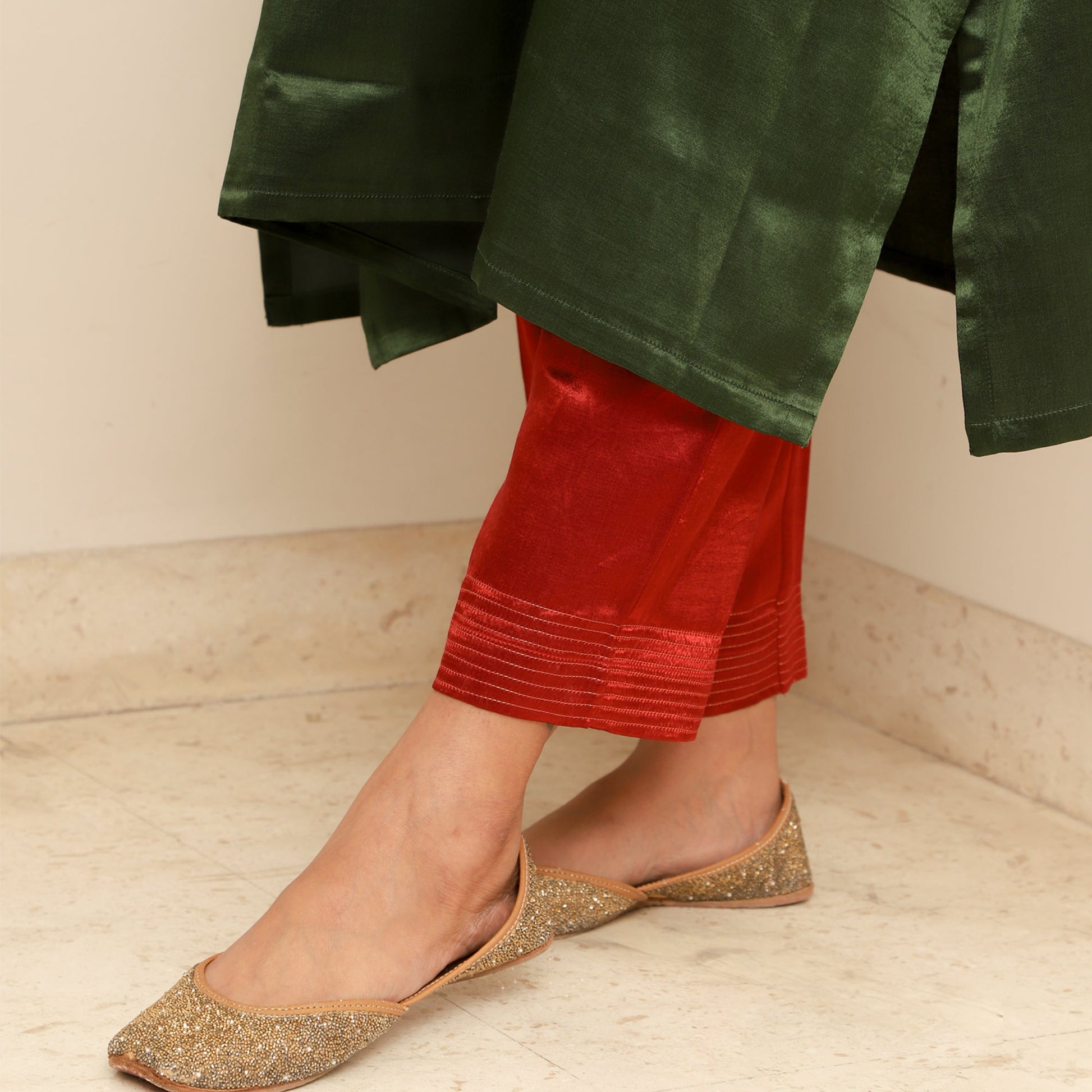 Colour block sage green and dark green jewel tone asymmetric kurta with embroidered sleeves and thread work detailing. It is paired with contrasting silk pants. A classic kurta set to add charm in any occasion.