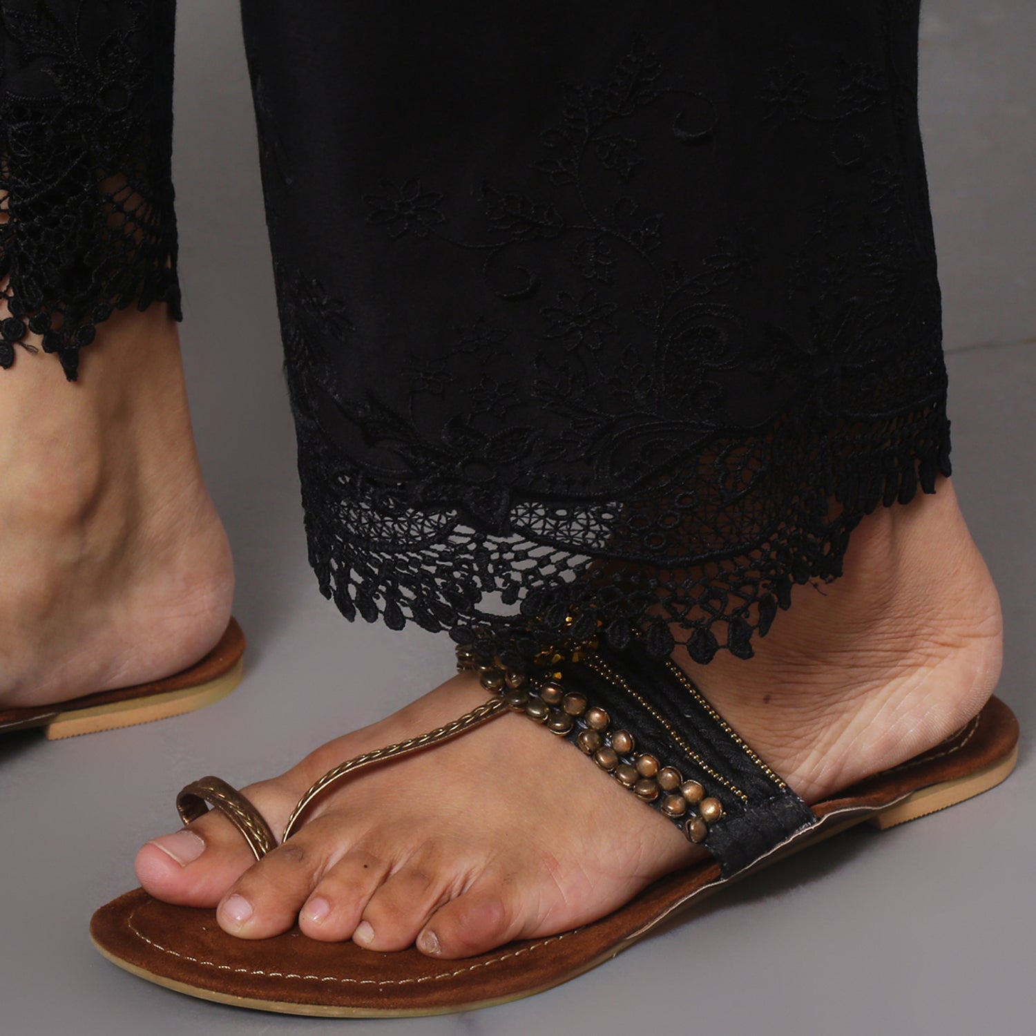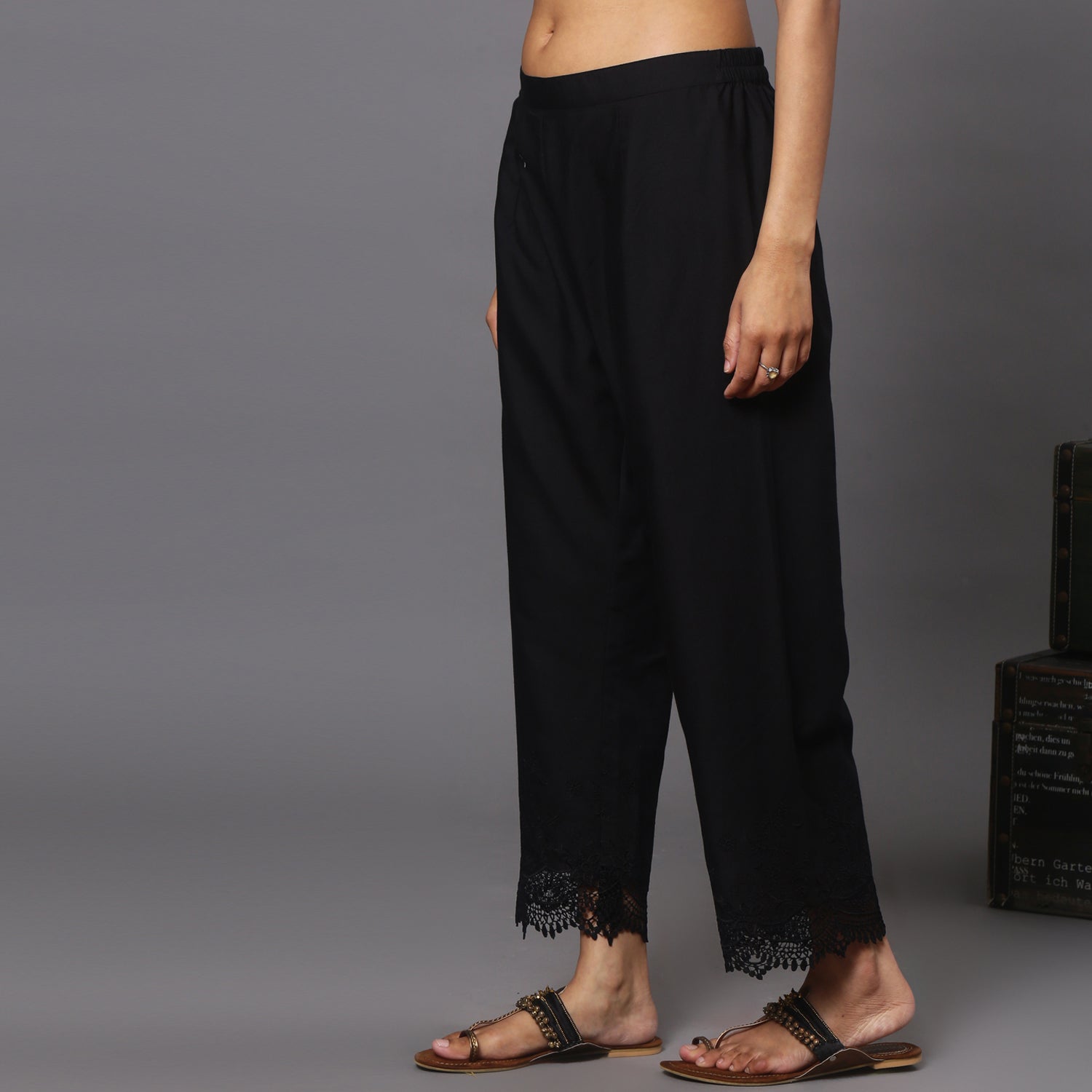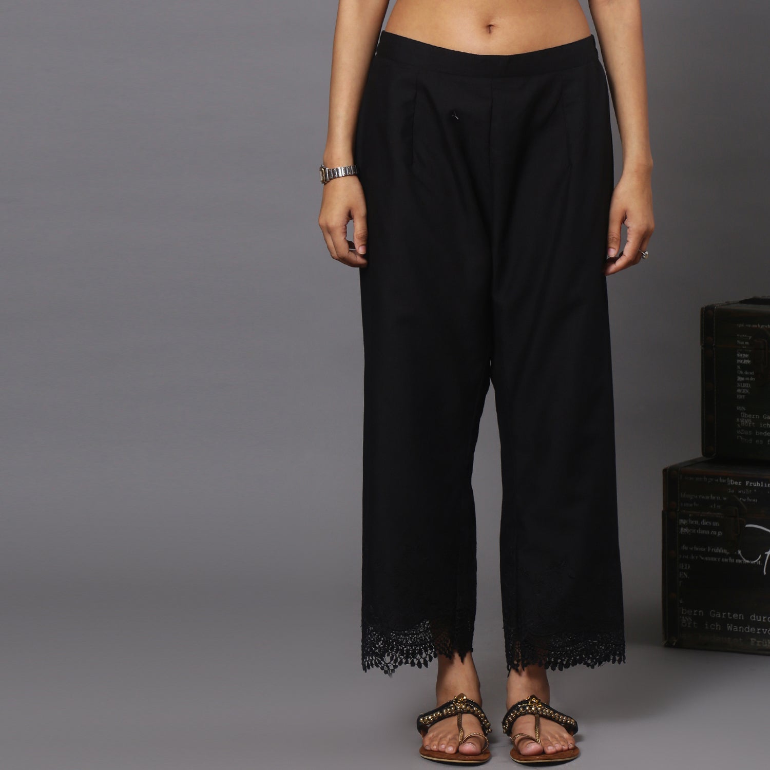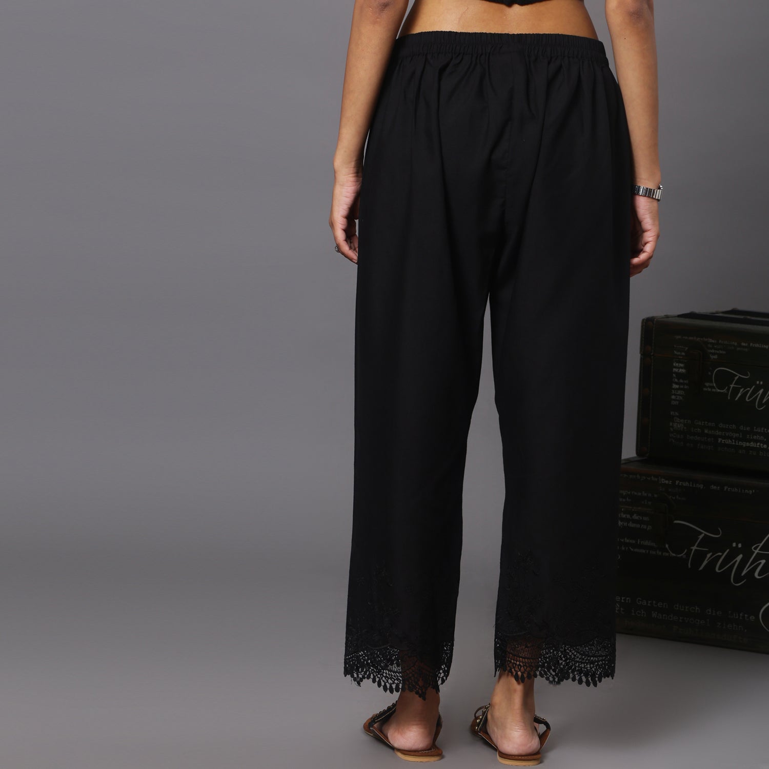 Black ankle length cotton pants in white lace and cutwork fabric and threadwork detailing at the bottom. A summer classic which will pair well with all your printed kurtas.
