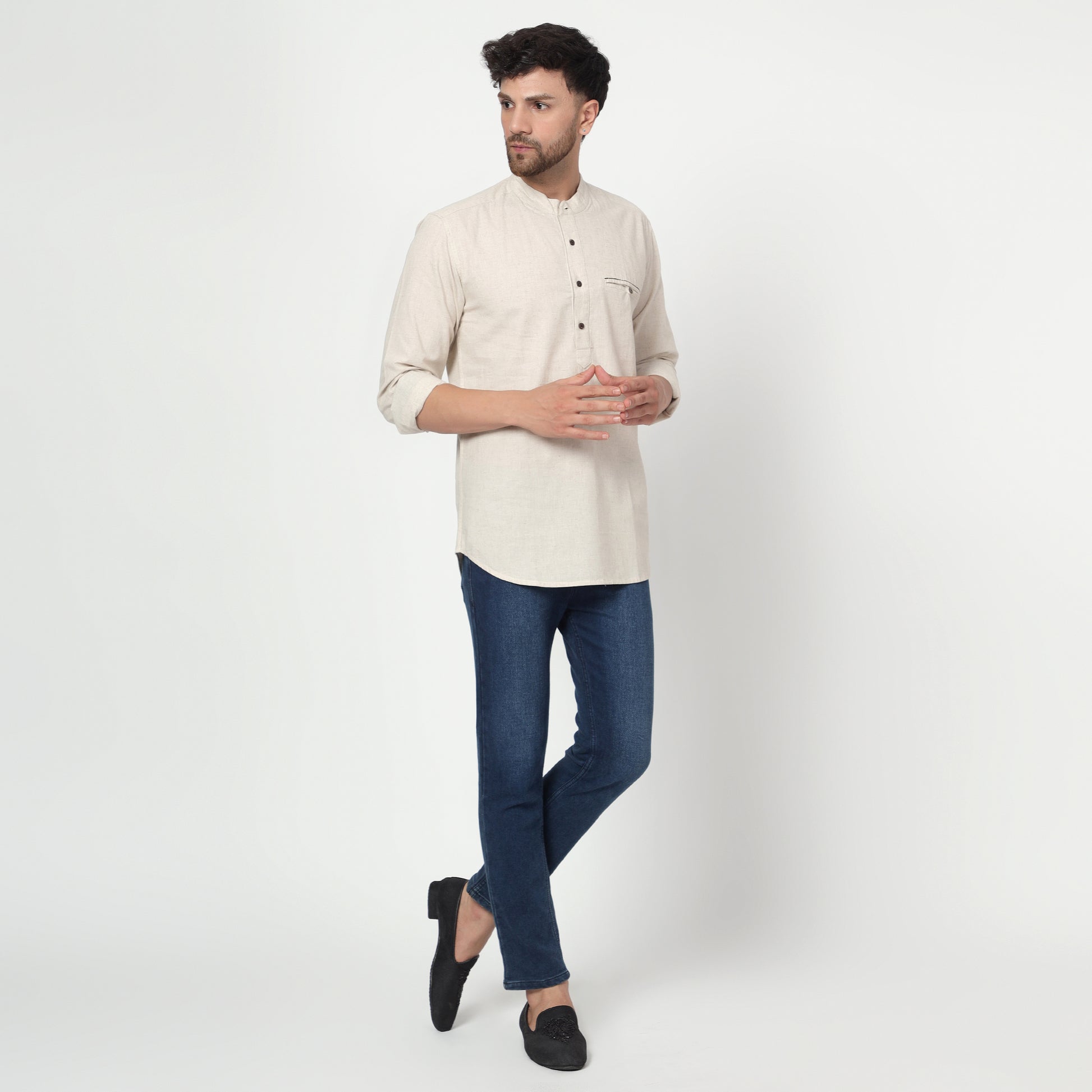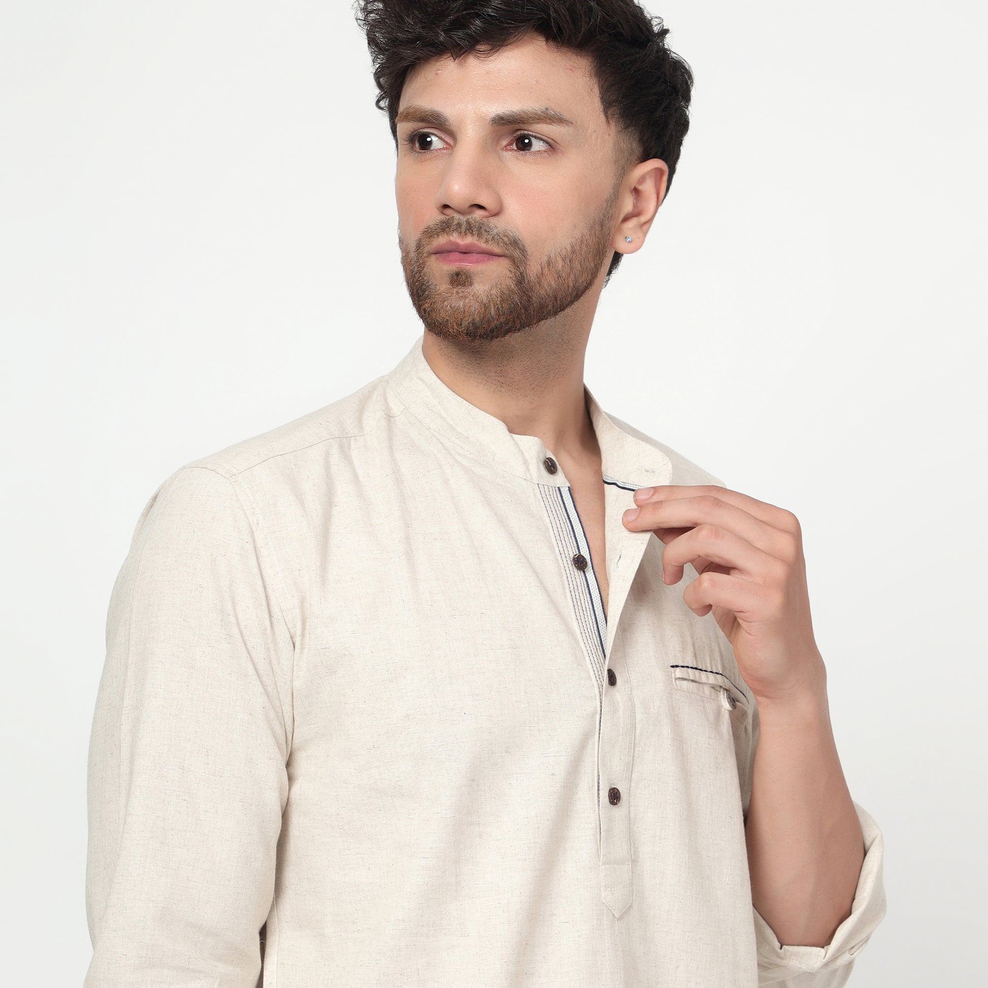 Ecru cotton linen Full-sleeves band collar kurta shirt in comfort fit. This comfortable yet stylish shirt is perfect for lazy weekend brunches or relaxed evenings.