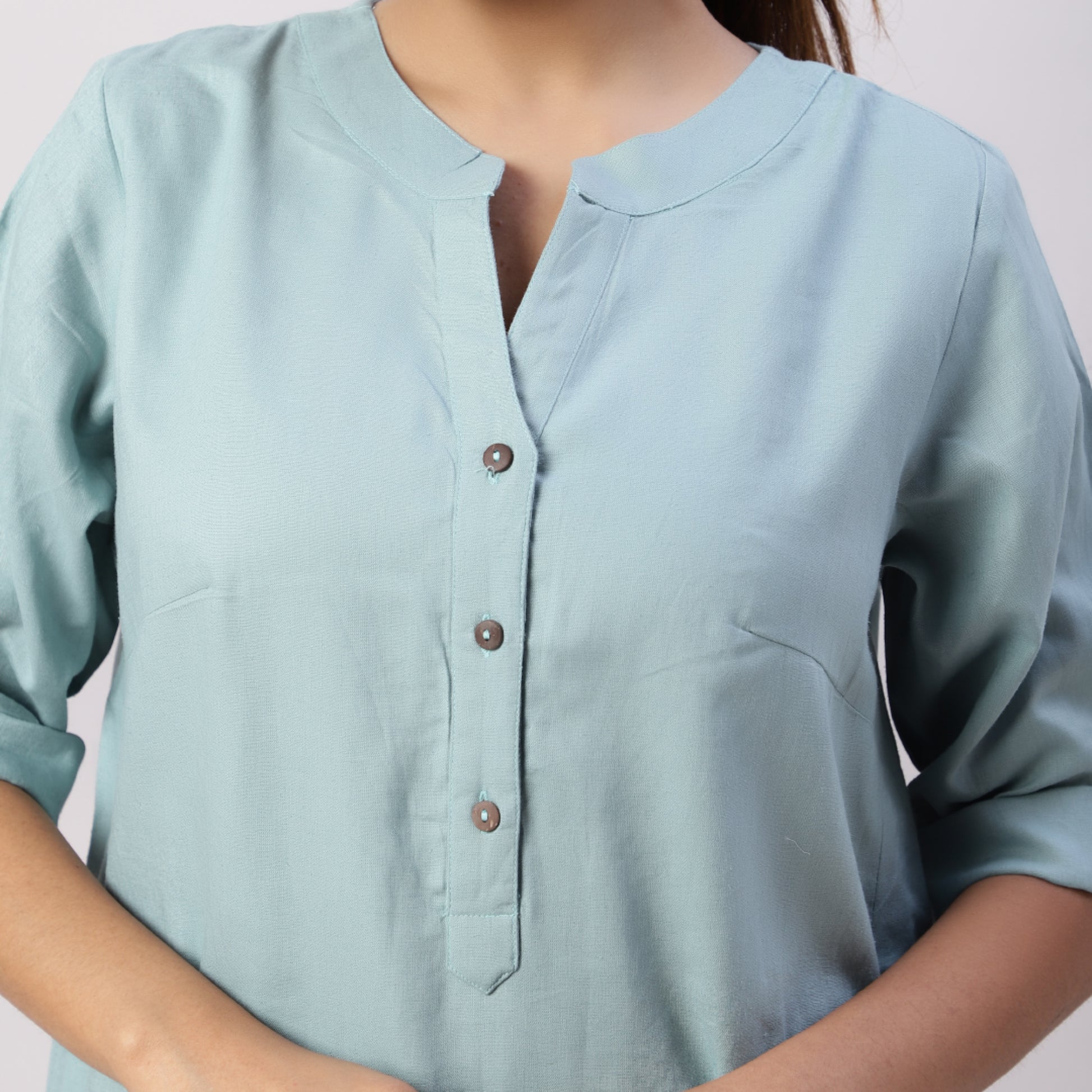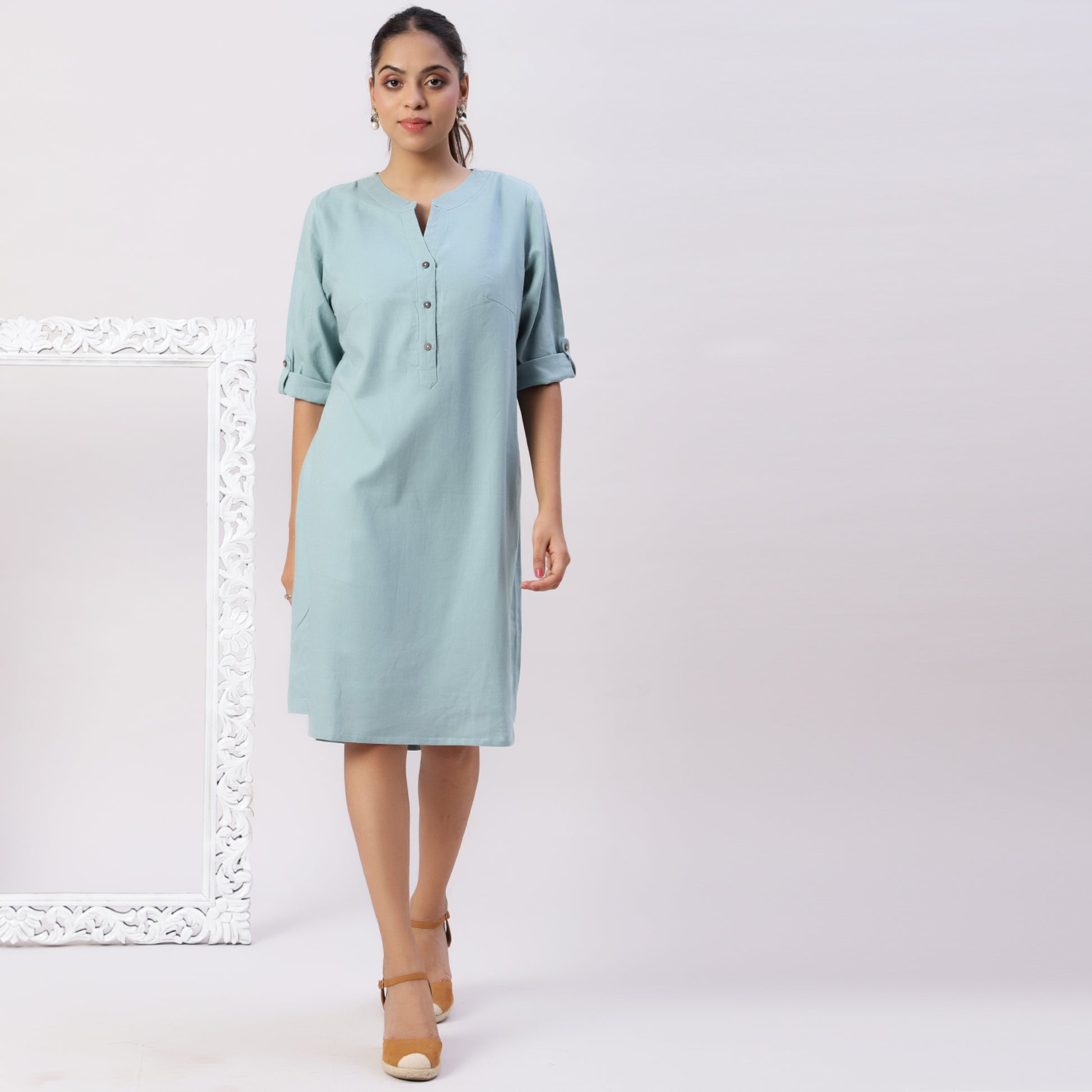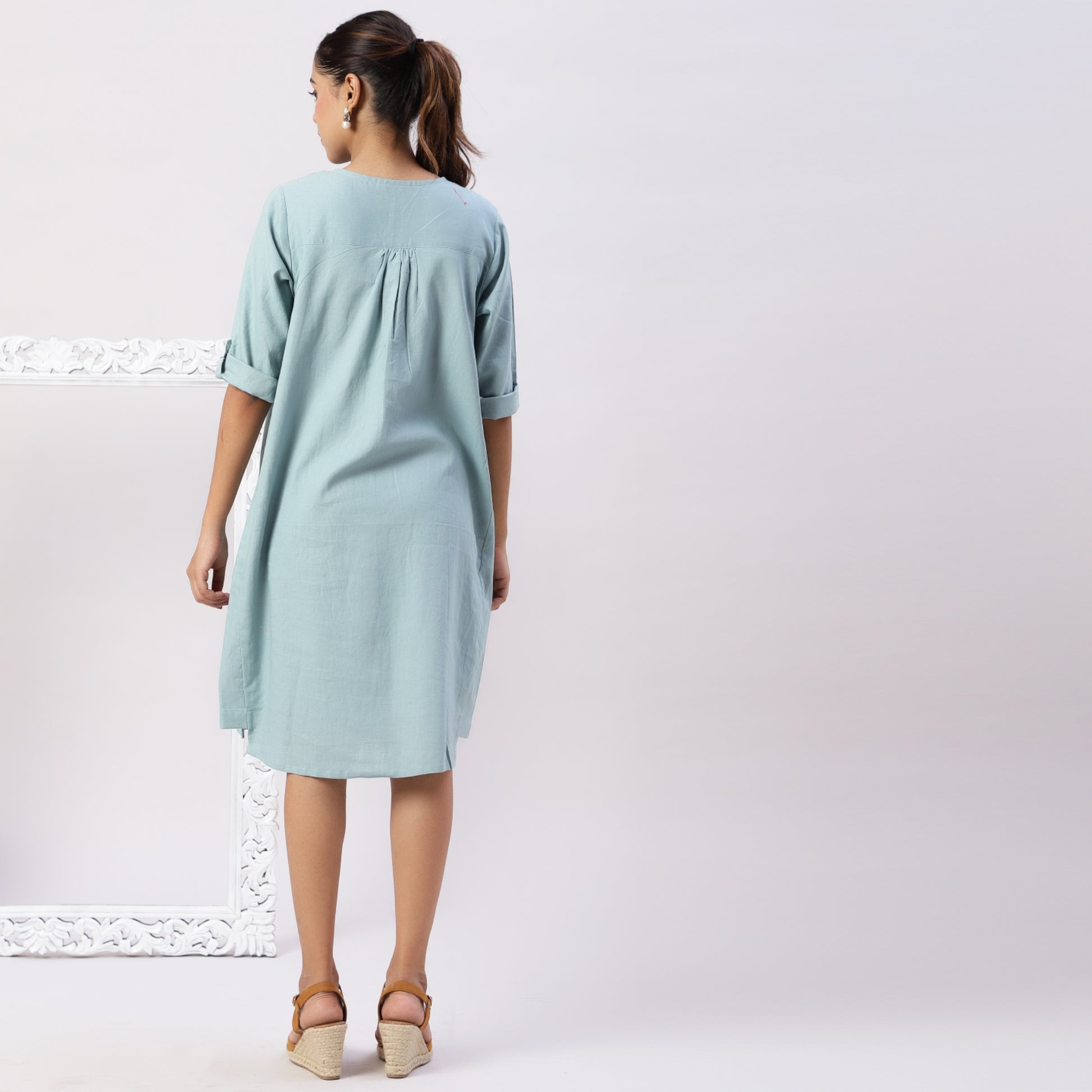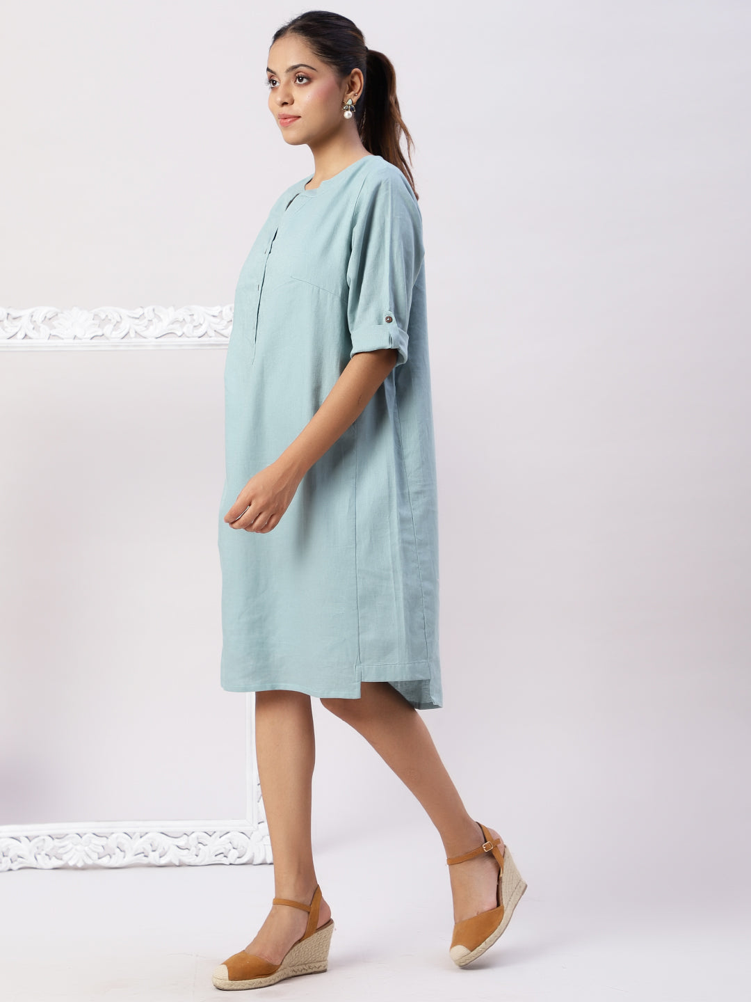 Straight cut panel dress in solid cotton linen with fine lining and turn up sleeves. The beautiful aqua color makes it a perfect choice for breezy summer days.
