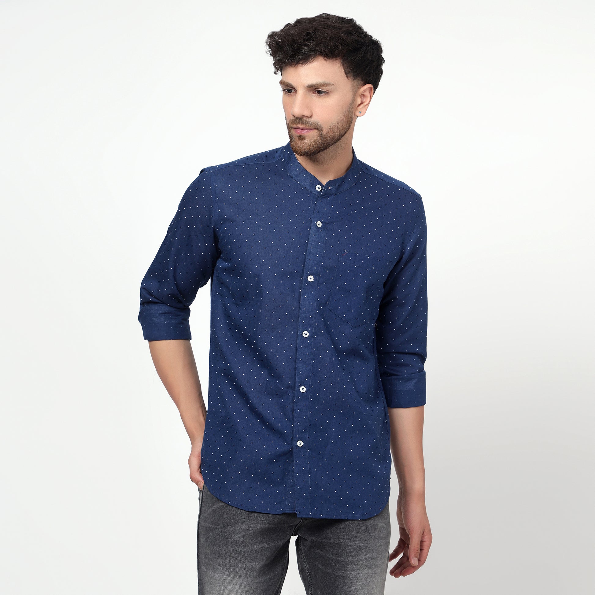 Blue Printed cotton linen Full-sleeves band collar shirt in comfort fit. This comfortable yet stylish shirt is perfect for lazy weekend brunches or relaxed evenings.