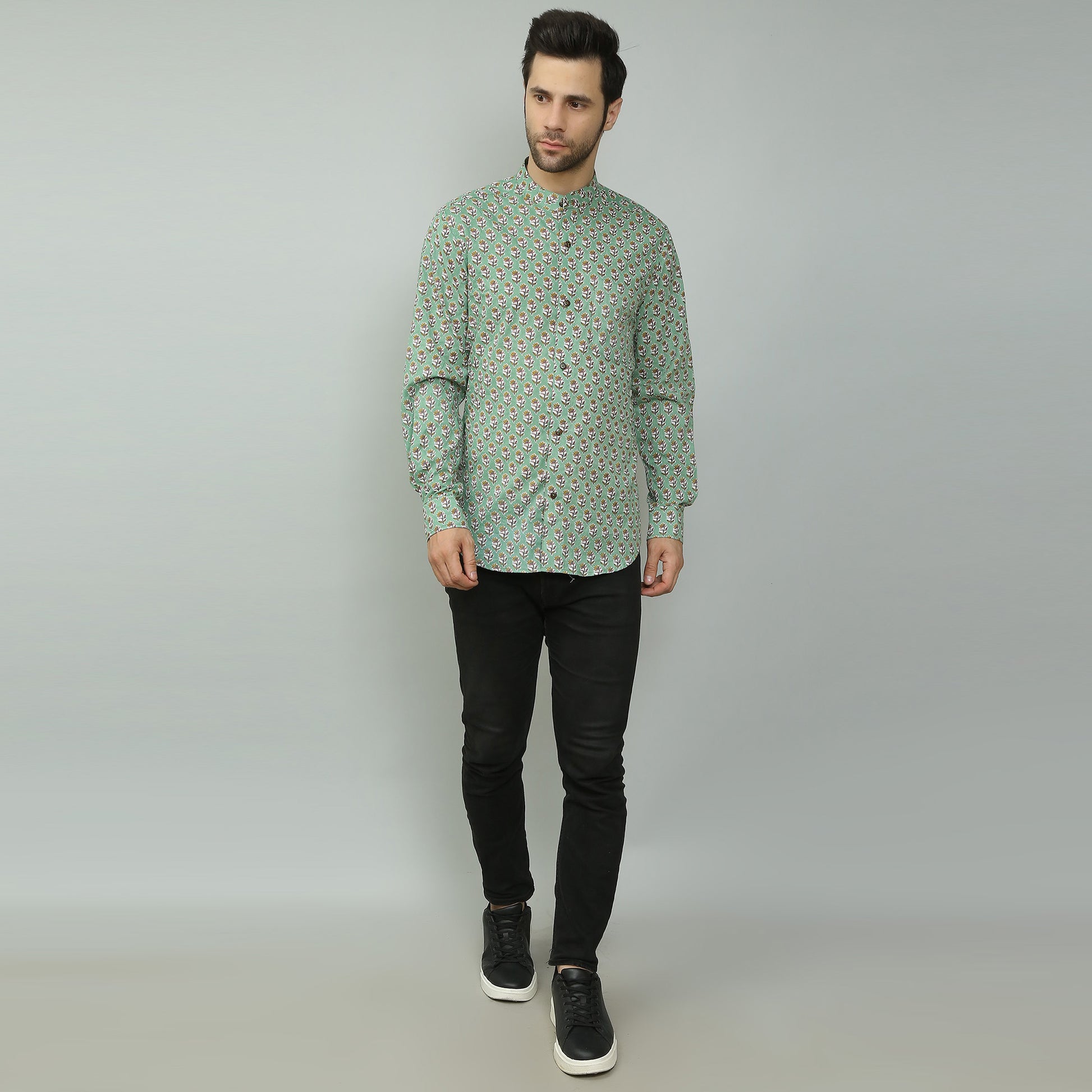 Printed pure cotton full-sleeves band collar shirt in comfort fit. These comfortable yet stylish shirts are perfect for lazy weekend brunches or relaxed evenings.