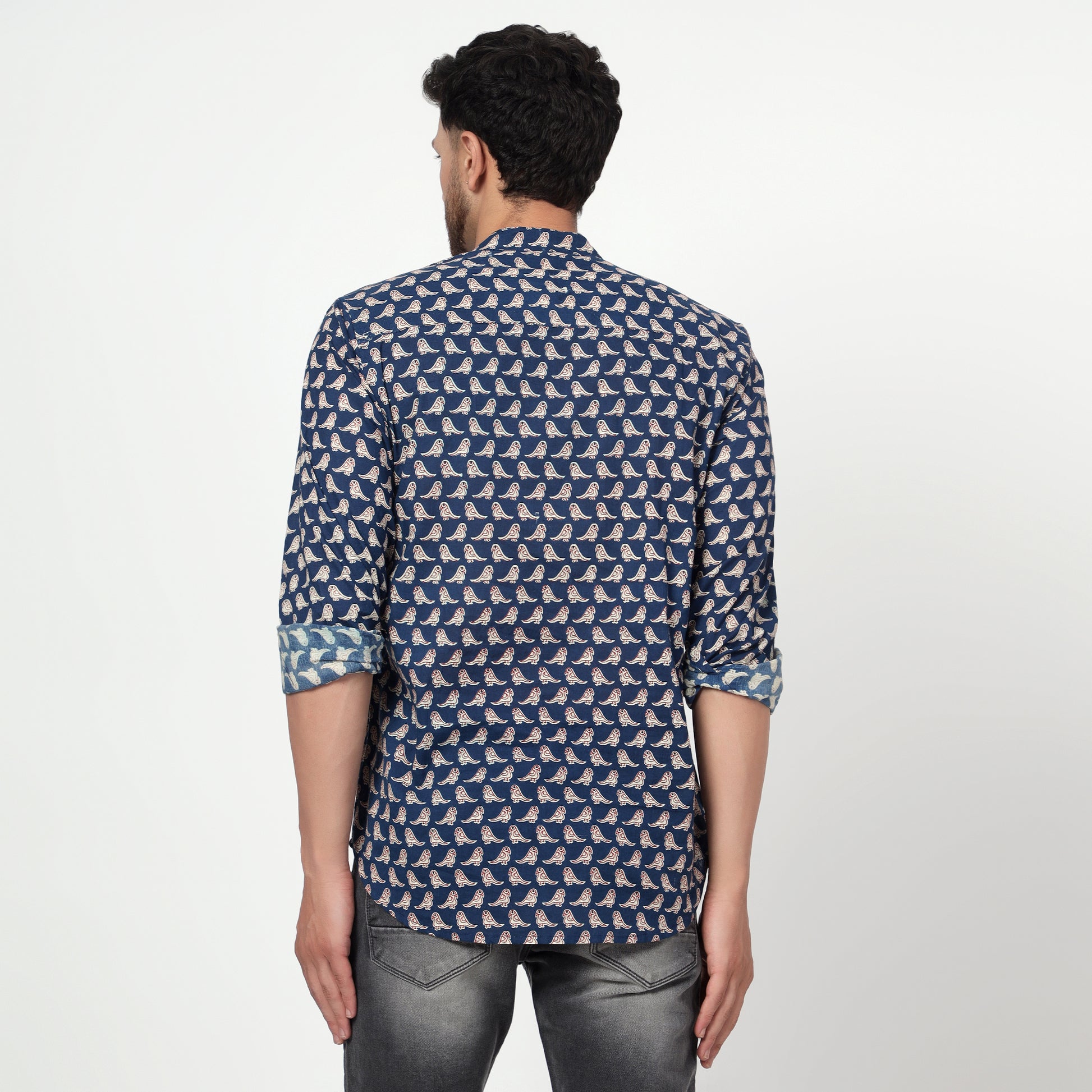 Blue Printed pure cotton Full-sleeves band collar kurta shirt in comfort fit. This comfortable yet stylish shirt is perfect for lazy weekend brunches or relaxed evenings.