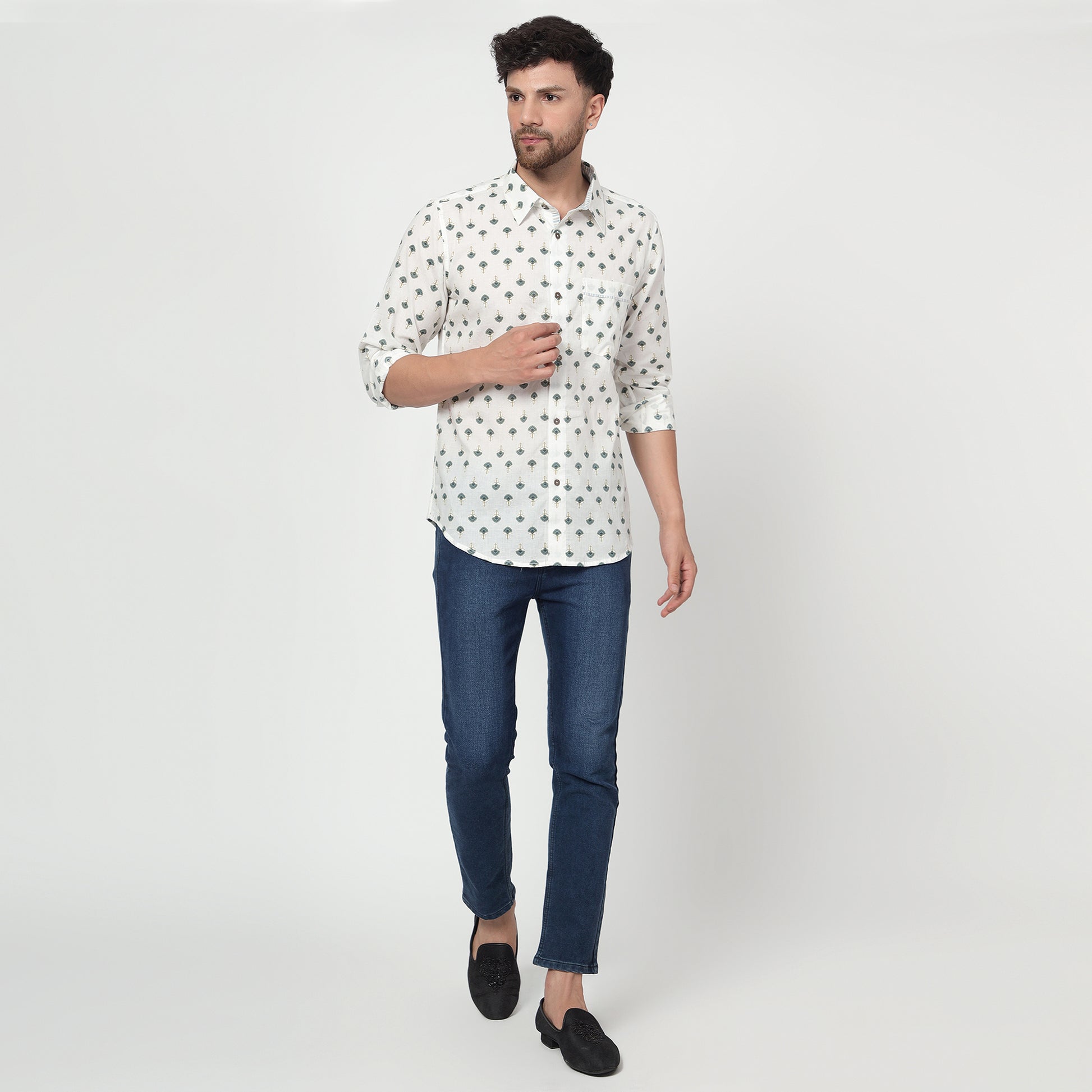 White Printed pure cotton Full-sleeves regular collar shirt in comfort fit. This comfortable yet stylish shirt is perfect for lazy weekend brunches or relaxed evenings.