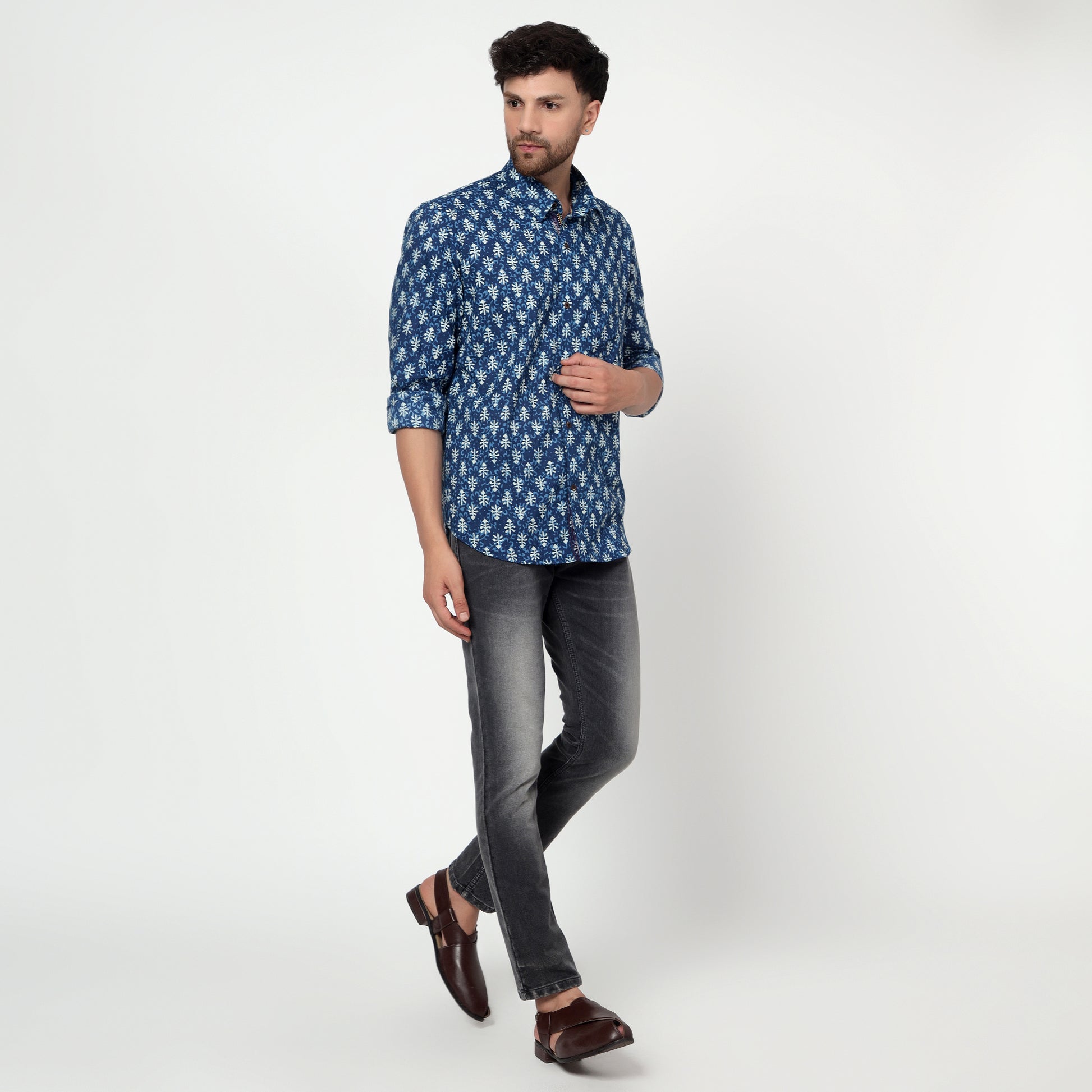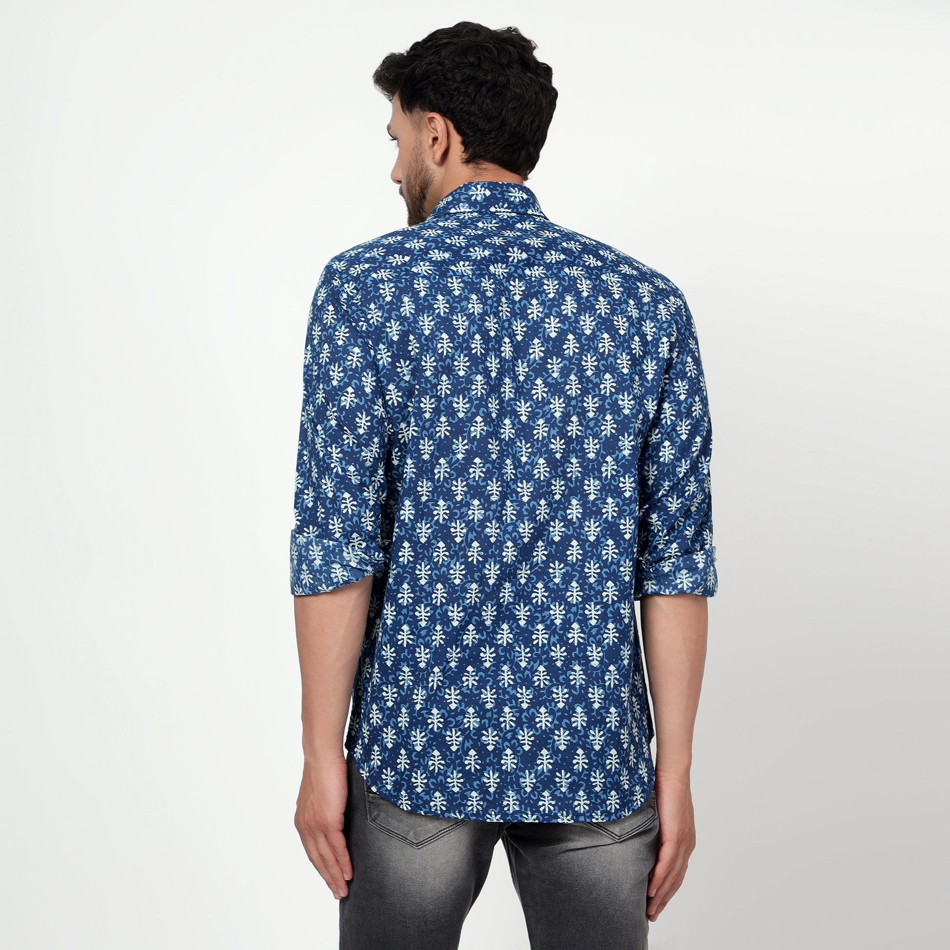 Blue Printed pure cotton Full-sleeves regular collar shirt in comfort fit. This comfortable yet stylish shirt is perfect for lazy weekend brunches or relaxed evenings.