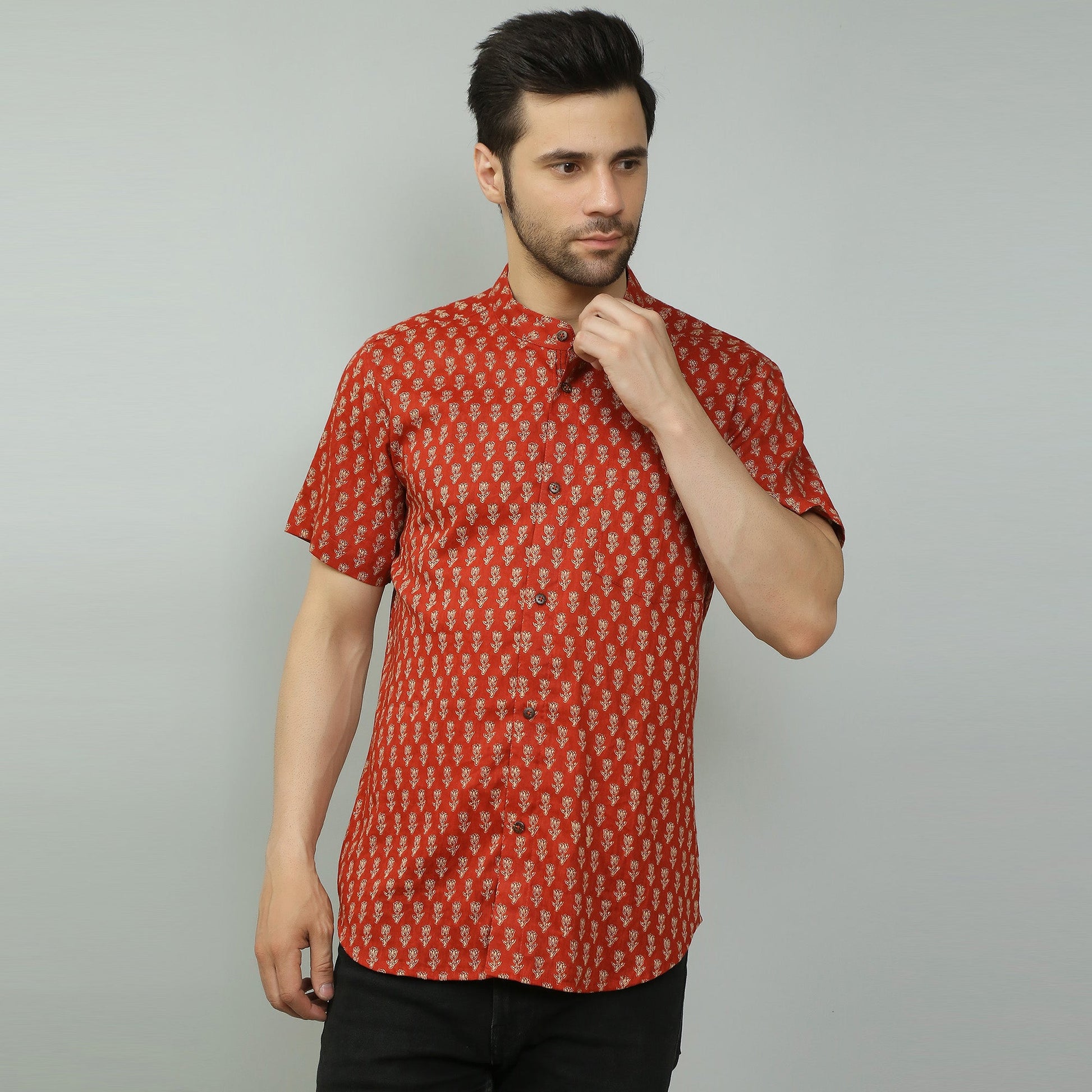Printed pure cotton half-sleeves band collar shirt in comfort fit. These comfortable yet stylish shirts are perfect for lazy weekend brunches or relaxed evenings.