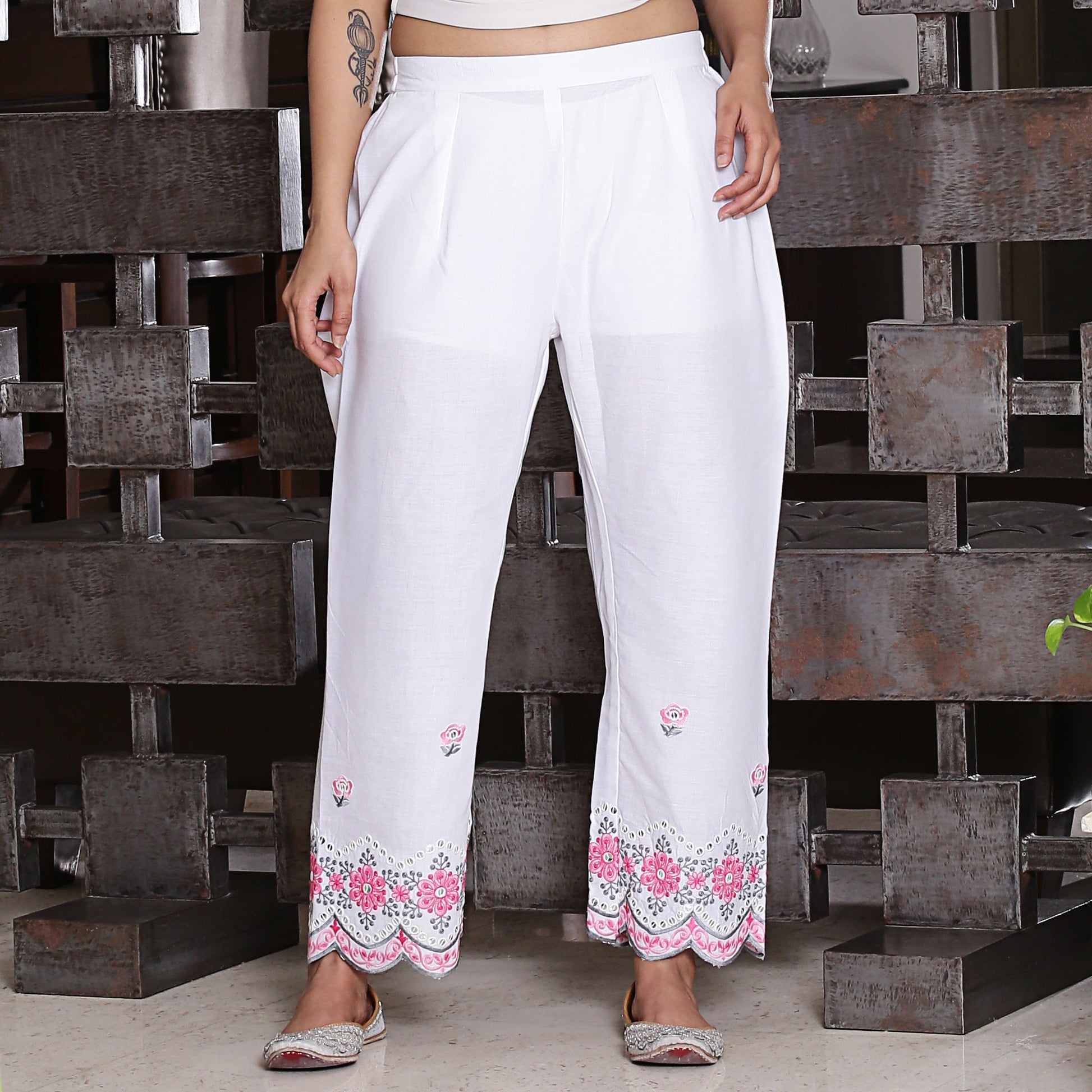 white ankle length cotton scallop pants with pink and grey floral embroidery. A summer classic which will pair well with all your printed kurtas.