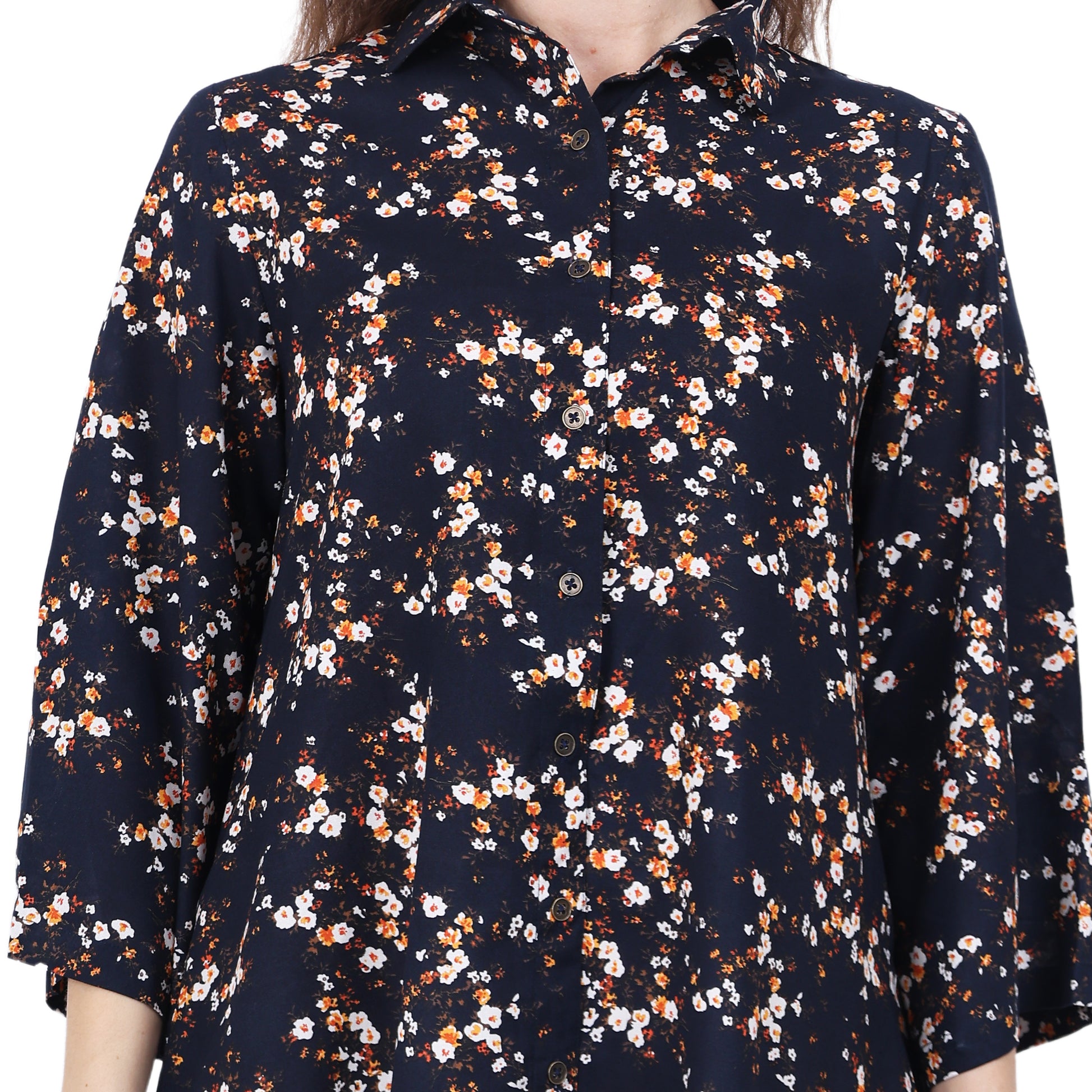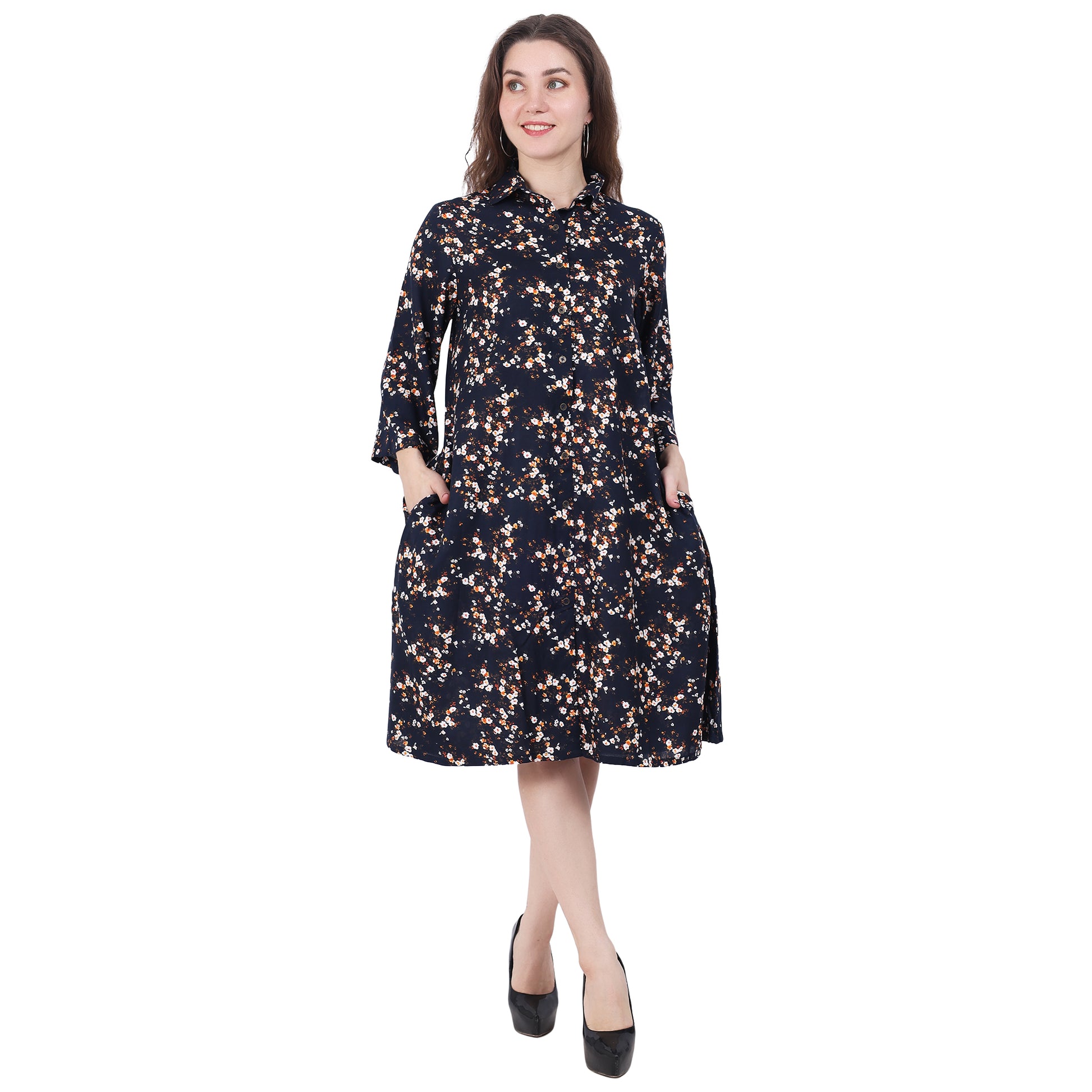 Collared navy blue 3/4 sleeves floral printed knee-length dress with pockets.Perfect for women who want to stay comfortable and stylish during the warm weather.